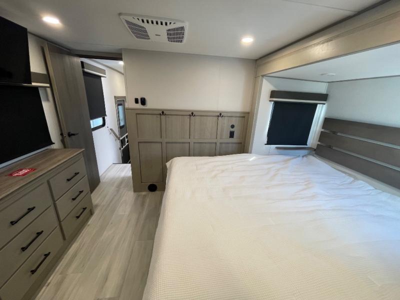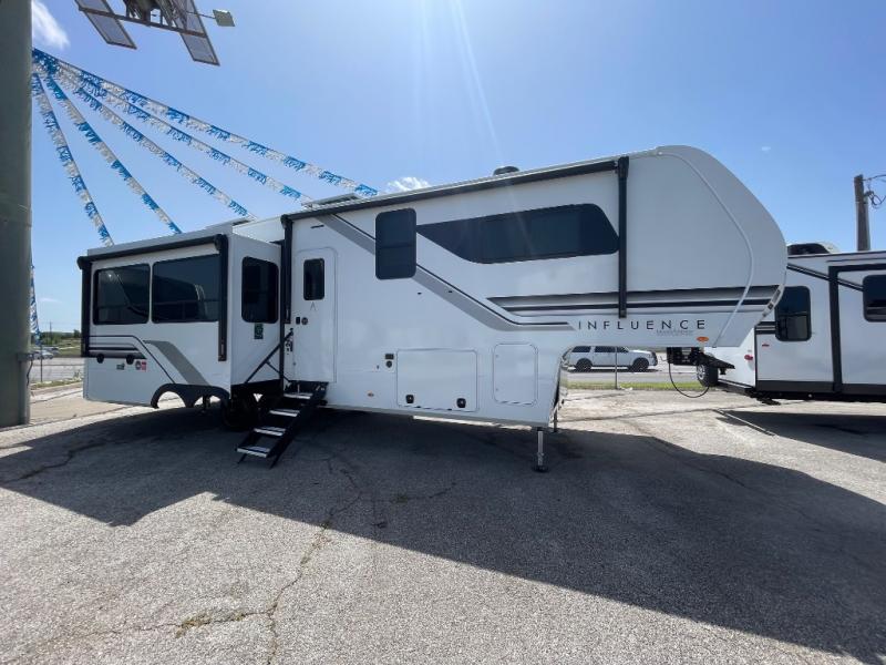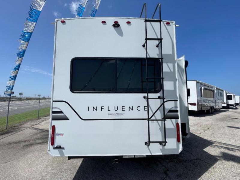 Any Grand Design Influence fifth wheel features five-sided aluminum cage construction with a walk-on roof and a fully enclosed underbelly with heated tanks and storage for all weather camping. For peace of mind, the MORryde CRE3000 Suspension system will provide safe and smooth towing, and the 101" widebody construction offers all the room you need and that is before multiple slides are fully engaged. You will appreciate the Keyed-Alike locks, slam-latch baggage doors with magnetic door catches, exterior security light, and SolidStep entry steps. On the inside, Congoleum flooring, premium roller shades for privacy, a hallway handrail for safety, and nightstands with USB ports to keep all of your electronics fully charged. You will also love the On Demand tankless water heater when showering, plus the added heat and ambiance from an electric fireplace, and so much more!