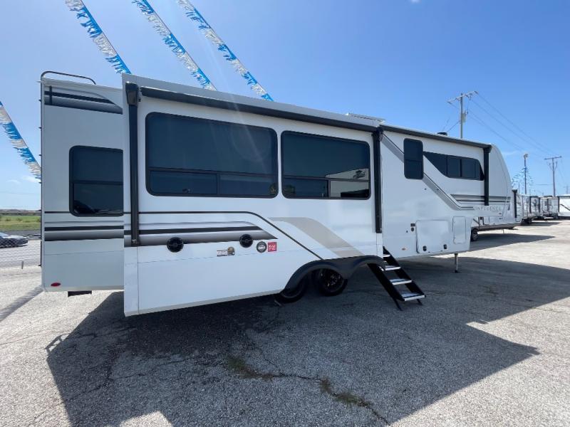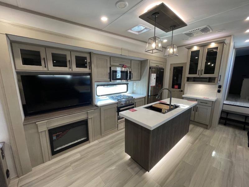A perfect fifth wheel featuring triple slides and a tri-fold sofa for overnight guests! You will love the spacious interior thanks to the dual opposing slides in the main living and kitchen area. Here you will find a kitchen island in the center and plenty of seating with a free standing dinette, theater seating for movie night opposite the fireplace and entertainment center, as well as a tri-fold sofa. The kitchen offers all of the amenities just like home, a 16 cu. ft. 12-volt refrigerator for your perishables, and a hutch with an electronics drawer to keep your gadgets organized. There is even a pet dish under the refrigerator for your furry friends. The spacious full bath includes a 48" x 30" shower, dual linen closets, and an accessory drawer for necessities. You'll love the front bedroom with its queen bed slide out, slide top dresser, front wardrobe with washer and dryer prep, plus a pass-thru clothes hamper between the bedroom and bath; how convenient!