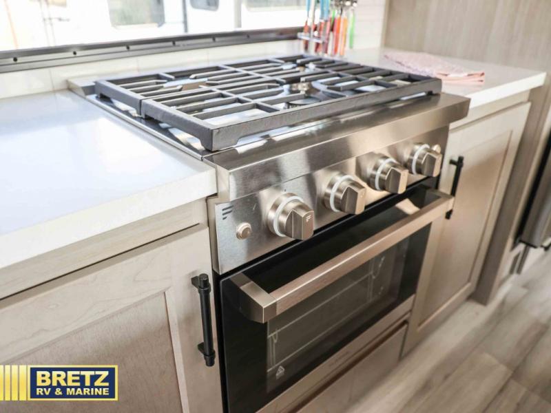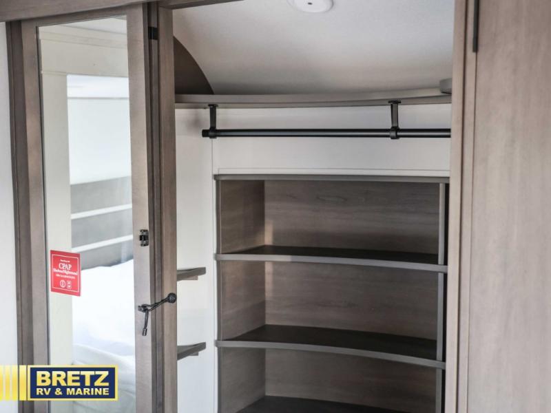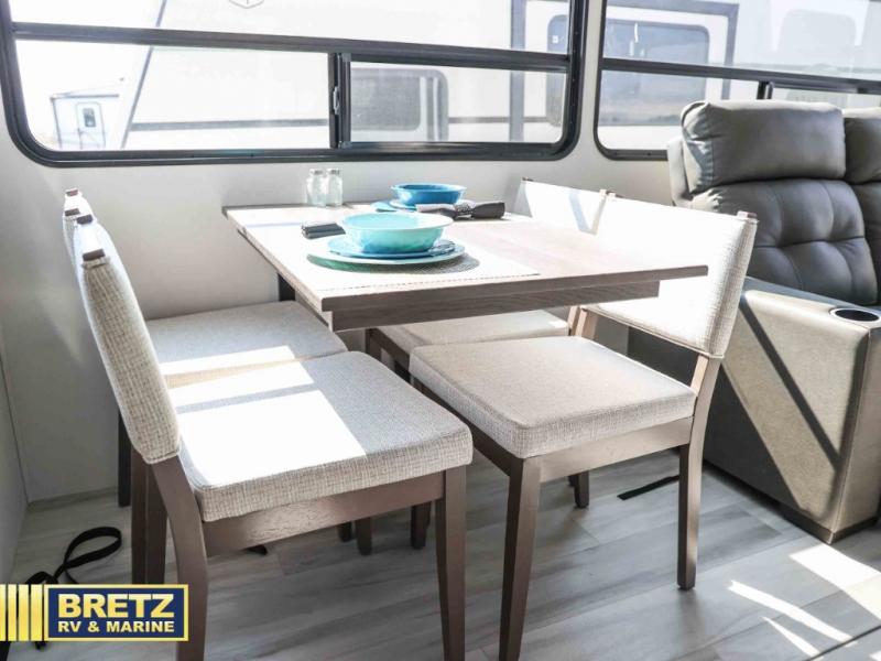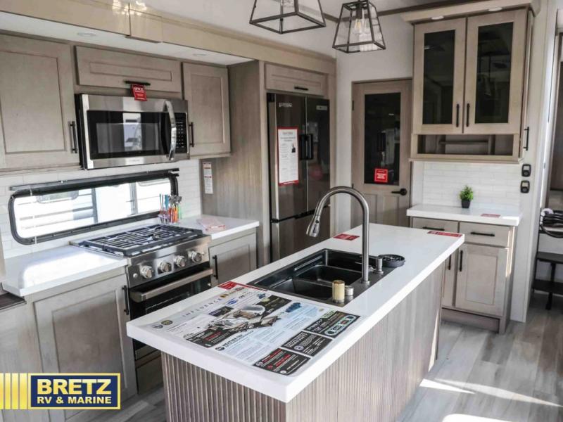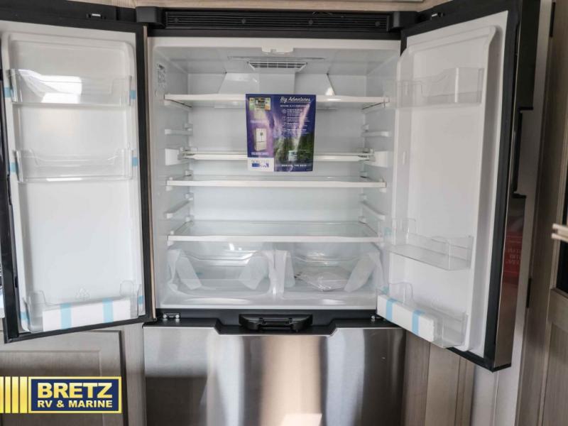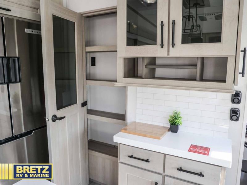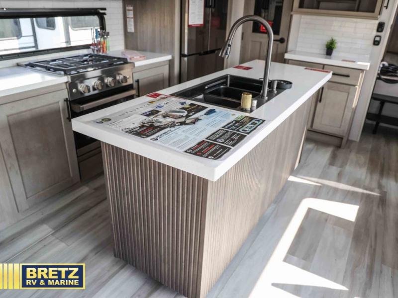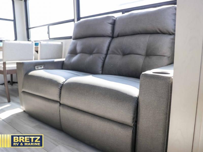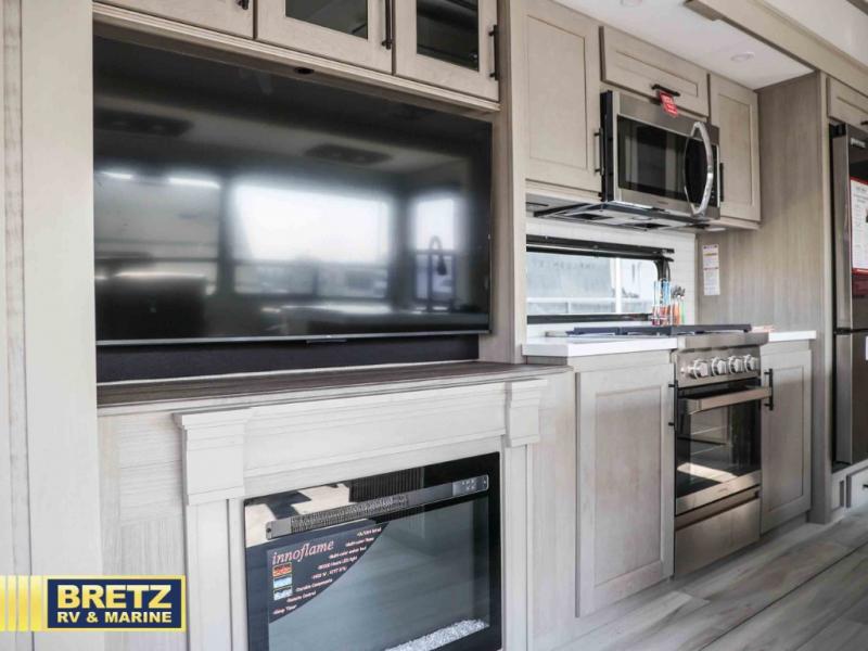 A perfect fifth wheel featuring triple slides and a tri-fold sofa for overnight guests! You will love the spacious interior thanks to the dual opposing slides in the main living and kitchen area. Here you will find a kitchen island in the center and plenty of seating with a free standing dinette, theater seating for movie night opposite the fireplace and entertainment center, as well as a tri-fold sofa. The kitchen offers all of the amenities just like home, a 16 cu. ft. 12-volt refrigerator for your perishables, and a hutch with an electronics drawer to keep your gadgets organized. There is even a pet dish under the refrigerator for your furry friends. The spacious full bath includes a 48" x 30" shower, dual linen closets, and an accessory drawer for necessities. You'll love the front bedroom with its queen bed slide out, slide top dresser, front wardrobe with washer and dryer prep, plus a pass-thru clothes hamper between the bedroom and bath; how convenient!
