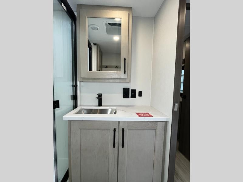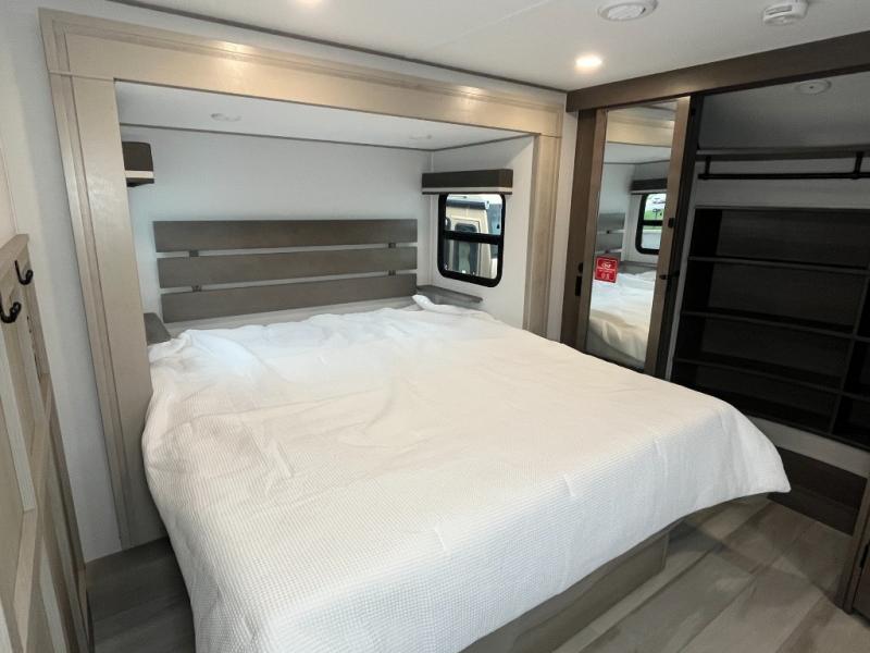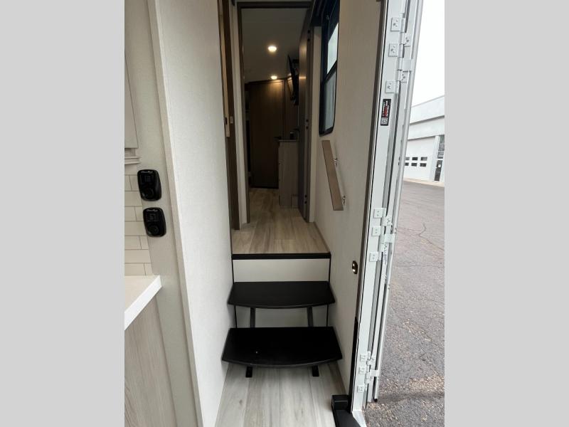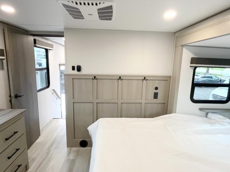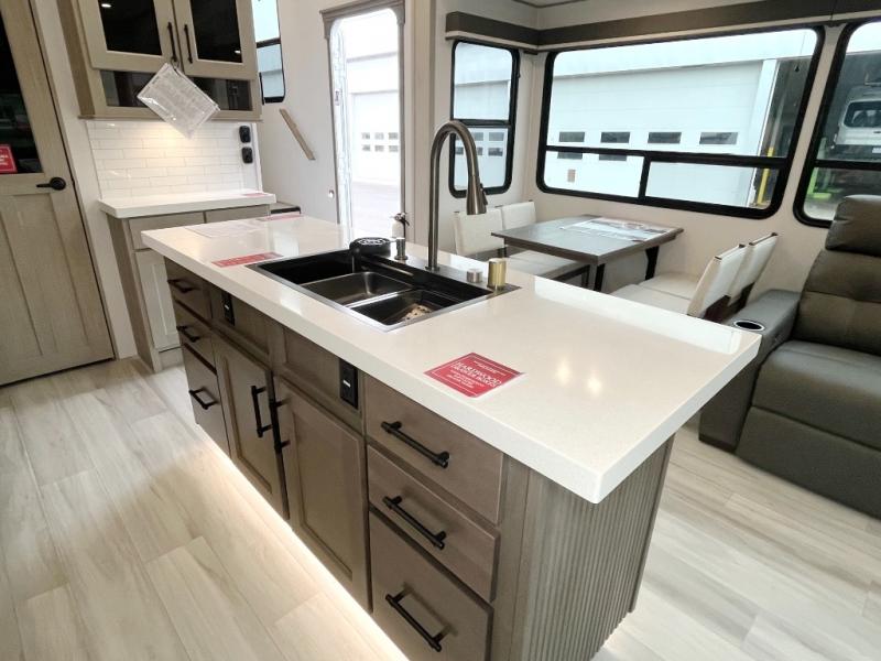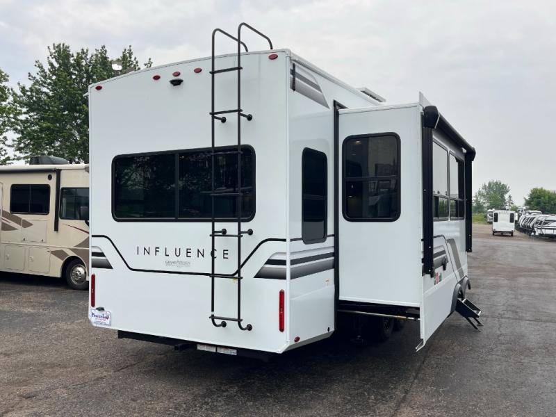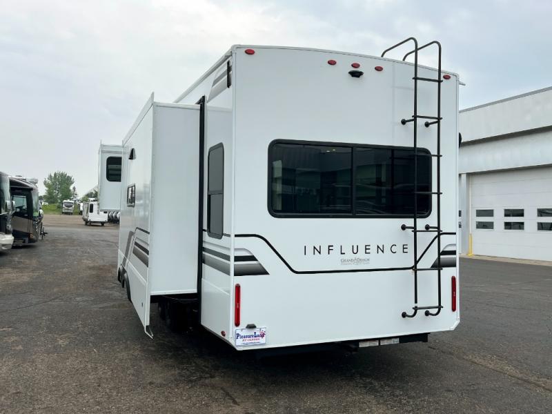 Any Grand Design Influence fifth wheel features five-sided aluminum cage construction with a walk-on roof and a fully enclosed underbelly with heated tanks and storage for all weather camping. For peace of mind, the MORryde CRE3000 Suspension system will provide safe and smooth towing, and the 101" widebody construction offers all the room you need and that is before multiple slides are fully engaged. You will appreciate the Keyed-Alike locks, slam-latch baggage doors with magnetic door catches, exterior security light, and SolidStep entry steps. On the inside, Congoleum flooring, premium roller shades for privacy, a hallway handrail for safety, and nightstands with USB ports to keep all of your electronics fully charged. You will also love the On Demand tankless water heater when showering, plus the added heat and ambiance from an electric fireplace, and so much more!