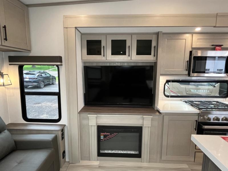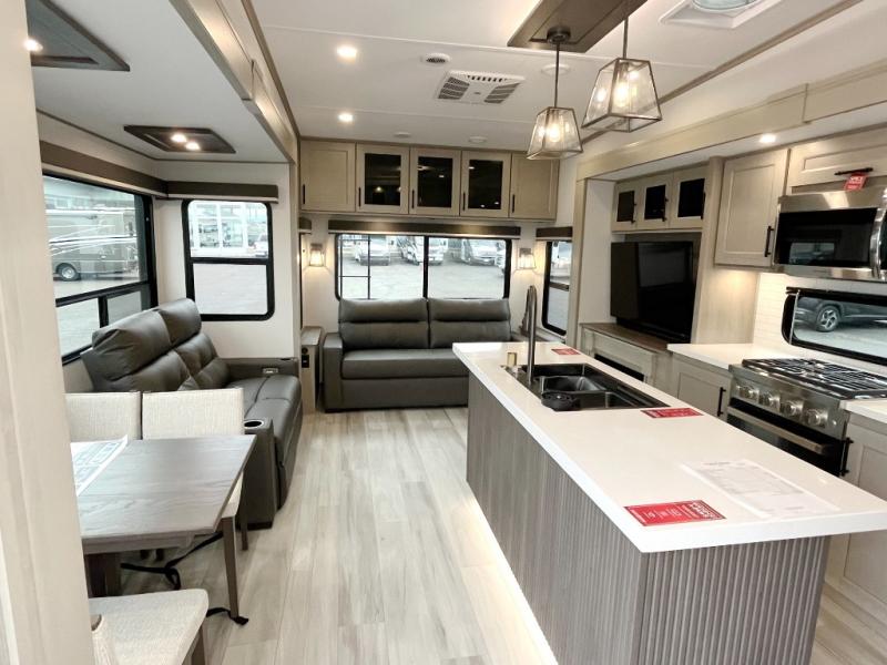 A perfect fifth wheel featuring triple slides and a tri-fold sofa for overnight guests! You will love the spacious interior thanks to the dual opposing slides in the main living and kitchen area. Here you will find a kitchen island in the center and plenty of seating with a free standing dinette, theater seating for movie night opposite the fireplace and entertainment center, as well as a tri-fold sofa. The kitchen offers all of the amenities just like home, a 16 cu. ft. 12-volt refrigerator for your perishables, and a hutch with an electronics drawer to keep your gadgets organized. There is even a pet dish under the refrigerator for your furry friends. The spacious full bath includes a 48" x 30" shower, dual linen closets, and an accessory drawer for necessities. You'll love the front bedroom with its queen bed slide out, slide top dresser, front wardrobe with washer and dryer prep, plus a pass-thru clothes hamper between the bedroom and bath; how convenient!