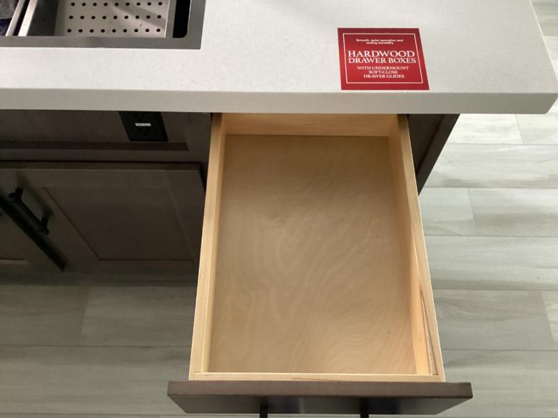 Full-size island workspace, pantry hutch, residential fridge, and generous counter space make meal prep and hosting feel effortless. -