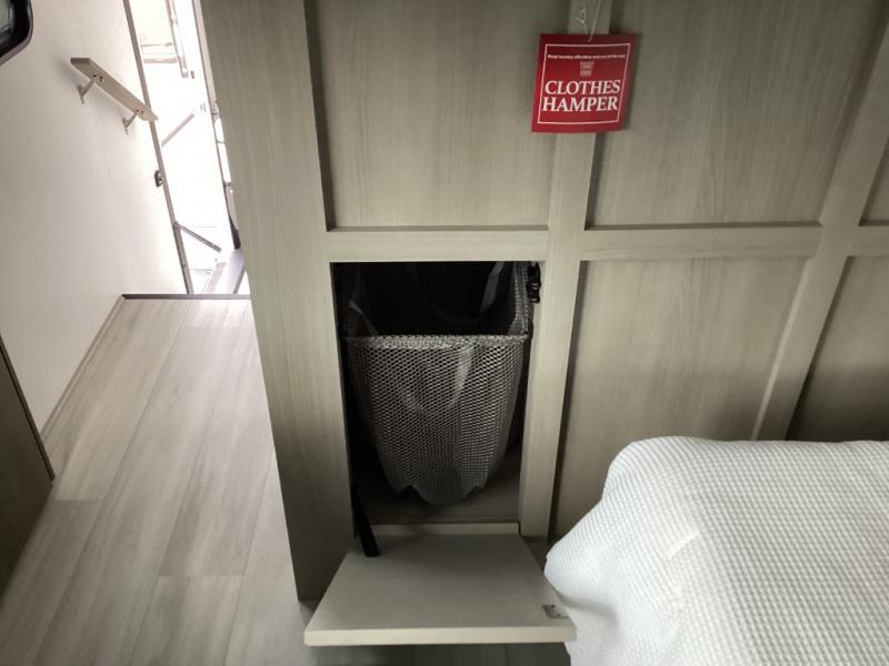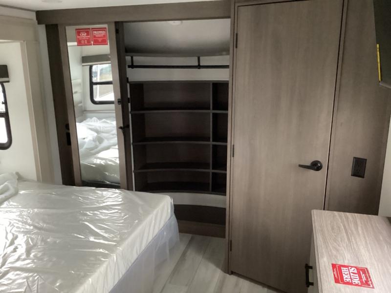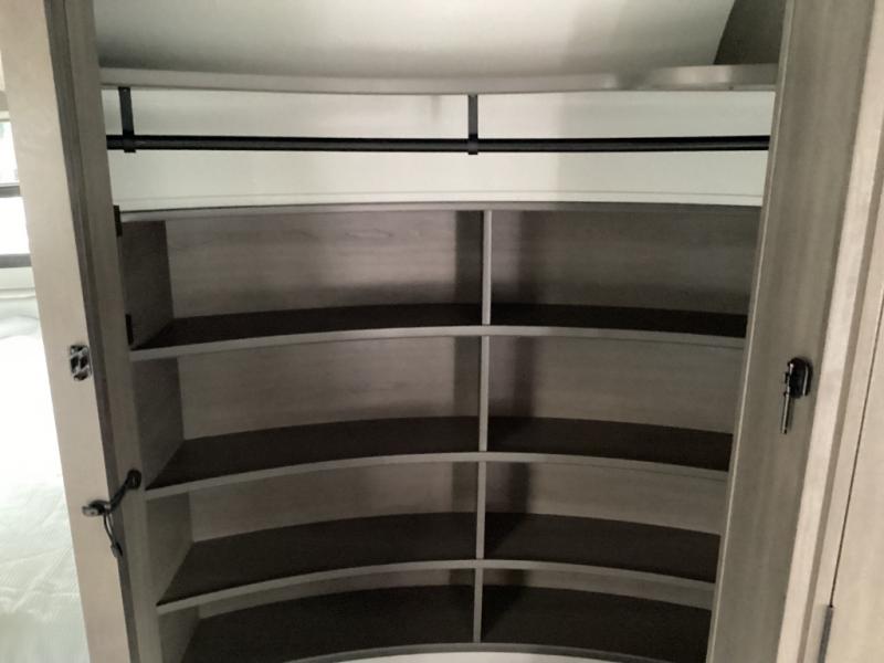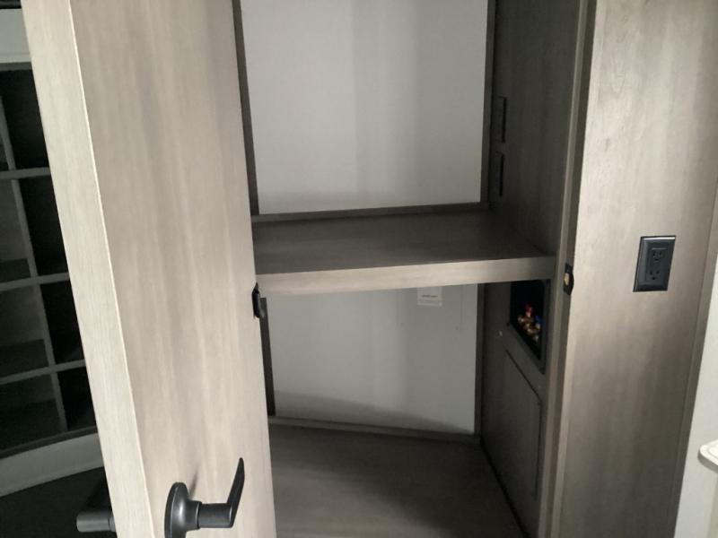 Slide-out queen bedroom with walk-around access, wardrobe storage, and washer/dryer prep—urban comfort in glamping style. -