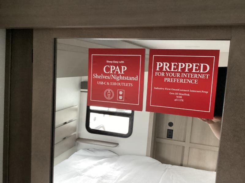 50A service, standard solar prep with panel/inverter-ready wiring, theater lighting, backup camera prep, and JBL stereo bolster off-grid comfort and entertainment.