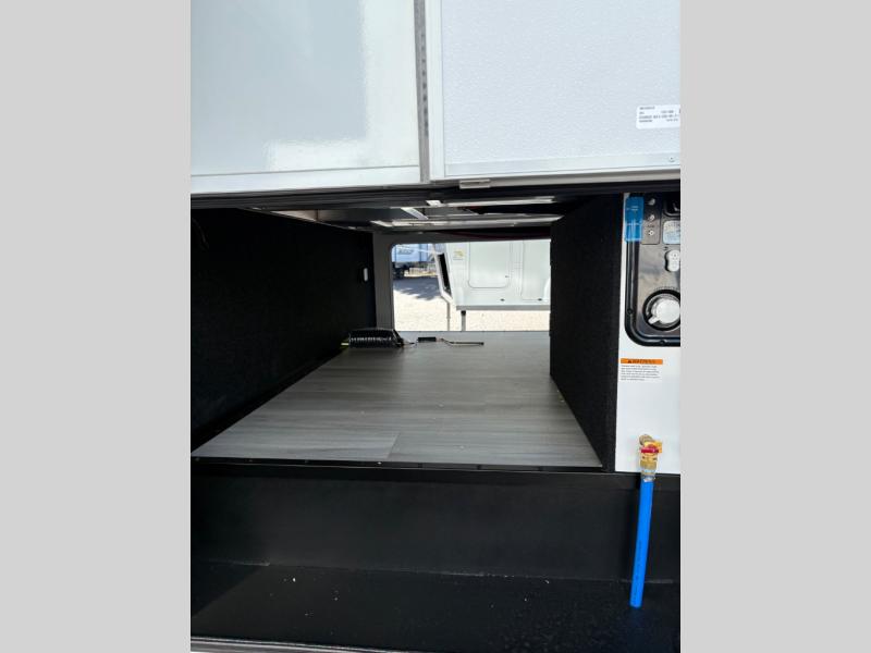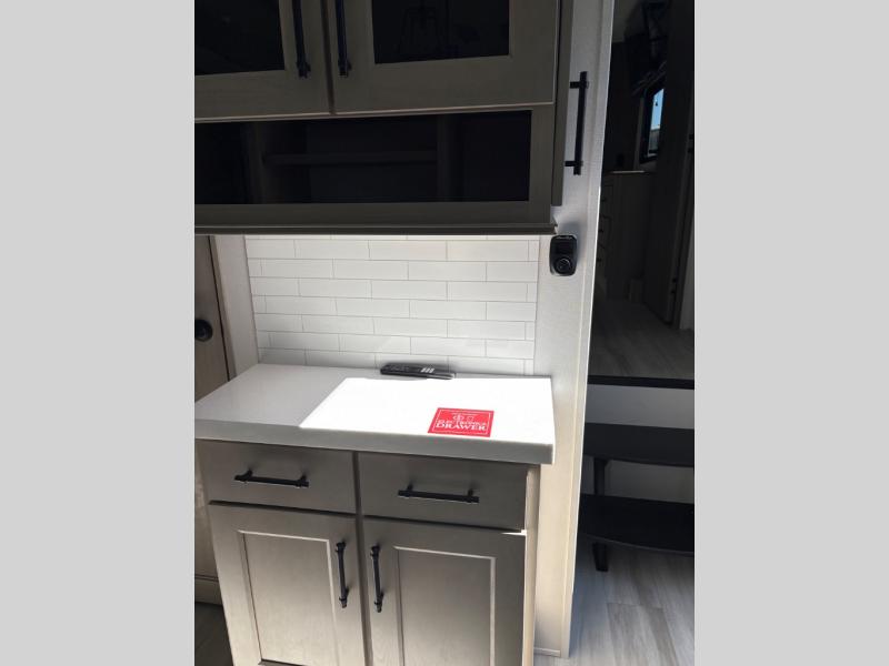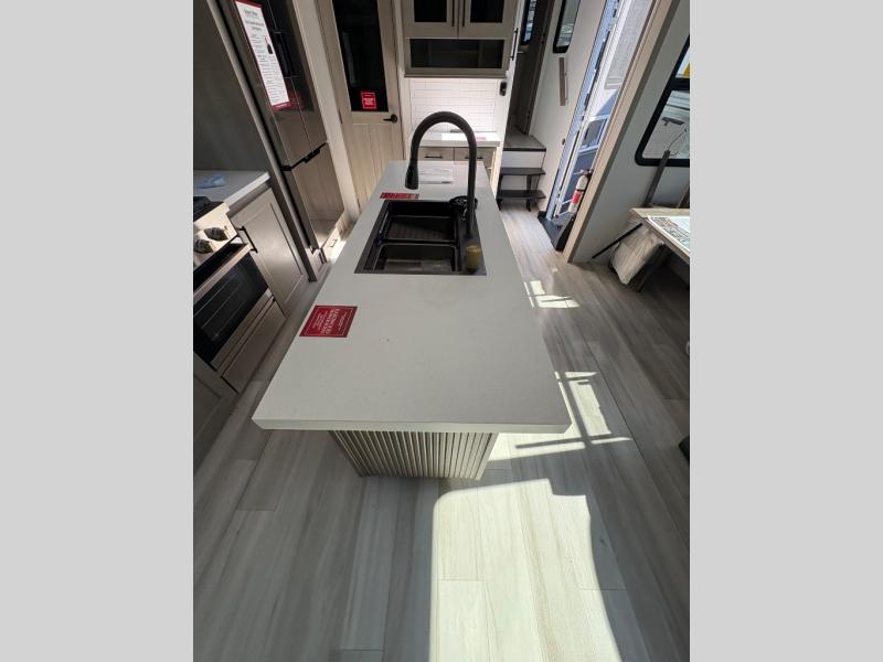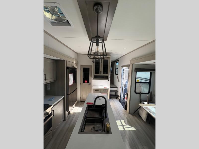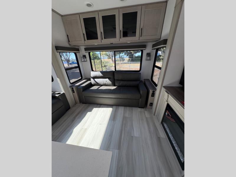 A perfect fifth wheel featuring triple slides and a tri-fold sofa for overnight guests! You will love the spacious interior thanks to the dual opposing slides in the main living and kitchen area. Here you will find a kitchen island in the center and plenty of seating with a free standing dinette, theater seating for movie night opposite the fireplace and entertainment center, as well as a tri-fold sofa. The kitchen offers all of the amenities just like home, a 16 cu. ft. 12-volt refrigerator for your perishables, and a hutch with an electronics drawer to keep your gadgets organized. There is even a pet dish under the refrigerator for your furry friends. The spacious full bath includes a 48" x 30" shower, dual linen closets, and an accessory drawer for necessities. You'll love the front bedroom with its queen bed slide out, slide top dresser, front wardrobe with washer and dryer prep, plus a pass-thru clothes hamper between the bedroom and bath; how convenient!