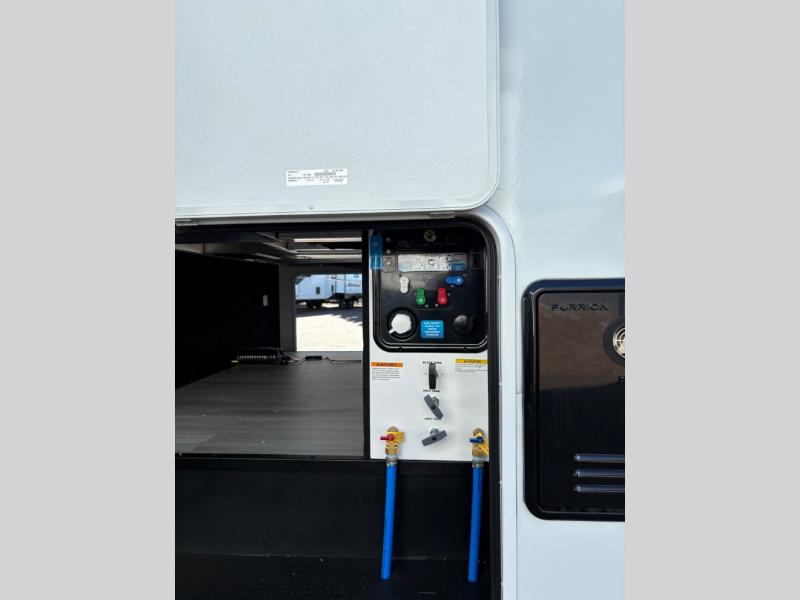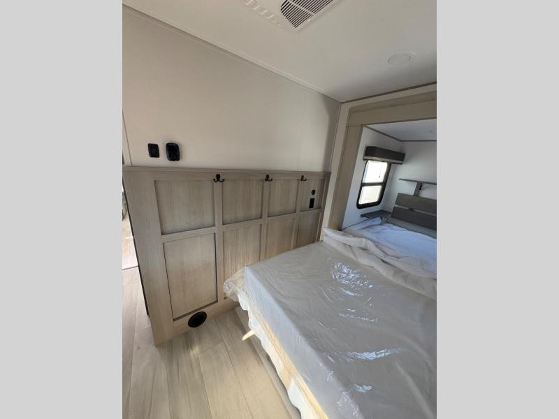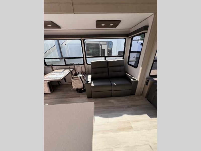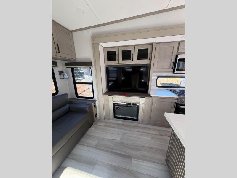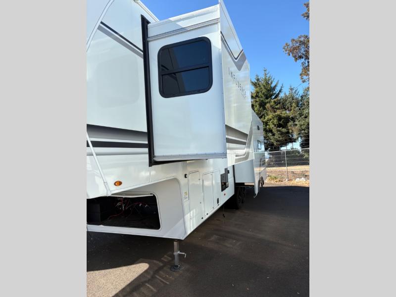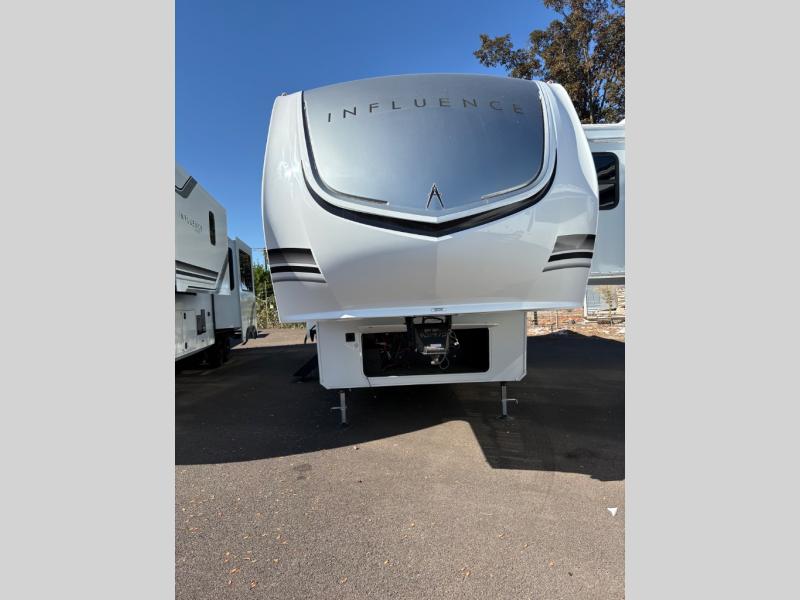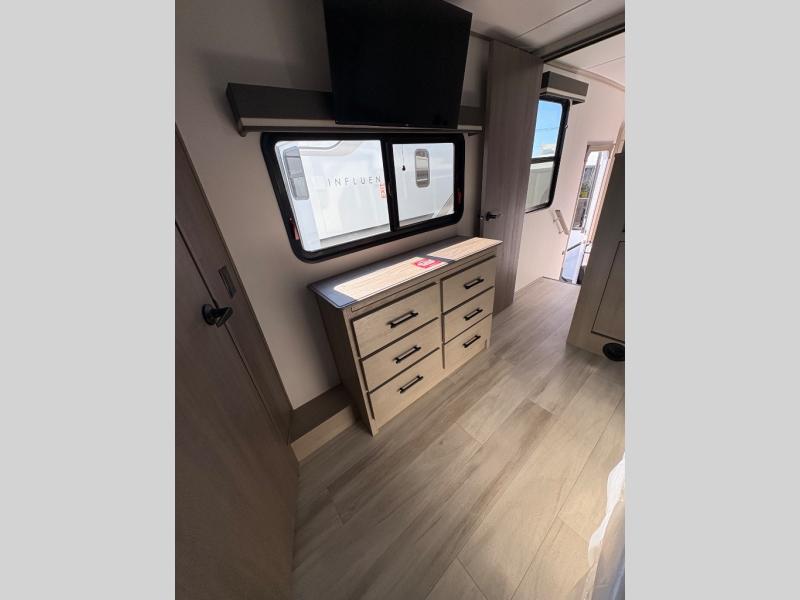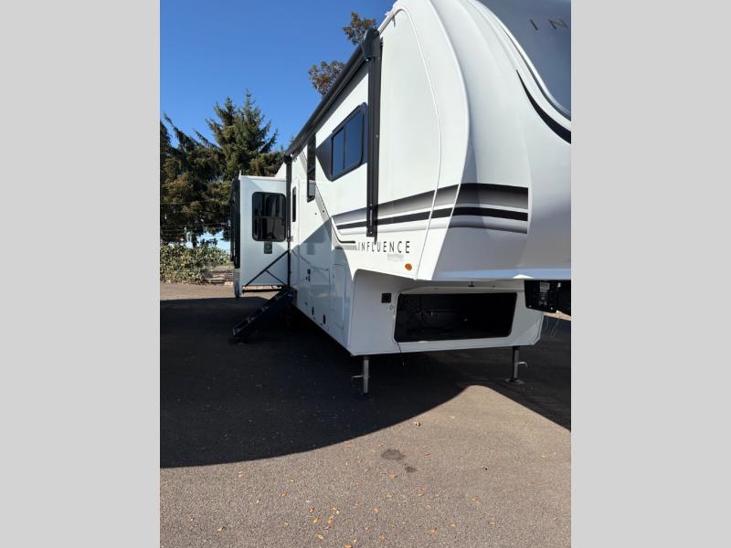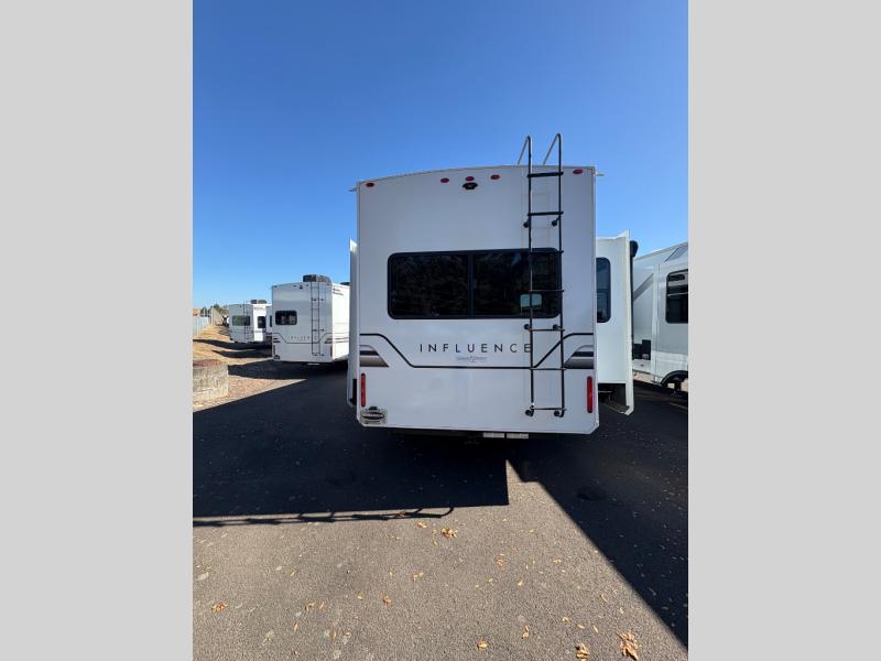 Any Grand Design Influence fifth wheel features five-sided aluminum cage construction with a walk-on roof and a fully enclosed underbelly with heated tanks and storage for all weather camping. For peace of mind, the MORryde CRE3000 Suspension system will provide safe and smooth towing, and the 101" widebody construction offers all the room you need and that is before multiple slides are fully engaged. You will appreciate the Keyed-Alike locks, slam-latch baggage doors with magnetic door catches, exterior security light, and SolidStep entry steps. On the inside, Congoleum flooring, premium roller shades for privacy, a hallway handrail for safety, and nightstands with USB ports to keep all of your electronics fully charged. You will also love the On Demand tankless water heater when showering, plus the added heat and ambiance from an electric fireplace, and so much more!