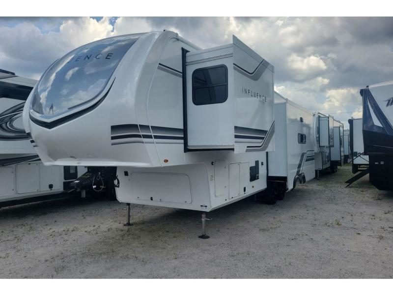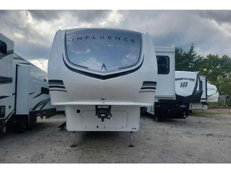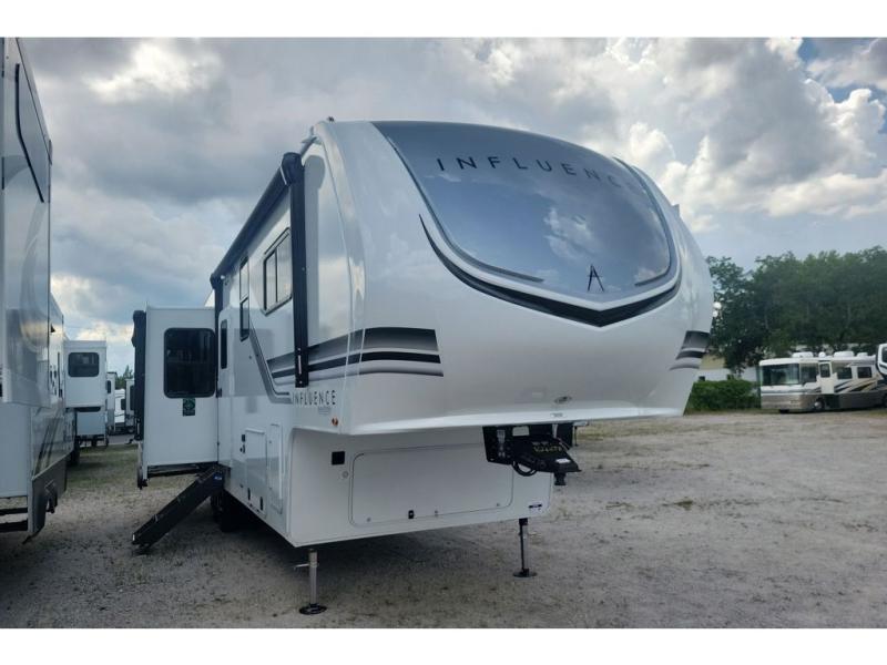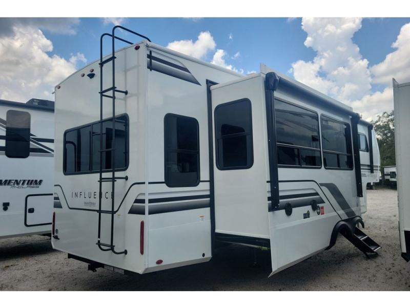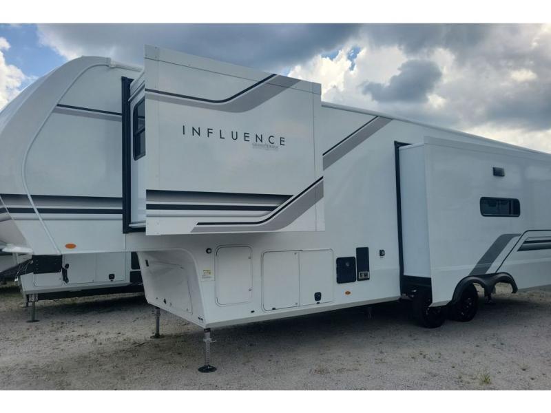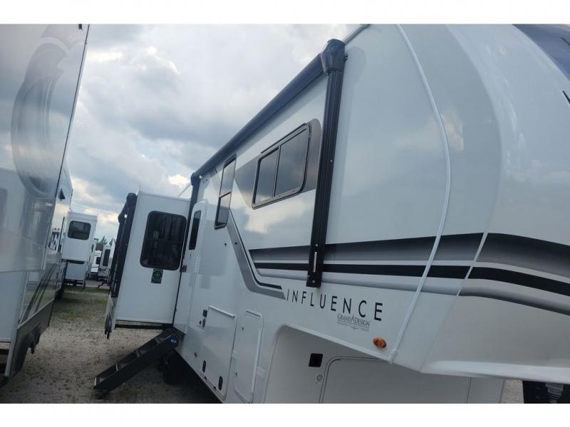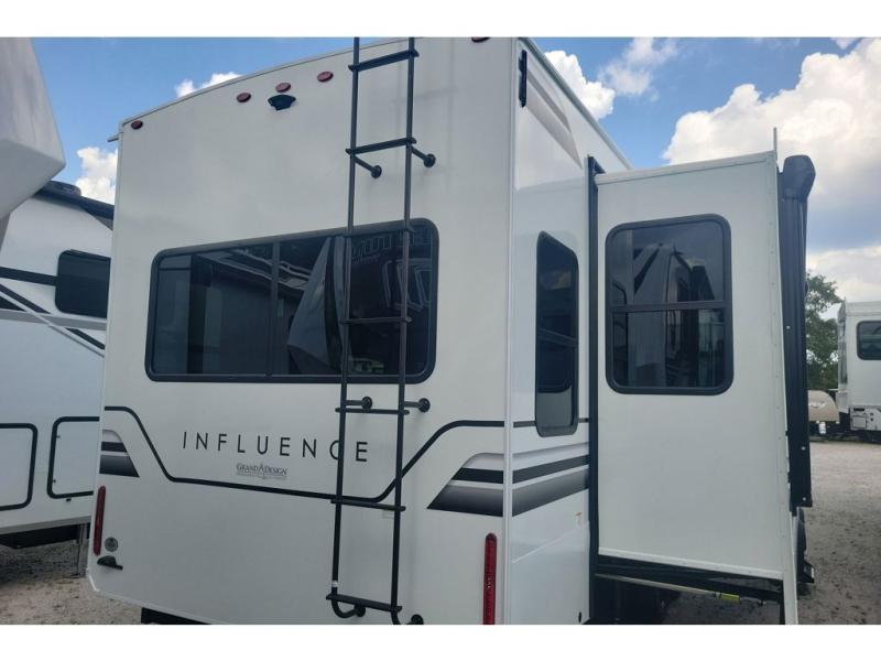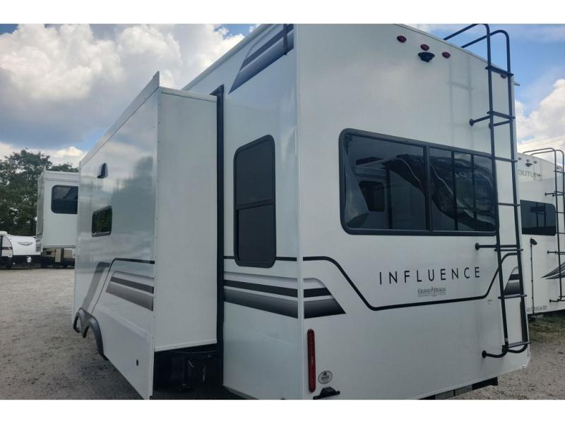 Any Grand Design Influence fifth wheel features five-sided aluminum cage construction with a walk-on roof and a fully enclosed underbelly with heated tanks and storage for all weather camping. For peace of mind, the MORryde CRE3000 Suspension system will provide safe and smooth towing, and the 101" widebody construction offers all the room you need and that is before multiple slides are fully engaged. You will appreciate the Keyed-Alike locks, slam-latch baggage doors with magnetic door catches, exterior security light, and SolidStep entry steps. On the inside, Congoleum flooring, premium roller shades for privacy, a hallway handrail for safety, and nightstands with USB ports to keep all of your electronics fully charged. You will also love the On Demand tankless water heater when showering, plus the added heat and ambiance from an electric fireplace, and so much more!