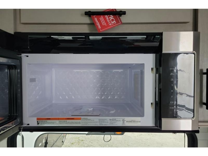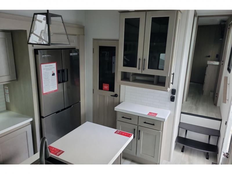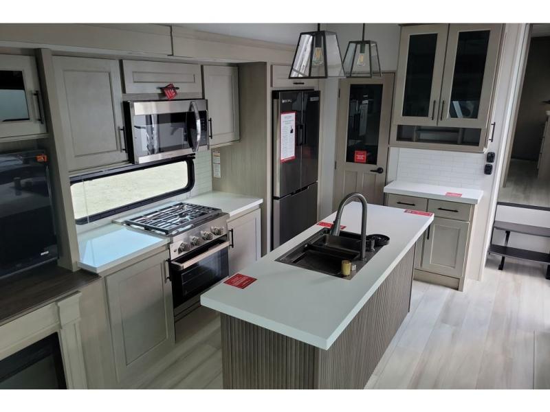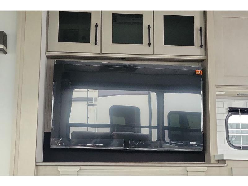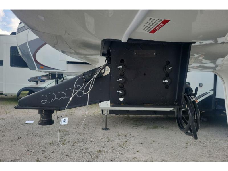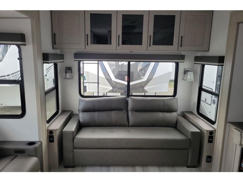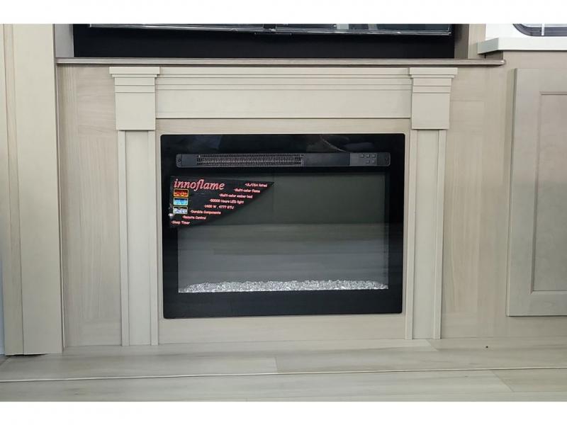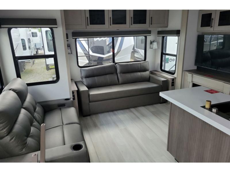 A perfect fifth wheel featuring triple slides and a tri-fold sofa for overnight guests! You will love the spacious interior thanks to the dual opposing slides in the main living and kitchen area. Here you will find a kitchen island in the center and plenty of seating with a free standing dinette, theater seating for movie night opposite the fireplace and entertainment center, as well as a tri-fold sofa. The kitchen offers all of the amenities just like home, a 16 cu. ft. 12-volt refrigerator for your perishables, and a hutch with an electronics drawer to keep your gadgets organized. There is even a pet dish under the refrigerator for your furry friends. The spacious full bath includes a 48" x 30" shower, dual linen closets, and an accessory drawer for necessities. You'll love the front bedroom with its queen bed slide out, slide top dresser, front wardrobe with washer and dryer prep, plus a pass-thru clothes hamper between the bedroom and bath; how convenient!