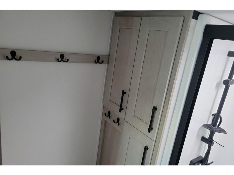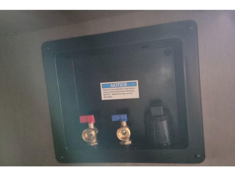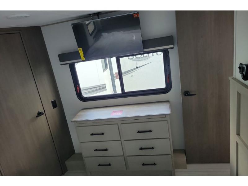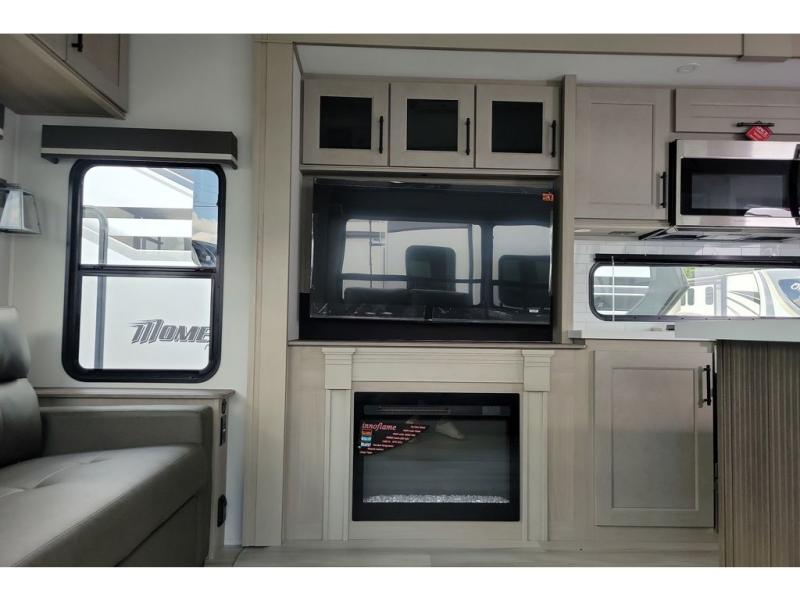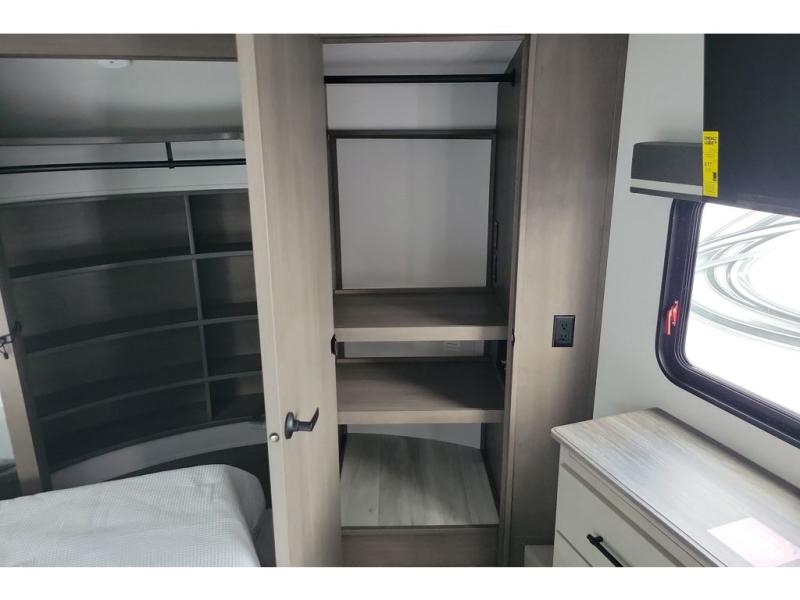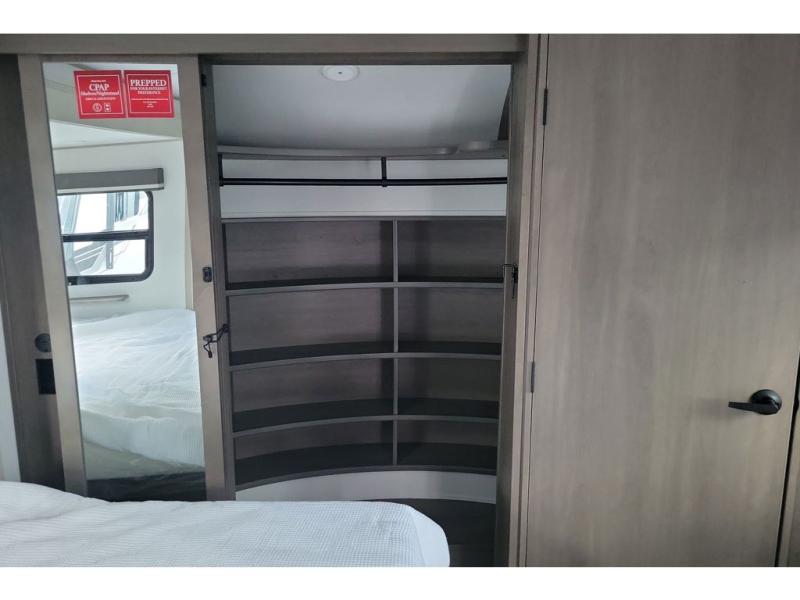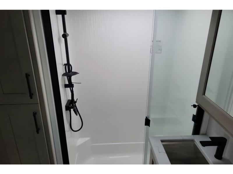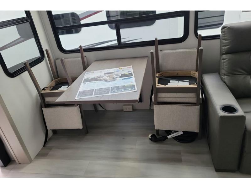 A perfect fifth wheel featuring triple slides and a tri-fold sofa for overnight guests! You will love the spacious interior thanks to the dual opposing slides in the main living and kitchen area. Here you will find a kitchen island in the center and plenty of seating with a free standing dinette, theater seating for movie night opposite the fireplace and entertainment center, as well as a tri-fold sofa. The kitchen offers all of the amenities just like home, a 16 cu. ft. 12-volt refrigerator for your perishables, and a hutch with an electronics drawer to keep your gadgets organized. There is even a pet dish under the refrigerator for your furry friends. The spacious full bath includes a 48" x 30" shower, dual linen closets, and an accessory drawer for necessities. You'll love the front bedroom with its queen bed slide out, slide top dresser, front wardrobe with washer and dryer prep, plus a pass-thru clothes hamper between the bedroom and bath; how convenient!
