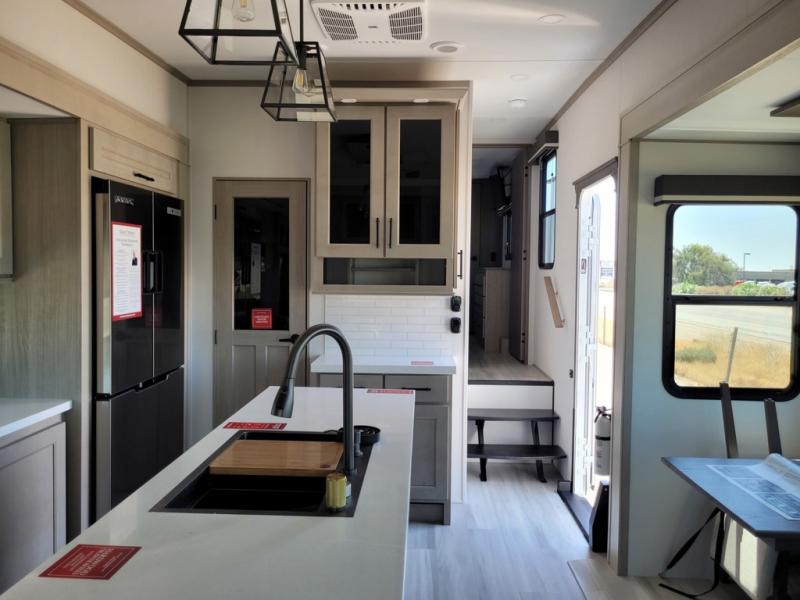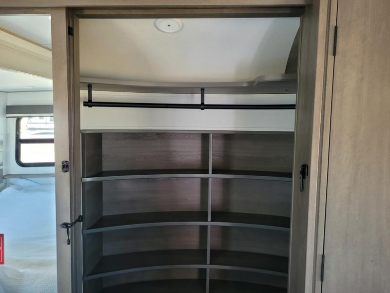 A perfect fifth wheel featuring triple slides and a tri-fold sofa for overnight guests! You will love the spacious interior thanks to the dual opposing slides in the main living and kitchen area. Here you will find a kitchen island in the center and plenty of seating with a free standing dinette, theater seating for movie night opposite the fireplace and entertainment center, as well as a tri-fold sofa. The kitchen offers all of the amenities just like home, a 16 cu. ft. 12-volt refrigerator for your perishables, and a hutch with an electronics drawer to keep your gadgets organized. There is even a pet dish under the refrigerator for your furry friends. The spacious full bath includes a 48" x 30" shower, dual linen closets, and an accessory drawer for necessities. You'll love the front bedroom with its queen bed slide out, slide top dresser, front wardrobe with washer and dryer prep, plus a pass-thru clothes hamper between the bedroom and bath; how convenient!