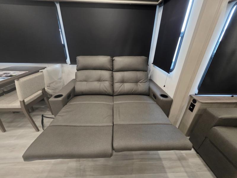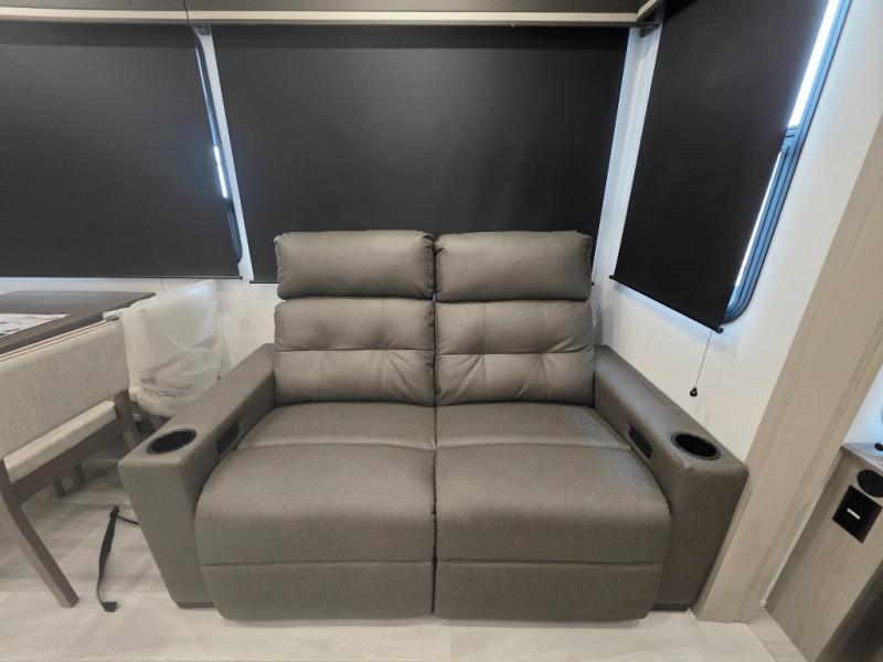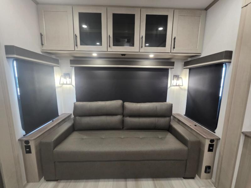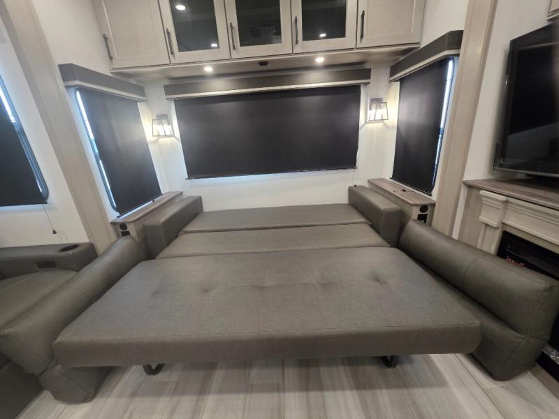 Kick back and relax in a beautifully designed rear living area with theater seating, a tri-fold sofa for guests, a large LED TV, and an electric fireplace that sets the perfect ambiance for movie nights or chilly mornings. Massive panoramic windows bring in natural light and offer breathtaking views of your surroundings.