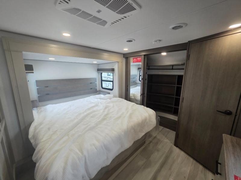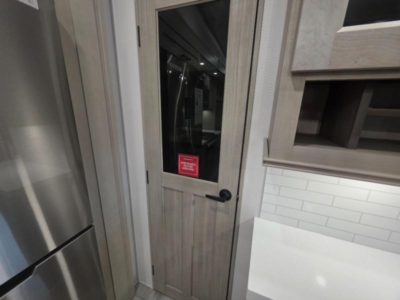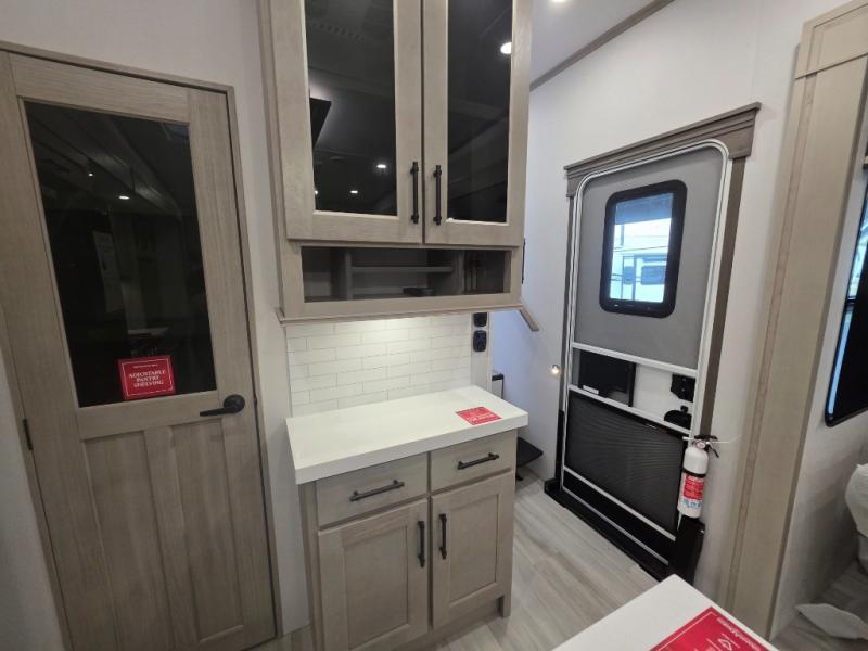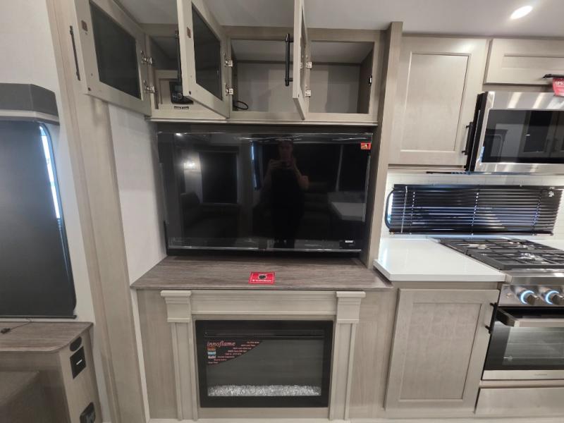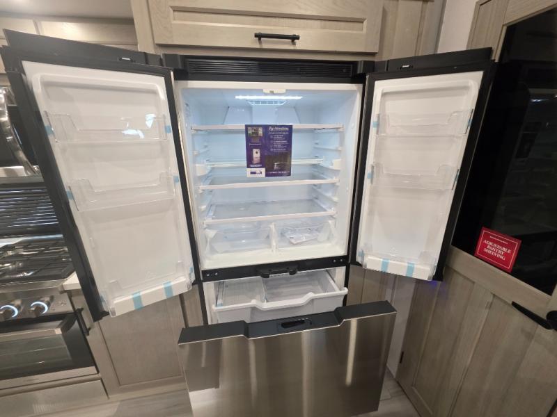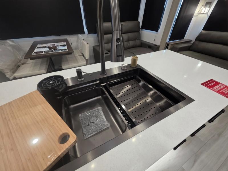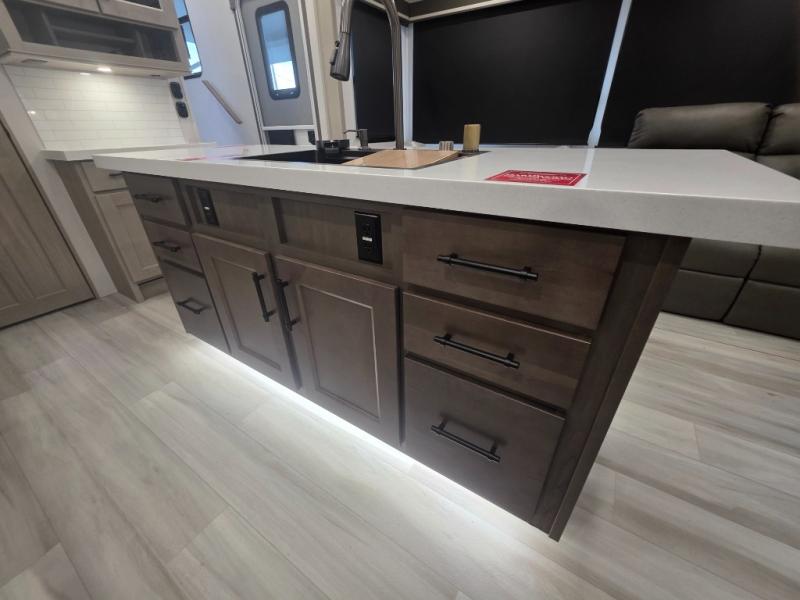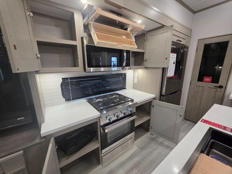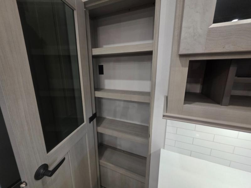 The Influence 3003RL brings residential-style cooking to the campground with solid-surface countertops, a deep farmhouse sink, oversized pantry, spacious kitchen island, 16 cu. ft. refrigerator, and a 24" residential oven. Whether it’s morning coffee or gourmet dinner, this kitchen makes it a joy to prepare every meal.