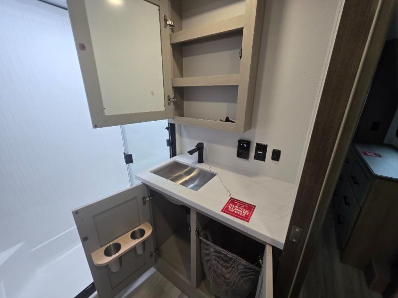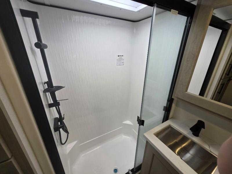 Enjoy a spa-like experience in the Influence 3003RL’s well-appointed bathroom, complete with a residential shower with skylight and glass doors, porcelain toilet, mirrored medicine cabinet, and linen storage. Every detail was designed to bring residential comfort on the road.