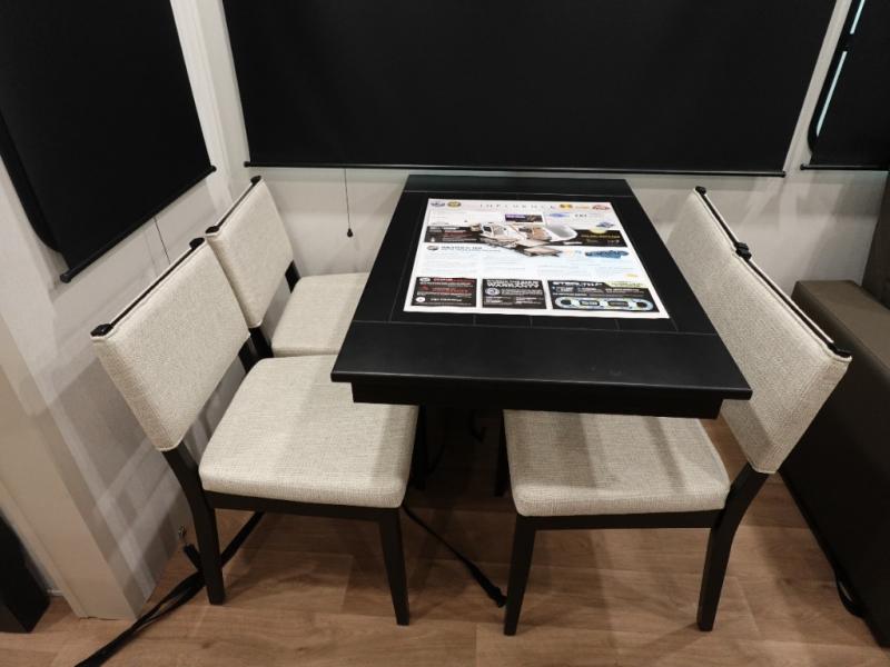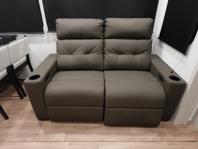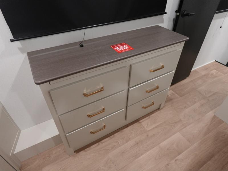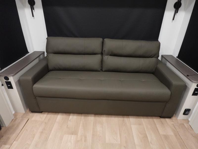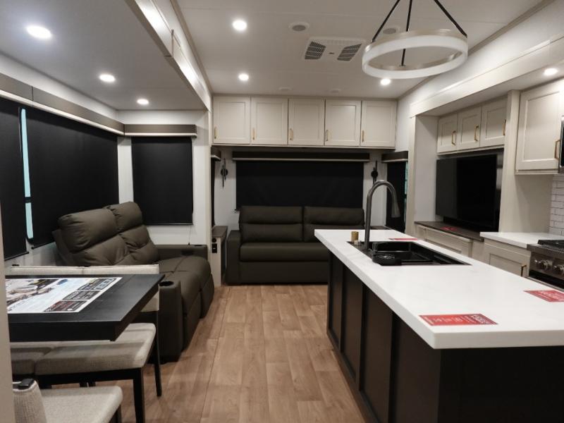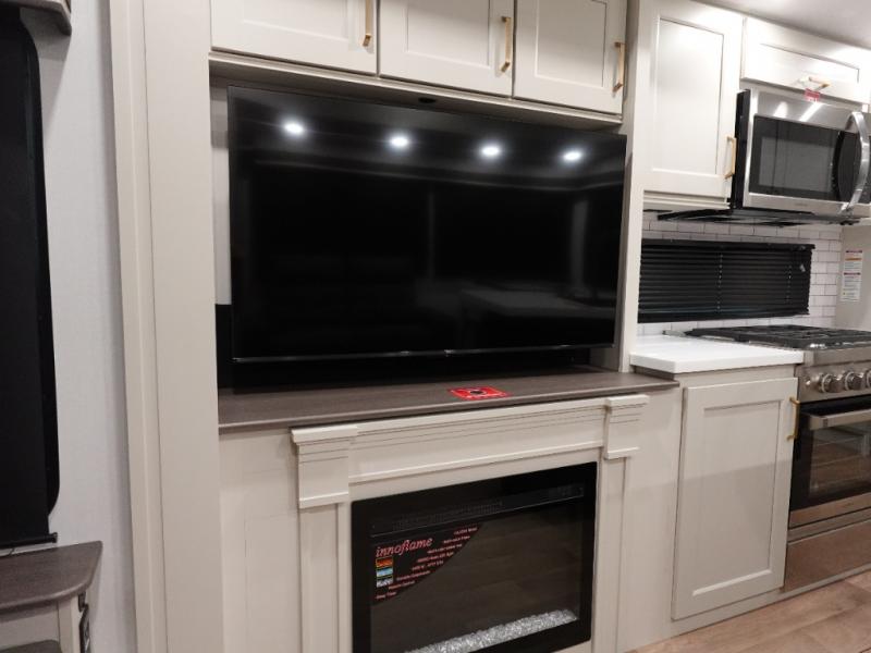 A perfect fifth wheel featuring triple slides and a tri-fold sofa for overnight guests! You will love the spacious interior thanks to the dual opposing slides in the main living and kitchen area. Here you will find a kitchen island in the center and plenty of seating with a free standing dinette, theater seating for movie night opposite the fireplace and entertainment center, as well as a tri-fold sofa. The kitchen offers all of the amenities just like home, a 16 cu. ft. 12-volt refrigerator for your perishables, and a hutch with an electronics drawer to keep your gadgets organized. There is even a pet dish under the refrigerator for your furry friends. The spacious full bath includes a 48" x 30" shower, dual linen closets, and an accessory drawer for necessities. You'll love the front bedroom with its king bed slide out, slide top dresser, front wardrobe with washer and dryer prep, plus a pass-thru clothes hamper between the bedroom and bath; how convenient!