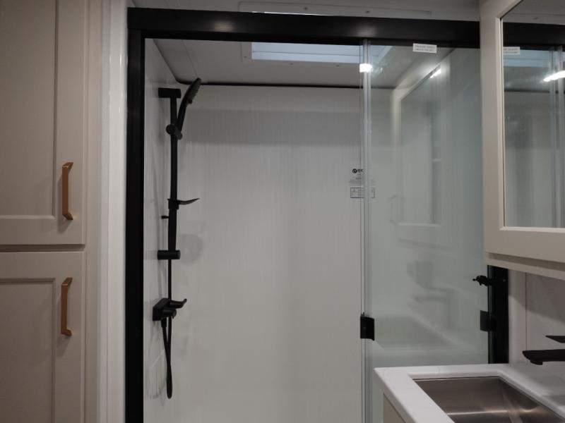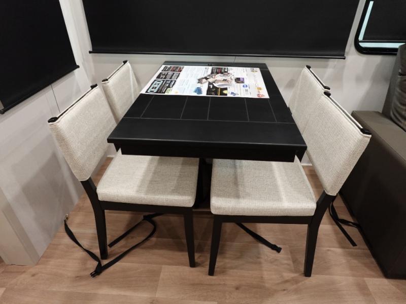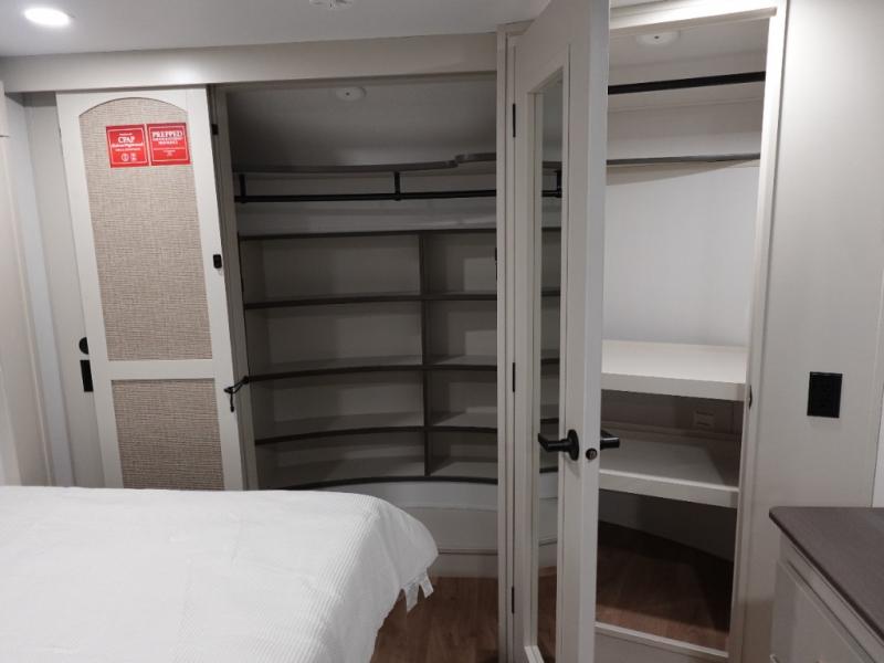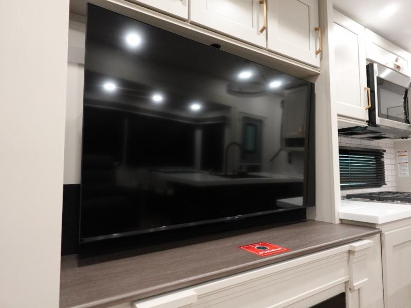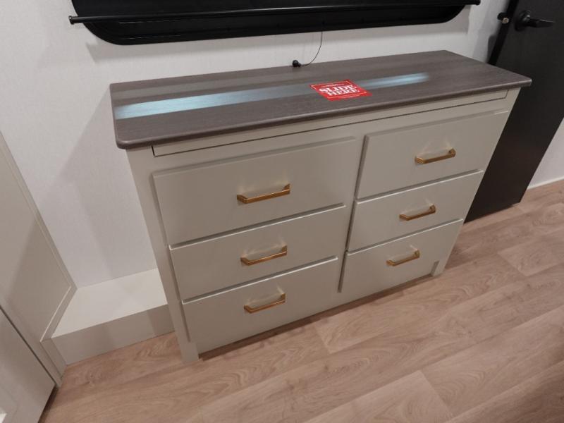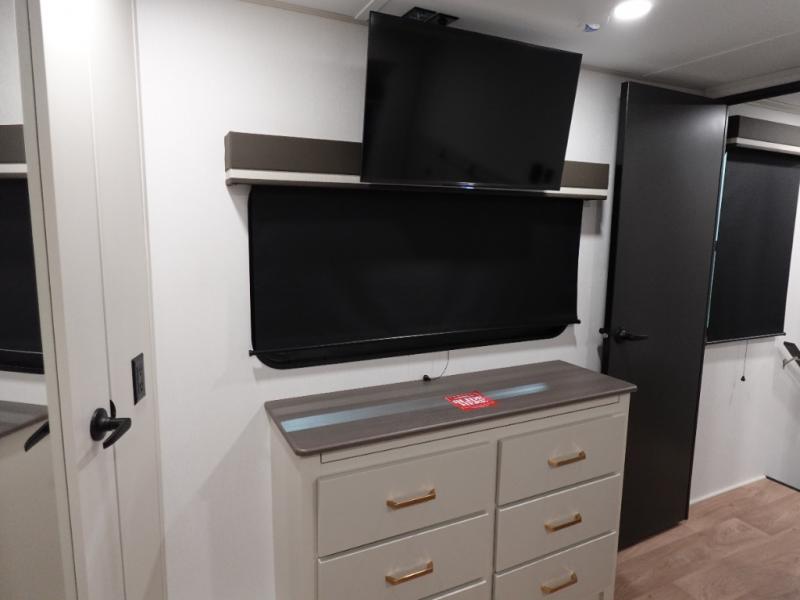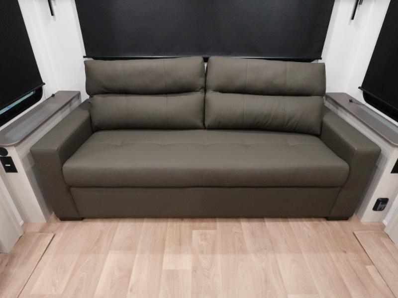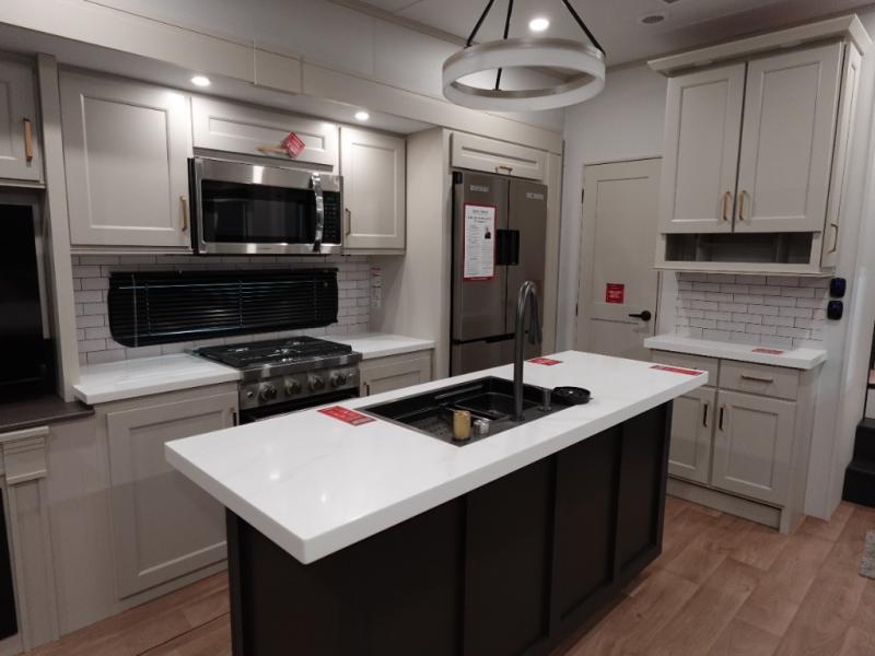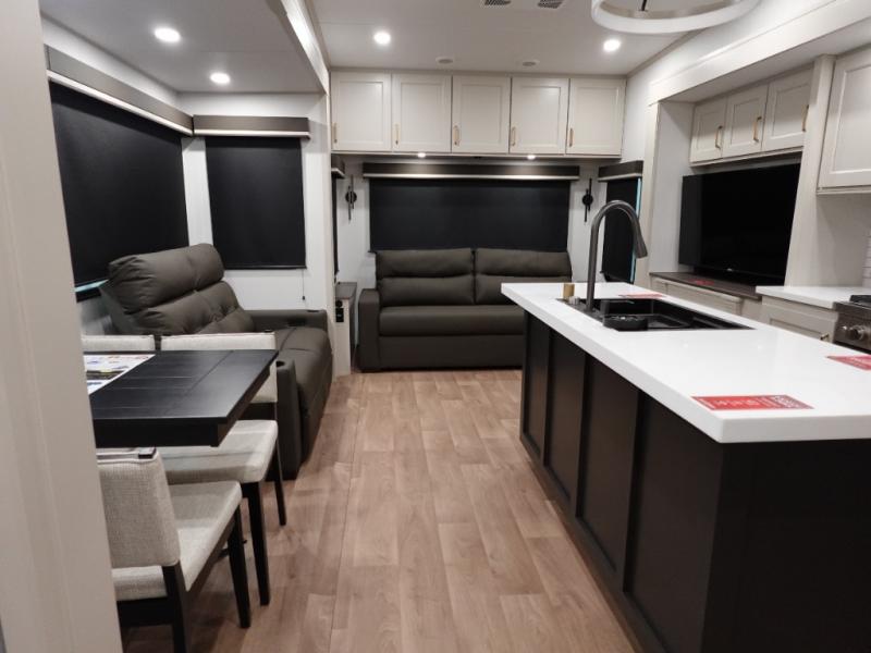 A perfect fifth wheel featuring triple slides and a tri-fold sofa for overnight guests! You will love the spacious interior thanks to the dual opposing slides in the main living and kitchen area. Here you will find a kitchen island in the center and plenty of seating with a free standing dinette, theater seating for movie night opposite the fireplace and entertainment center, as well as a tri-fold sofa. The kitchen offers all of the amenities just like home, a 16 cu. ft. 12-volt refrigerator for your perishables, and a hutch with an electronics drawer to keep your gadgets organized. There is even a pet dish under the refrigerator for your furry friends. The spacious full bath includes a 48" x 30" shower, dual linen closets, and an accessory drawer for necessities. You'll love the front bedroom with its king bed slide out, slide top dresser, front wardrobe with washer and dryer prep, plus a pass-thru clothes hamper between the bedroom and bath; how convenient!