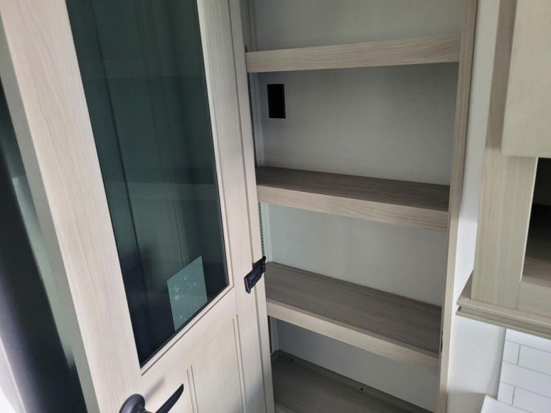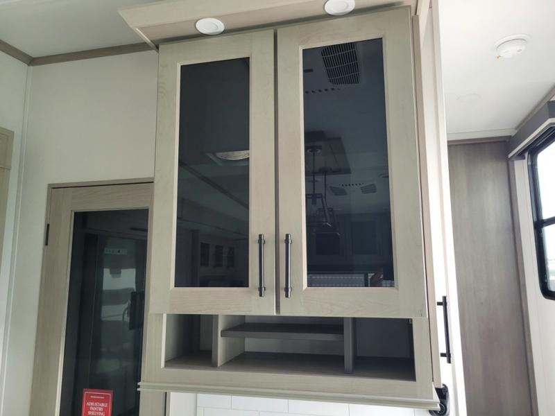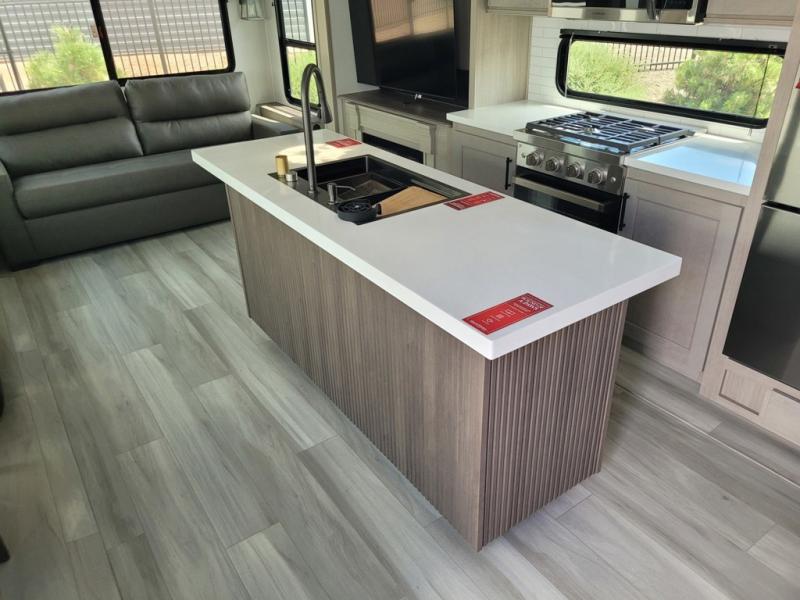A perfect fifth wheel featuring triple slides and a tri-fold sofa for overnight guests! You will love the spacious interior thanks to the dual opposing slides in the main living and kitchen area. Here you will find a kitchen island in the center and plenty of seating with a free standing dinette, theater seating for movie night opposite the fireplace and entertainment center, as well as a tri-fold sofa. The kitchen offers all of the amenities just like home, a 16 cu. ft. 12-volt refrigerator for your perishables, and a hutch with an electronics drawer to keep your gadgets organized. There is even a pet dish under the refrigerator for your furry friends. The spacious full bath includes a 48" x 30" shower, dual linen closets, and an accessory drawer for necessities. You'll love the front bedroom with its queen bed slide out, slide top dresser, front wardrobe with washer and dryer prep, plus a pass-thru clothes hamper between the bedroom and bath; how convenient!
