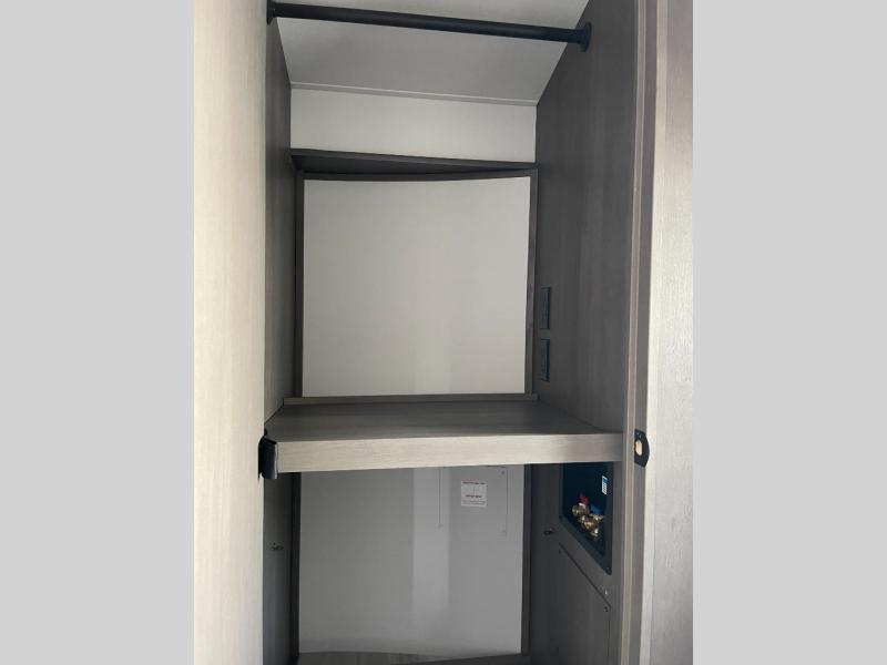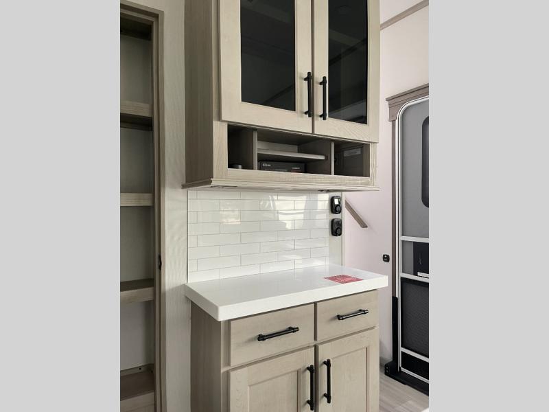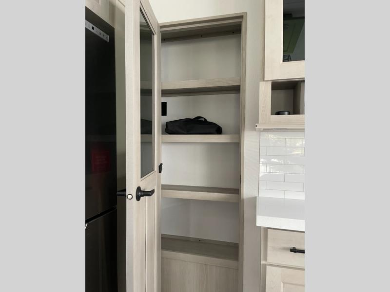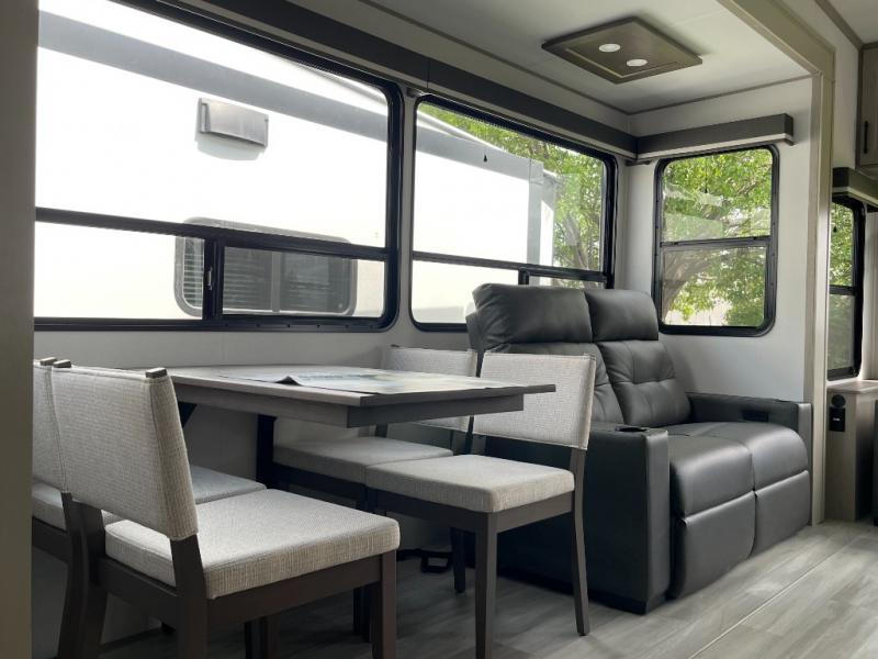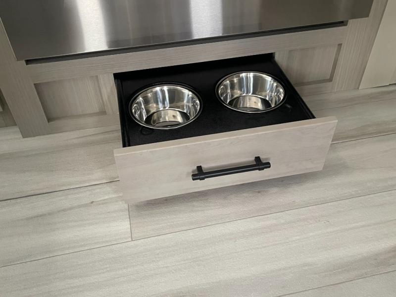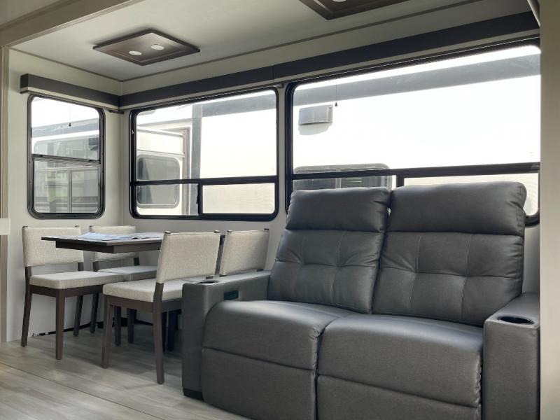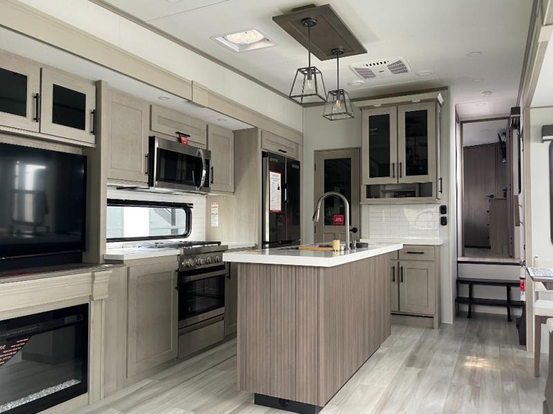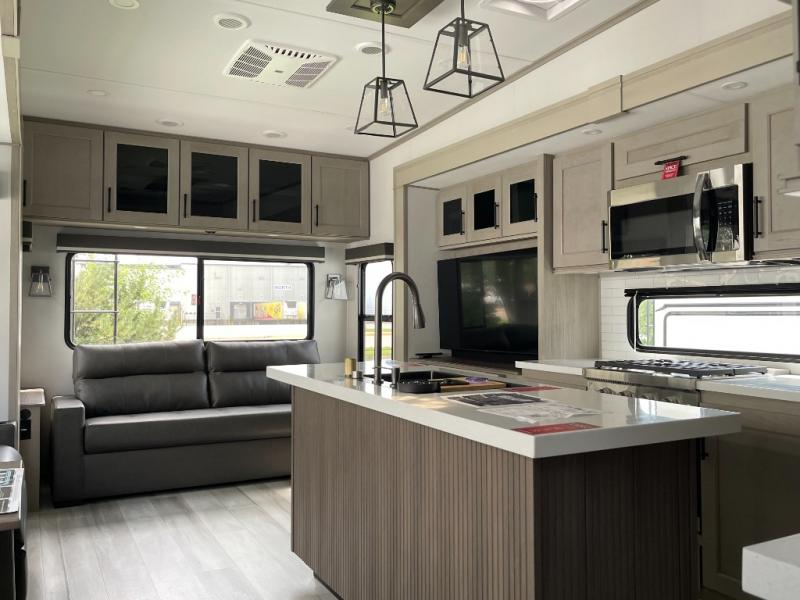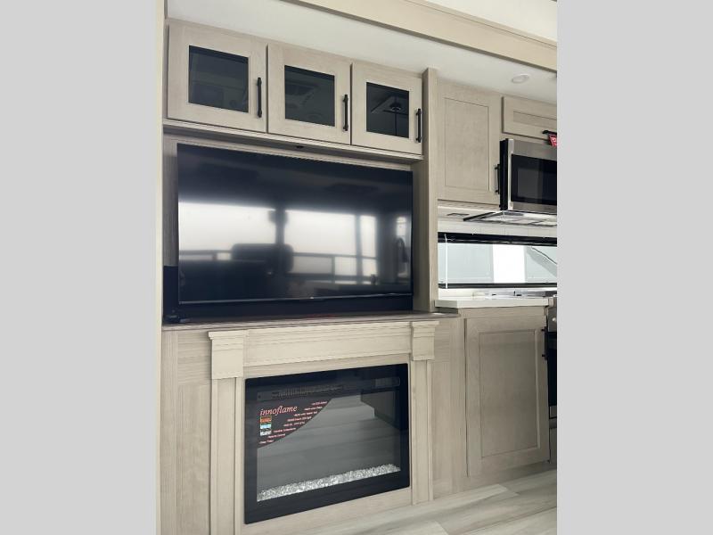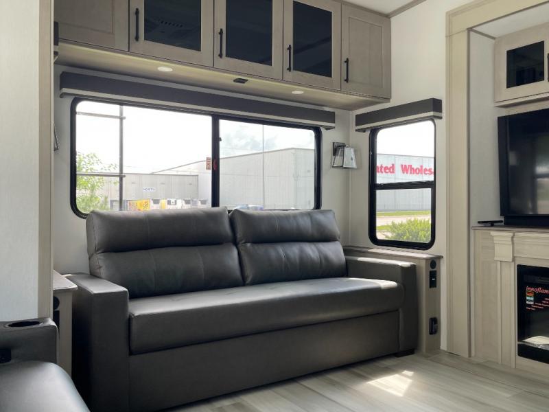 A perfect fifth wheel featuring triple slides and a tri-fold sofa for overnight guests! You will love the spacious interior thanks to the dual opposing slides in the main living and kitchen area. Here you will find a kitchen island in the center and plenty of seating with a free standing dinette, theater seating for movie night opposite the fireplace and entertainment center, as well as a tri-fold sofa. The kitchen offers all of the amenities just like home, a 16 cu. ft. 12-volt refrigerator for your perishables, and a hutch with an electronics drawer to keep your gadgets organized. There is even a pet dish under the refrigerator for your furry friends. The spacious full bath includes a 48" x 30" shower, dual linen closets, and an accessory drawer for necessities. You'll love the front bedroom with its queen bed slide out, slide top dresser, front wardrobe with washer and dryer prep, plus a pass-thru clothes hamper between the bedroom and bath; how convenient!