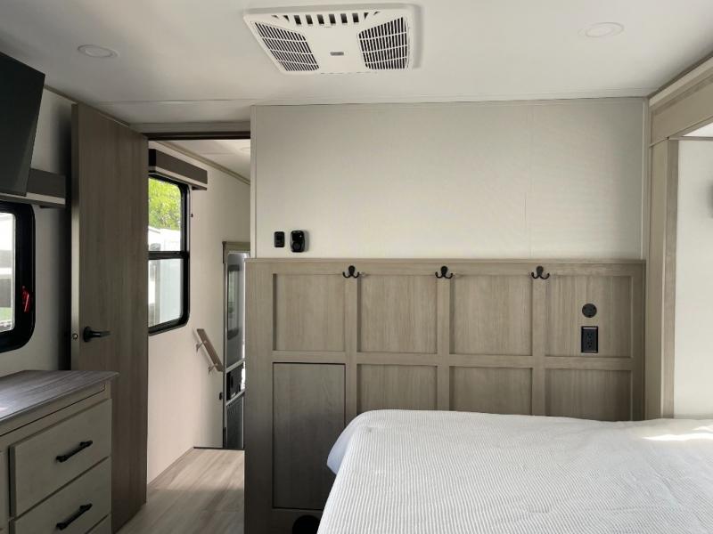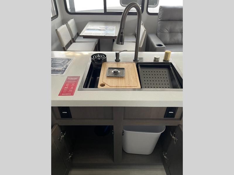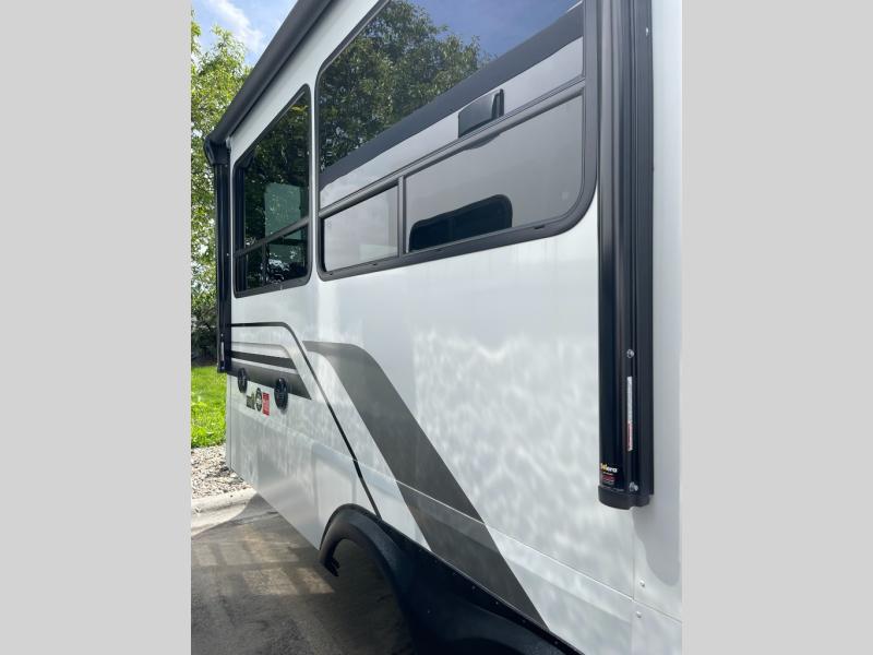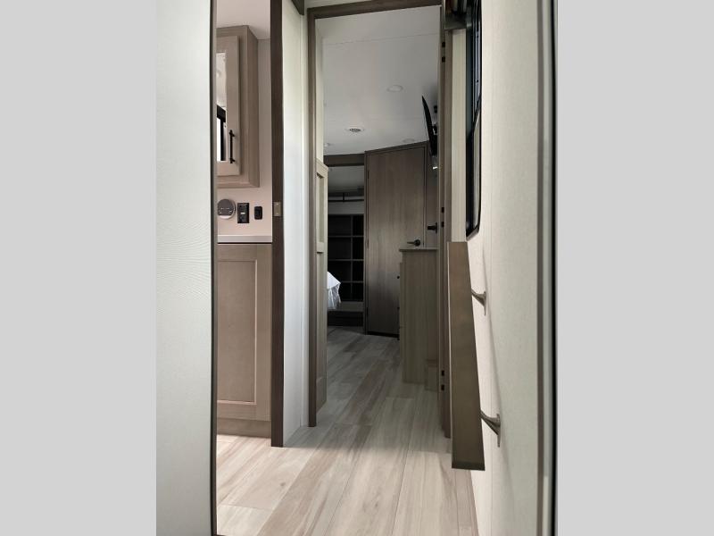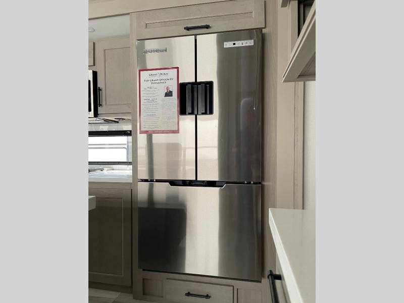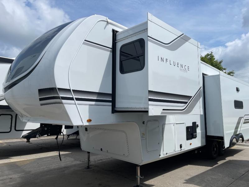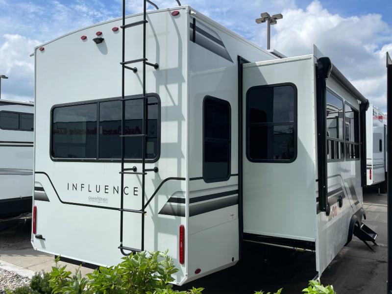 Any Grand Design Influence fifth wheel features five-sided aluminum cage construction with a walk-on roof and a fully enclosed underbelly with heated tanks and storage for all weather camping. For peace of mind, the MORryde CRE3000 Suspension system will provide safe and smooth towing, and the 101" widebody construction offers all the room you need and that is before multiple slides are fully engaged. You will appreciate the Keyed-Alike locks, slam-latch baggage doors with magnetic door catches, exterior security light, and SolidStep entry steps. On the inside, Congoleum flooring, premium roller shades for privacy, a hallway handrail for safety, and nightstands with USB ports to keep all of your electronics fully charged. You will also love the On Demand tankless water heater when showering, plus the added heat and ambiance from an electric fireplace, and so much more!