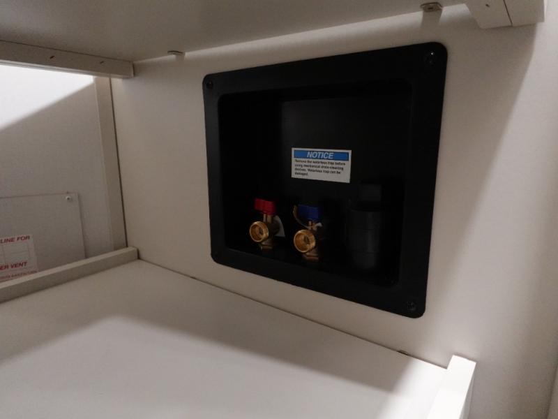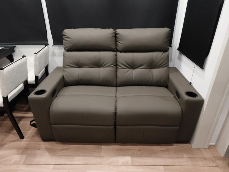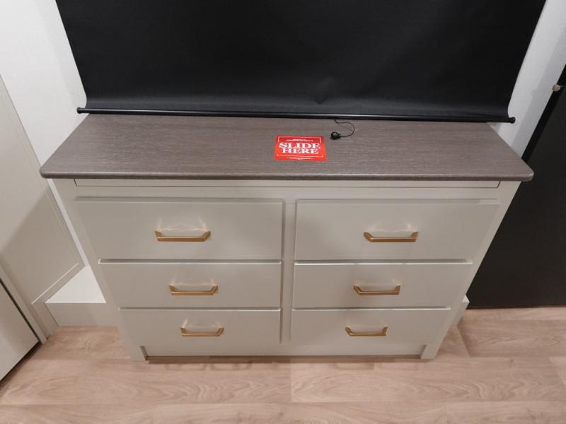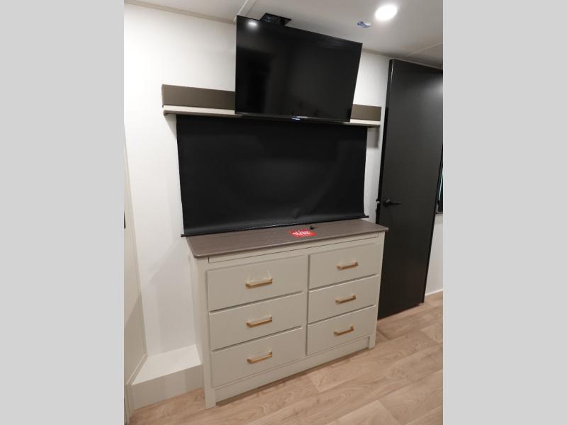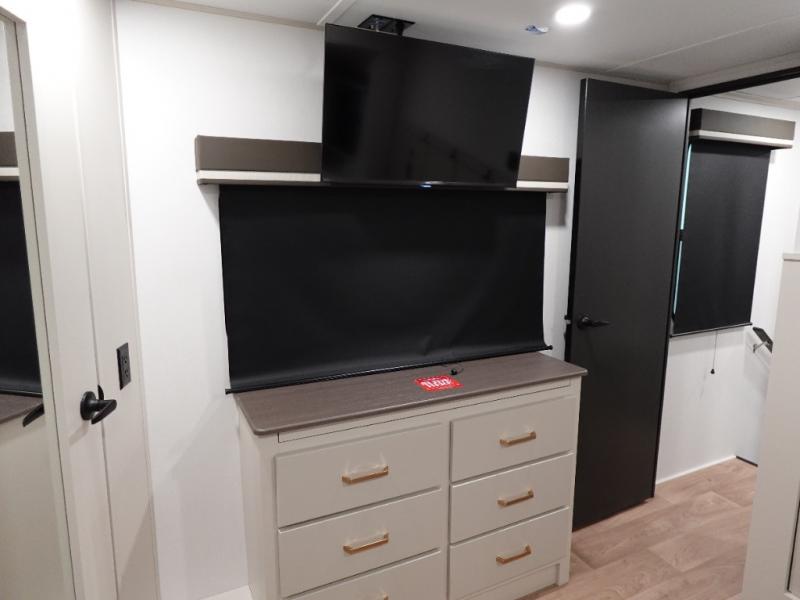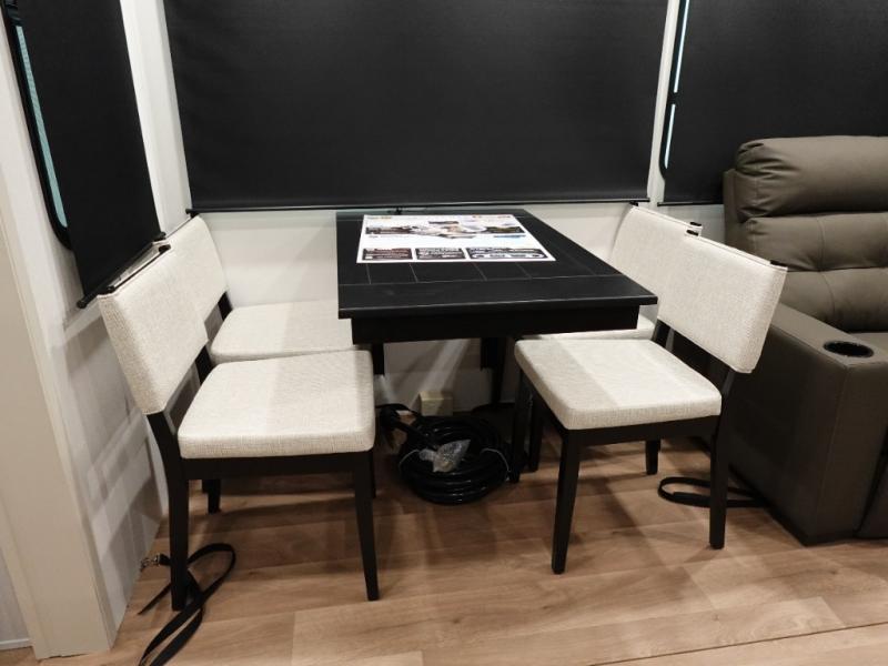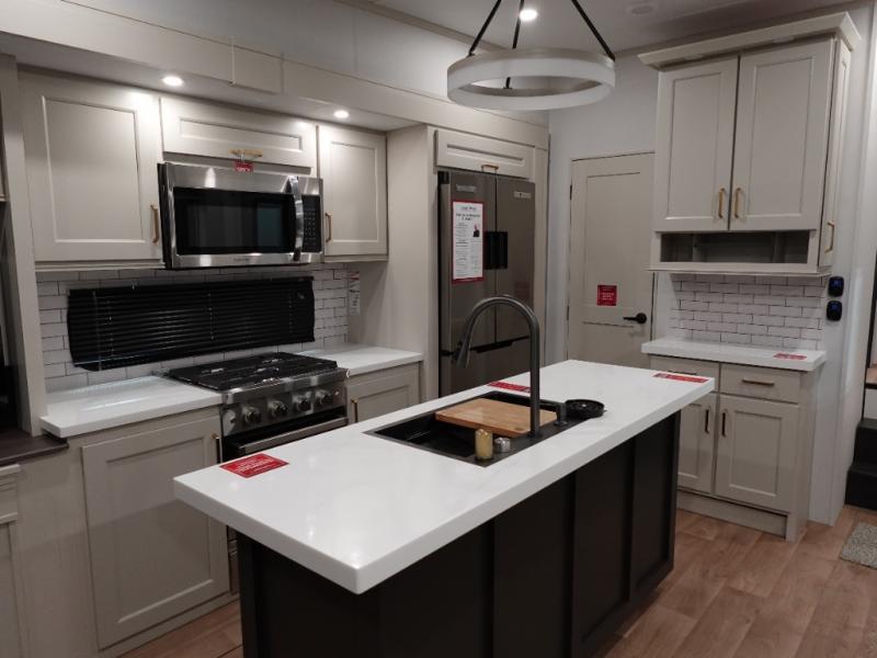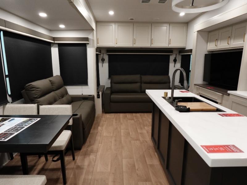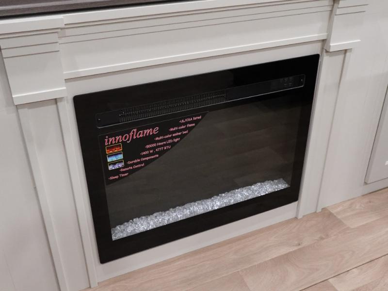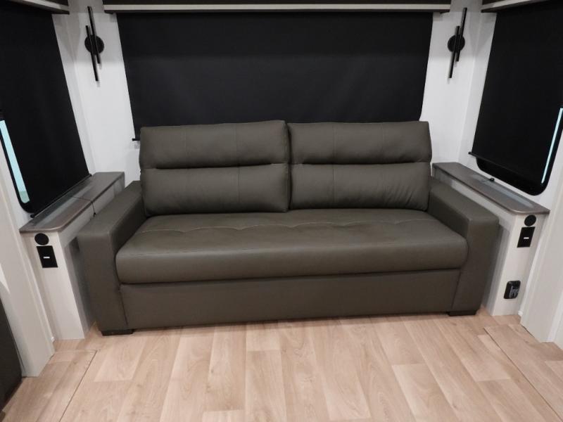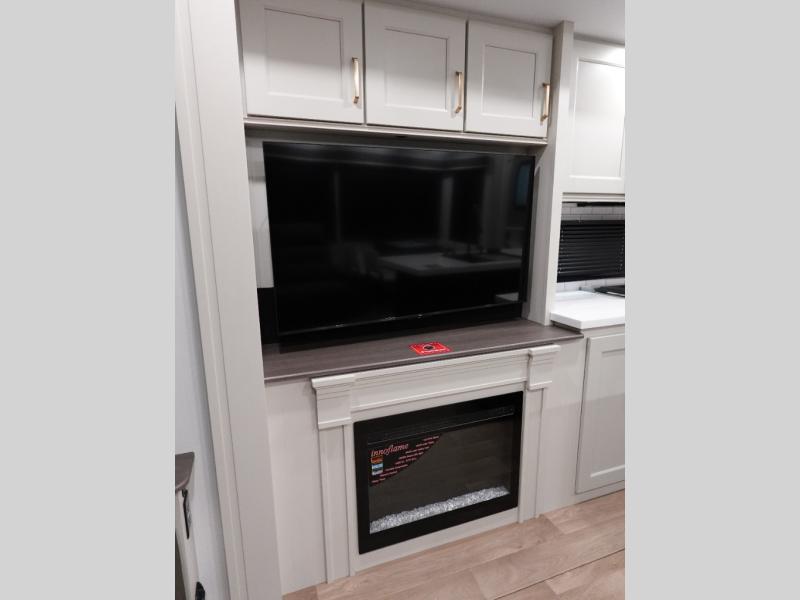 A perfect fifth wheel featuring triple slides and a tri-fold sofa for overnight guests! You will love the spacious interior thanks to the dual opposing slides in the main living and kitchen area. Here you will find a kitchen island in the center and plenty of seating with a free standing dinette, theater seating for movie night opposite the fireplace and entertainment center, as well as a tri-fold sofa. The kitchen offers all of the amenities just like home, a 16 cu. ft. 12-volt refrigerator for your perishables, and a hutch with an electronics drawer to keep your gadgets organized. There is even a pet dish under the refrigerator for your furry friends. The spacious full bath includes a 48" x 30" shower, dual linen closets, and an accessory drawer for necessities. You'll love the front bedroom with its queen bed slide out, slide top dresser, front wardrobe with washer and dryer prep, plus a pass-thru clothes hamper between the bedroom and bath; how convenient!