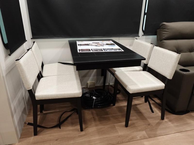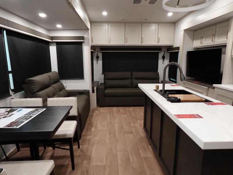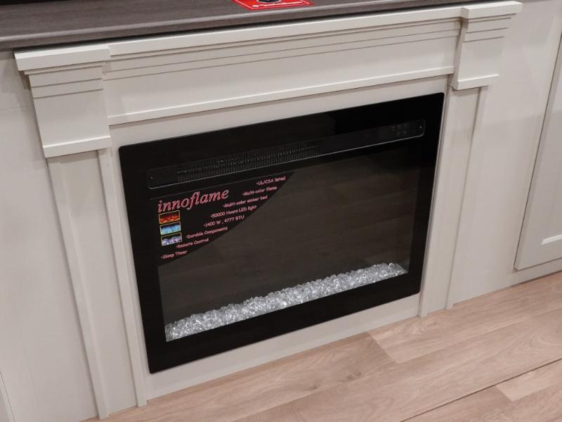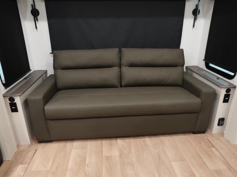A perfect fifth wheel featuring triple slides and a tri-fold sofa for overnight guests! You will love the spacious interior thanks to the dual opposing slides in the main living and kitchen area. Here you will find a kitchen island in the center and plenty of seating with a free standing dinette, theater seating for movie night opposite the fireplace and entertainment center, as well as a tri-fold sofa. The kitchen offers all of the amenities just like home, a 16 cu. ft. 12-volt refrigerator for your perishables, and a hutch with an electronics drawer to keep your gadgets organized. There is even a pet dish under the refrigerator for your furry friends. The spacious full bath includes a 48" x 30" shower, dual linen closets, and an accessory drawer for necessities.