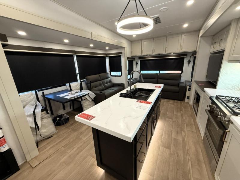 A perfect fifth wheel featuring triple slides and a tri-fold sofa for overnight guests! You will love the spacious interior thanks to the dual opposing slides in the main living and kitchen area. Here you will find a kitchen island in the center and plenty of seating with a free standing dinette, theater seating for movie night opposite the fireplace and entertainment center, as well as a tri-fold sofa. The kitchen offers all of the amenities just like home, a 16 cu. ft. 12-volt refrigerator for your perishables, and a hutch with an electronics drawer to keep your gadgets organized. There is even a pet dish under the refrigerator for your furry friends. The spacious full bath includes a 48" x 30" shower, dual linen closets, and an accessory drawer for necessities. You'll love the front bedroom with its queen bed slide out, slide top dresser, front wardrobe with washer and dryer prep, plus a pass-thru clothes hamper between the bedroom and bath; how convenient!