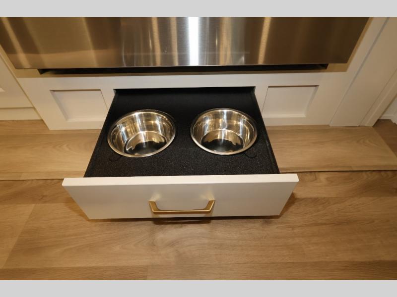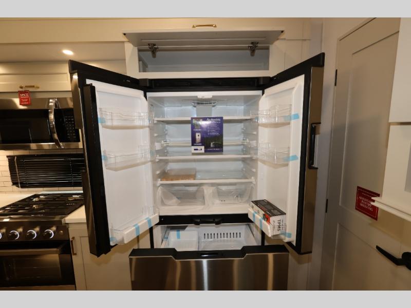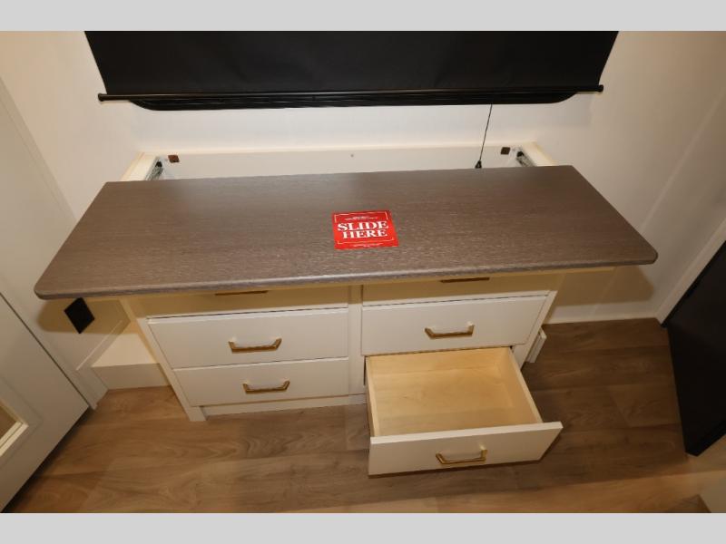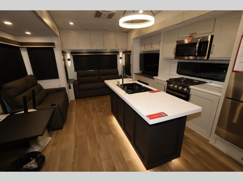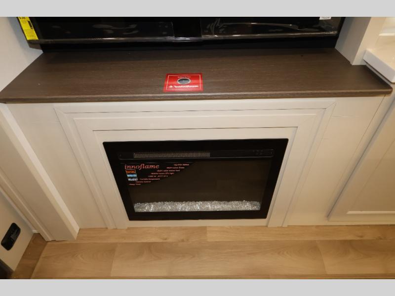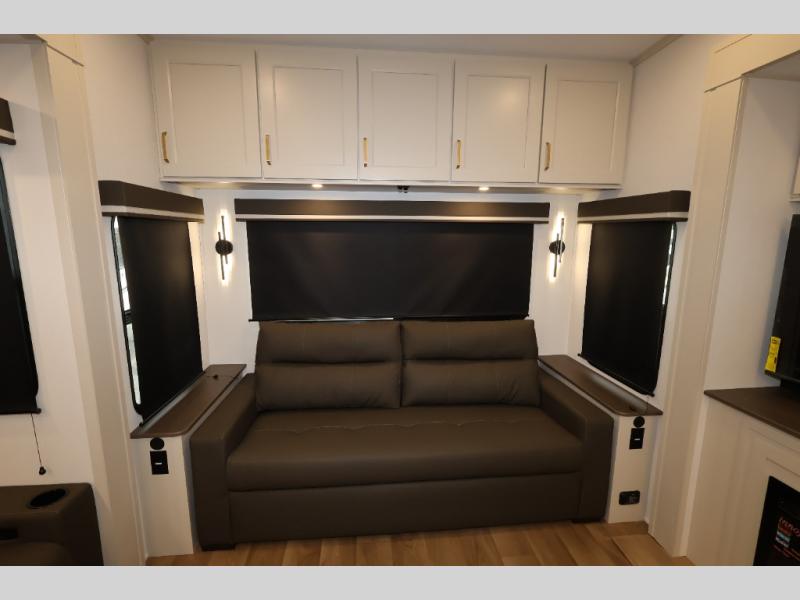 A perfect fifth wheel featuring triple slides and a tri-fold sofa for overnight guests! You will love the spacious interior thanks to the dual opposing slides in the main living and kitchen area. Here you will find a kitchen island in the center and plenty of seating with a free standing dinette, theater seating for movie night opposite the fireplace and entertainment center, as well as a tri-fold sofa. The kitchen offers all of the amenities just like home, a 16 cu. ft. 12-volt refrigerator for your perishables, and a hutch with an electronics drawer to keep your gadgets organized. There is even a pet dish under the refrigerator for your furry friends. The spacious full bath includes a 48" x 30" shower, dual linen closets, and an accessory drawer for necessities. You'll love the front bedroom with its queen bed slide out, slide top dresser, front wardrobe with washer and dryer prep, plus a pass-thru clothes hamper between the bedroom and bath; how convenient!