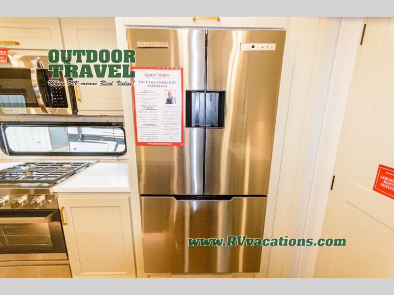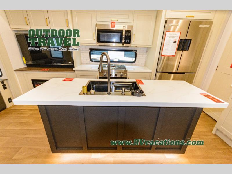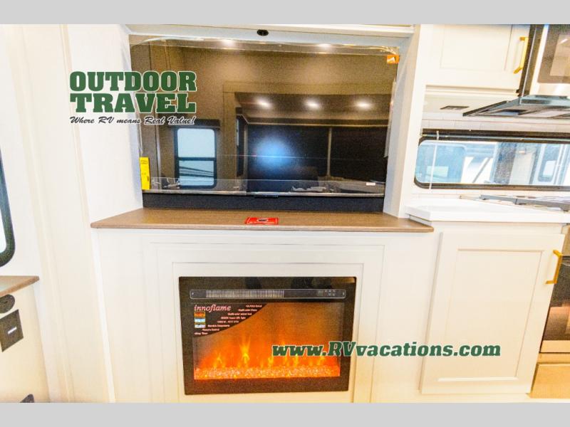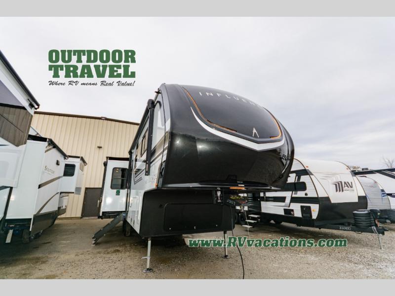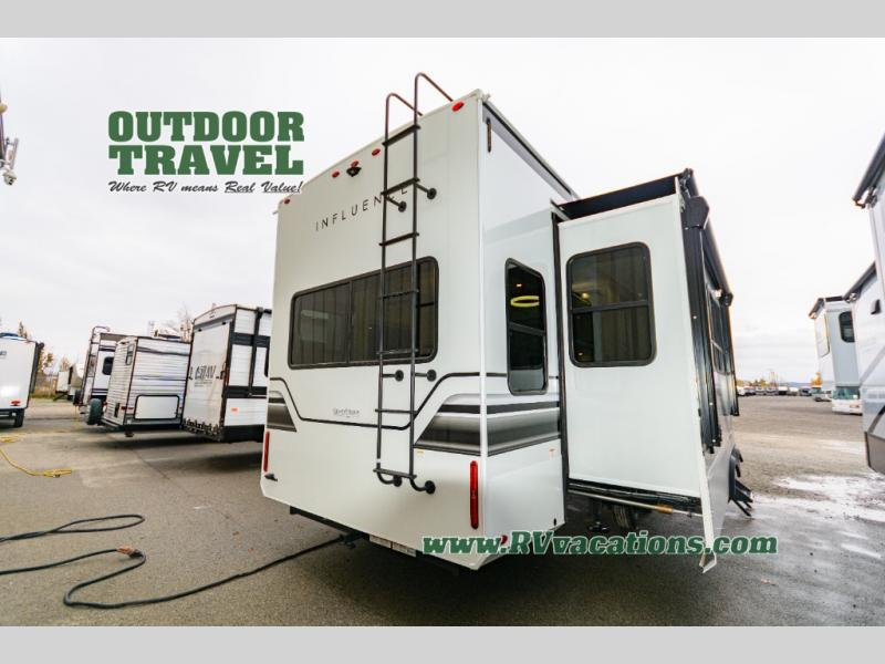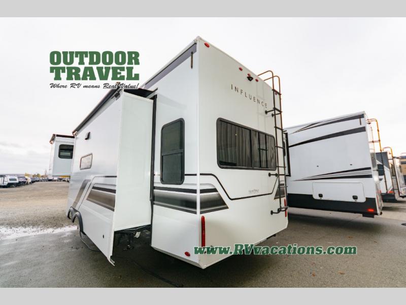 Any Grand Design Influence fifth wheel features five-sided aluminum cage construction with a walk-on roof and a fully enclosed underbelly with heated tanks and storage for all weather camping. For peace of mind, the MORryde CRE3000 Suspension system will provide safe and smooth towing, and the 101" widebody construction offers all the room you need and that is before multiple slides are fully engaged. You will appreciate the Keyed-Alike locks, slam-latch baggage doors with magnetic door catches, exterior security light, and SolidStep entry steps. On the inside, Congoleum flooring, premium roller shades for privacy, a hallway handrail for safety, and nightstands with USB ports to keep all of your electronics fully charged. You will also love the On Demand tankless water heater when showering, plus the added heat and ambiance from an electric fireplace, and so much more!