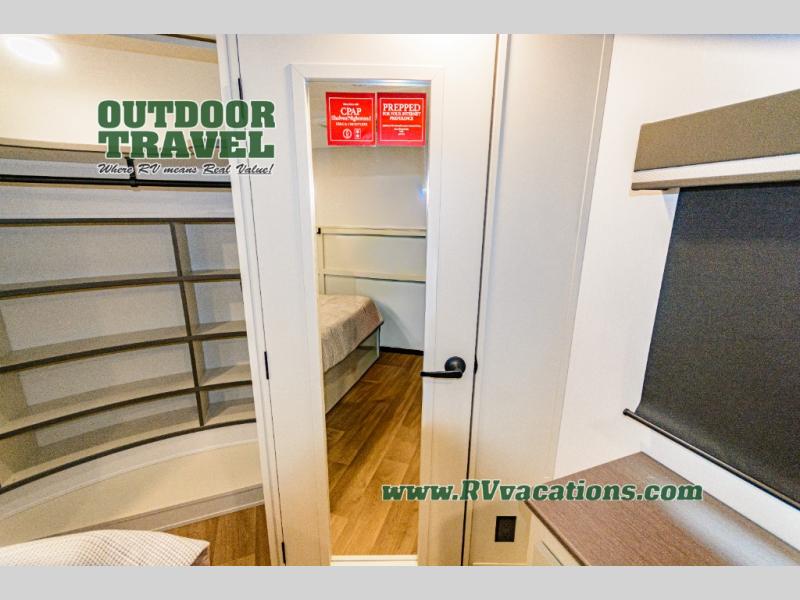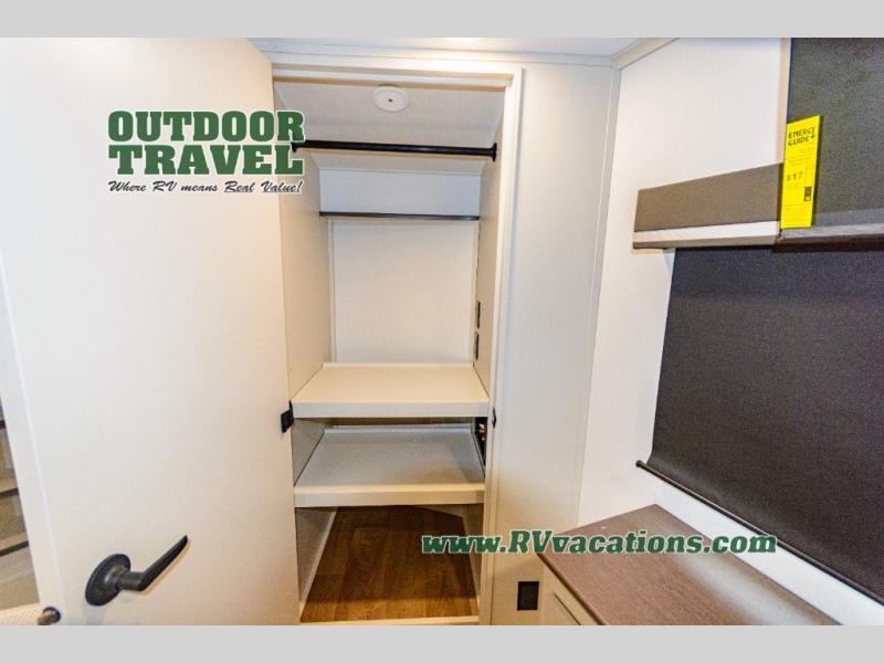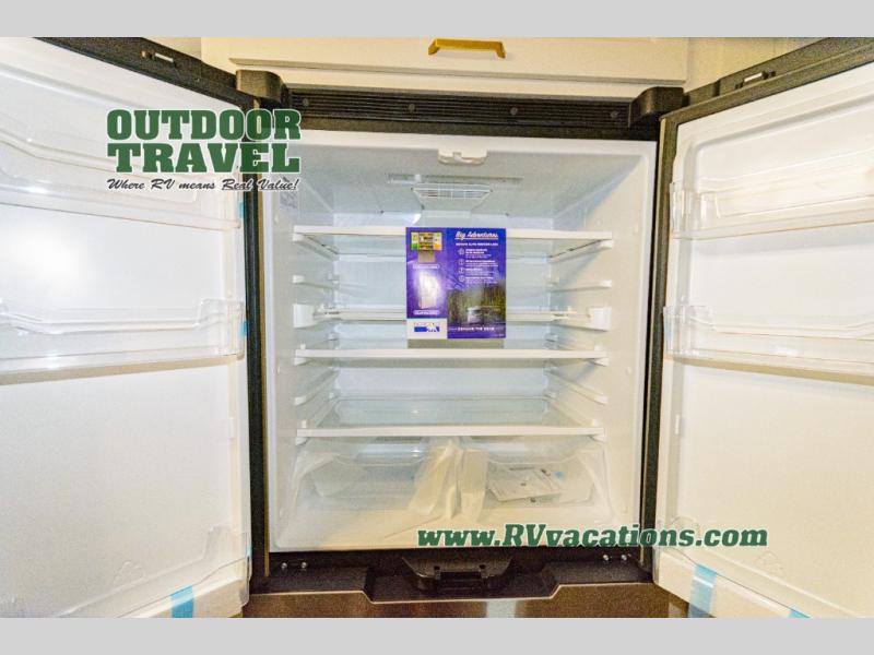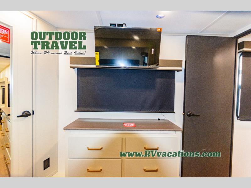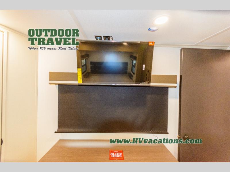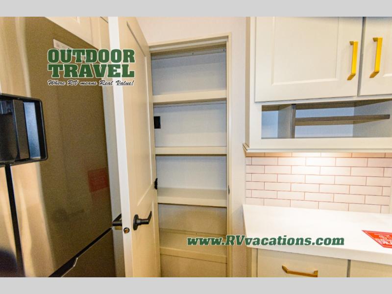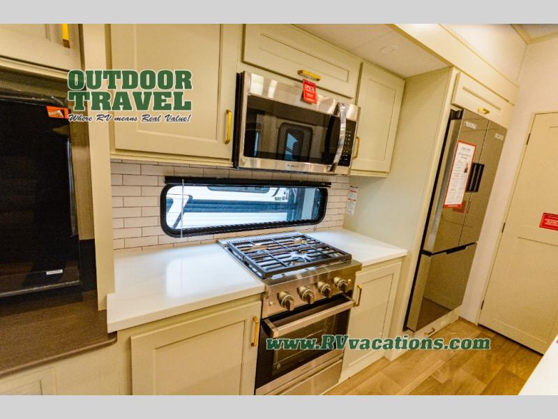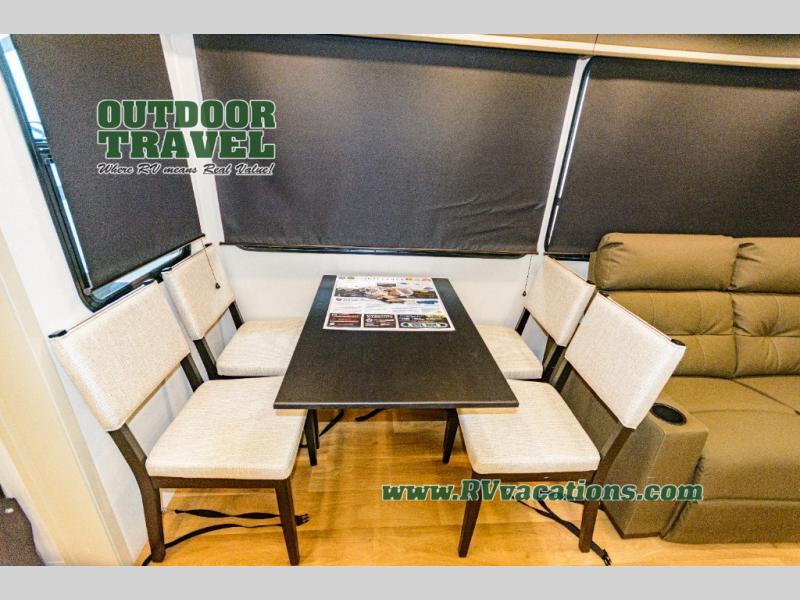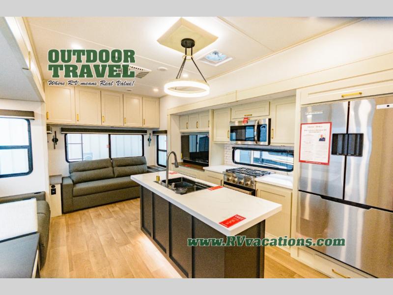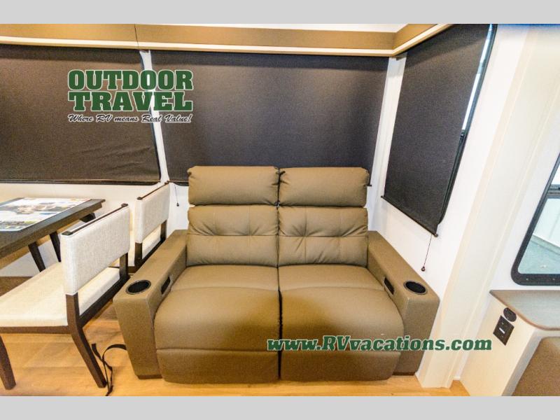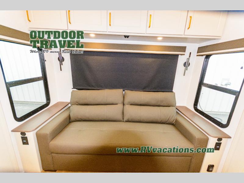A perfect fifth wheel featuring triple slides and a tri-fold sofa for overnight guests! You will love the spacious interior thanks to the dual opposing slides in the main living and kitchen area. Here you will find a kitchen island in the center and plenty of seating with a free standing dinette, theater seating for movie night opposite the fireplace and entertainment center, as well as a tri-fold sofa. The kitchen offers all of the amenities just like home, a 16 cu. ft. 12-volt refrigerator for your perishables, and a hutch with an electronics drawer to keep your gadgets organized. There is even a pet dish under the refrigerator for your furry friends. The spacious full bath includes a 48" x 30" shower, dual linen closets, and an accessory drawer for necessities. You'll love the front bedroom with its queen bed slide out, slide top dresser, front wardrobe with washer and dryer prep, plus a pass-thru clothes hamper between the bedroom and bath; how convenient!