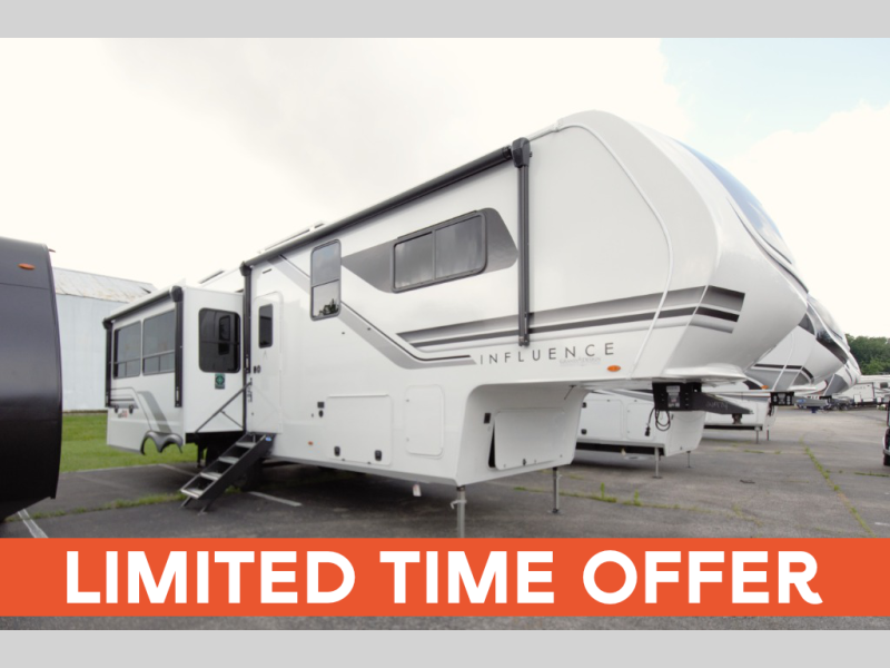 Grand Design Influence fifth wheels are built with durability and comfort in mind. Features include five-sided aluminum cage construction, a walk-on roof, and a fully enclosed, heated underbelly for all-season camping. The MORryde CRE3000 suspension system ensures a smooth, confident tow, while the 101" wide-body design provides exceptional interior room. Inside, you’ll enjoy Congoleum flooring, premium roller shades, USB charging ports, an on-demand tankless water heater, and thoughtful safety features like a hallway handrail and SolidStep entry steps.