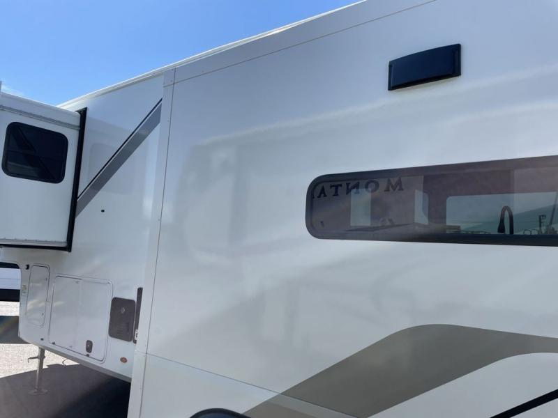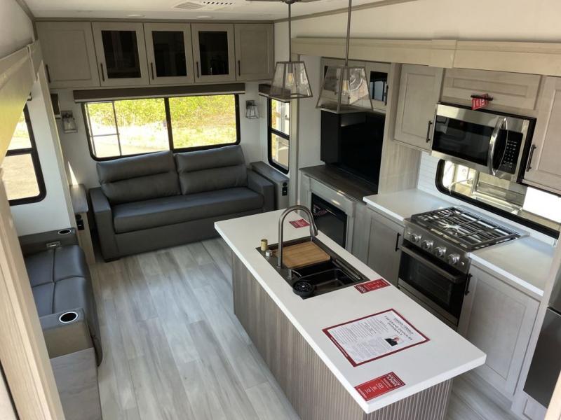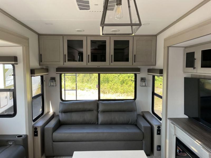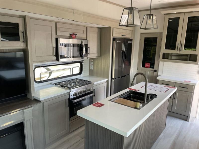 A perfect fifth wheel featuring triple slides and a tri-fold sofa for overnight guests! You will love the spacious interior thanks to the dual opposing slides in the main living and kitchen area. Here you will find a kitchen island in the center and plenty of seating with a free standing dinette, theater seating for movie night opposite the fireplace and entertainment center, as well as a tri-fold sofa. The kitchen offers all of the amenities just like home, a 16 cu. ft. 12-volt refrigerator for your perishables, and a hutch with an electronics drawer to keep your gadgets organized. There is even a pet dish under the refrigerator for your furry friends. The spacious full bath includes a 48" x 30" shower, dual linen closets, and an accessory drawer for necessities. You'll love the front bedroom with its queen bed slide out, slide top dresser, front wardrobe with washer and dryer prep, plus a pass-thru clothes hamper between the bedroom and bath; how convenient!