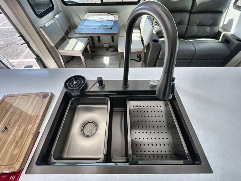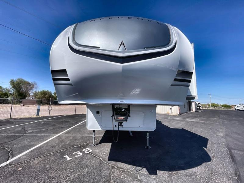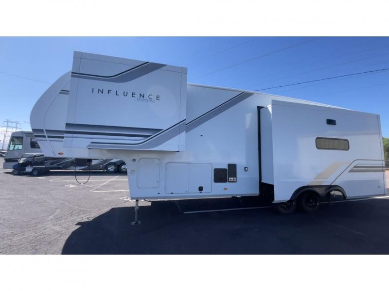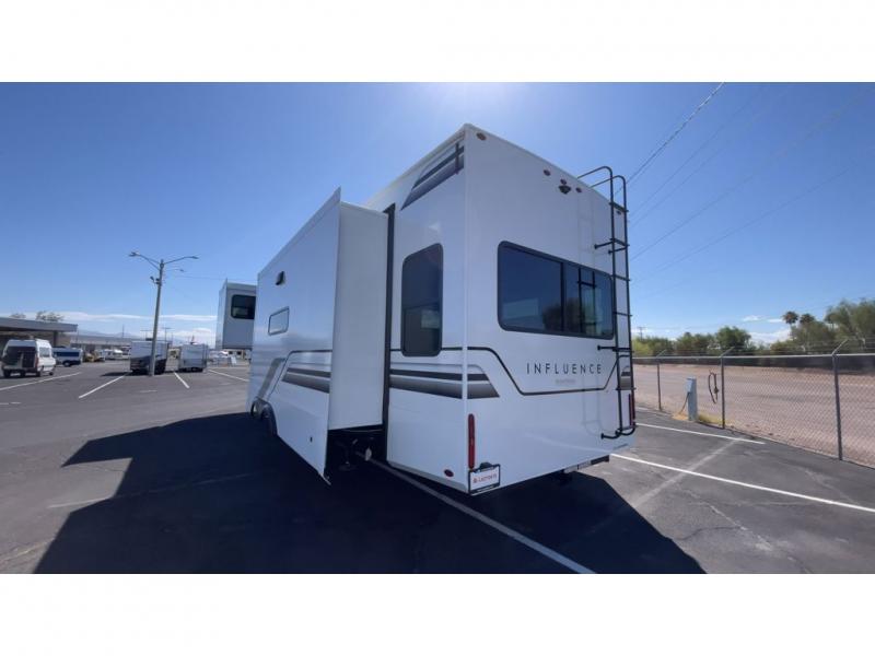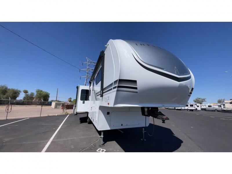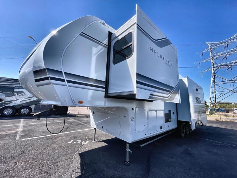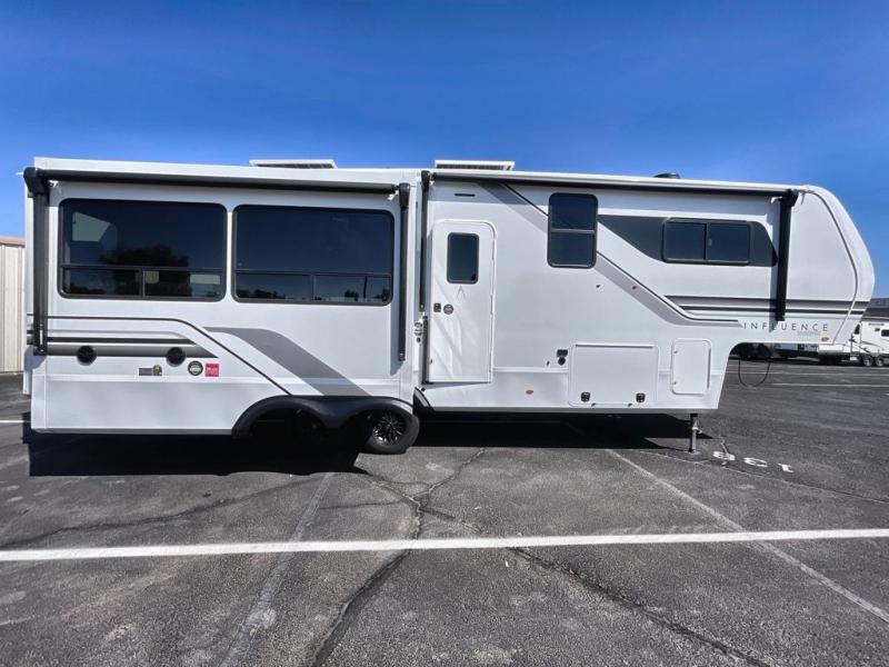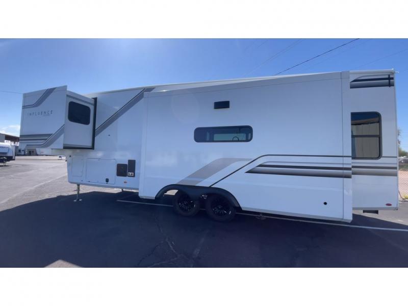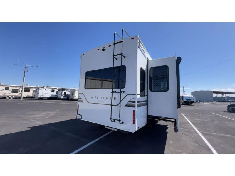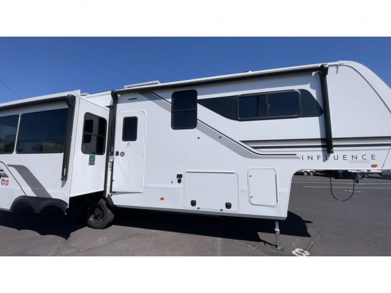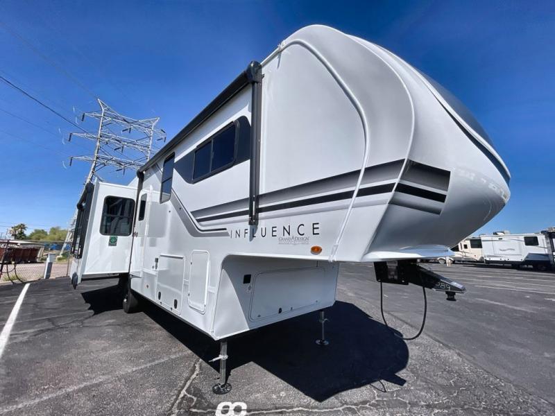Any Grand Design Influence fifth wheel features five-sided aluminum cage construction with a walk-on roof and a fully enclosed underbelly with heated tanks and storage for all weather camping. For peace of mind, the MORryde CRE3000 Suspension system will provide safe and smooth towing, and the 101" widebody construction offers all the room you need and that is before multiple slides are fully engaged. You will appreciate the Keyed-Alike locks, slam-latch baggage doors with magnetic door catches, exterior security light, and SolidStep entry steps. On the inside, Congoleum flooring, premium roller shades for privacy, a hallway handrail for safety, and nightstands with USB ports to keep all of your electronics fully charged. You will also love the On Demand tankless water heater when showering, plus the added heat and ambiance from an electric fireplace, and so much more!