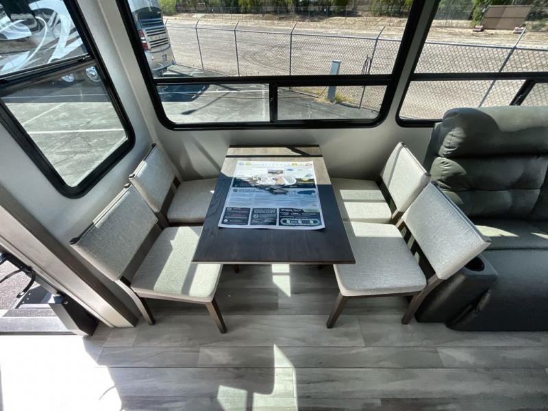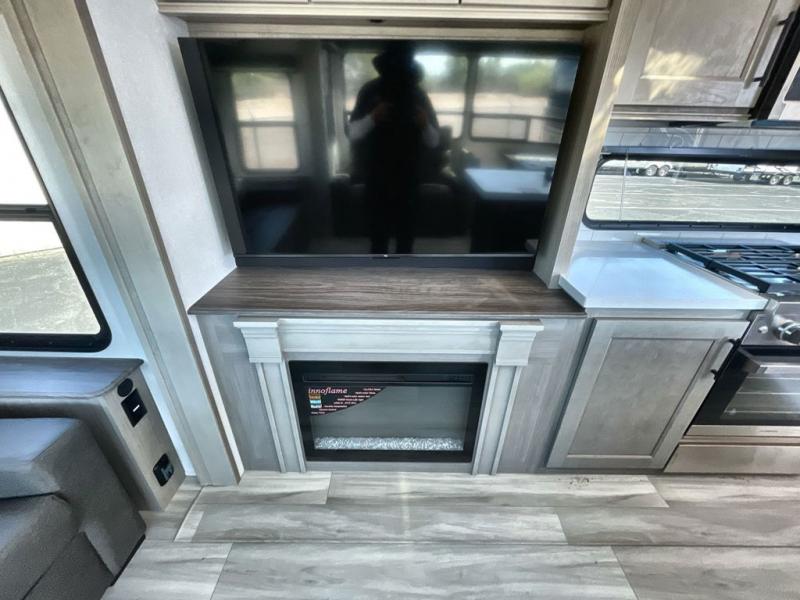 A perfect fifth wheel featuring triple slides and a tri-fold sofa for overnight guests! You will love the spacious interior thanks to the dual opposing slides in the main living and kitchen area. Here you will find a kitchen island in the center and plenty of seating with a free standing dinette, theater seating for movie night opposite the fireplace and entertainment center, as well as a tri-fold sofa. The kitchen offers all of the amenities just like home, a 16 cu. ft. 12-volt refrigerator for your perishables, and a hutch with an electronics drawer to keep your gadgets organized. There is even a pet dish under the refrigerator for your furry friends. The spacious full bath includes a 48" x 30" shower, dual linen closets, and an accessory drawer for necessities. You'll love the front bedroom with its queen bed slide out, slide top dresser, front wardrobe with washer and dryer prep, plus a pass-thru clothes hamper between the bedroom and bath; how convenient!