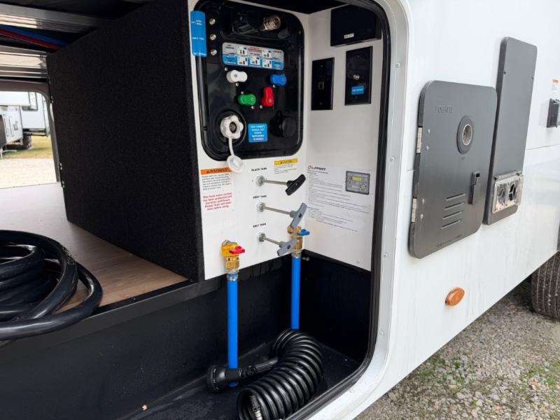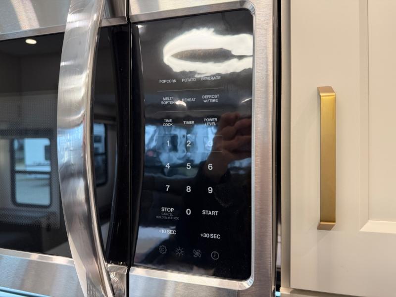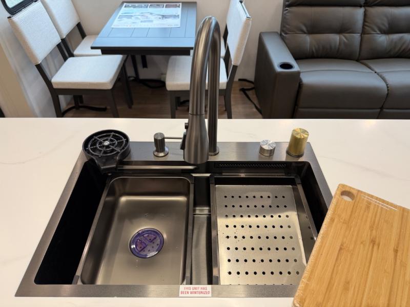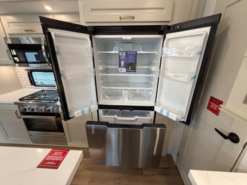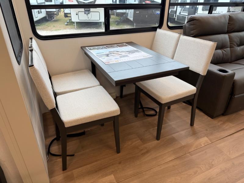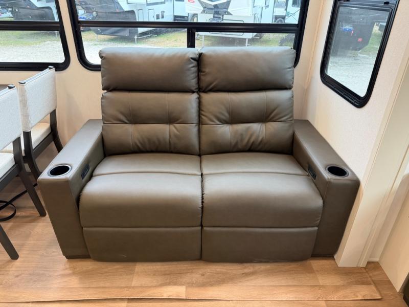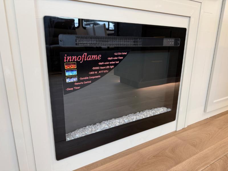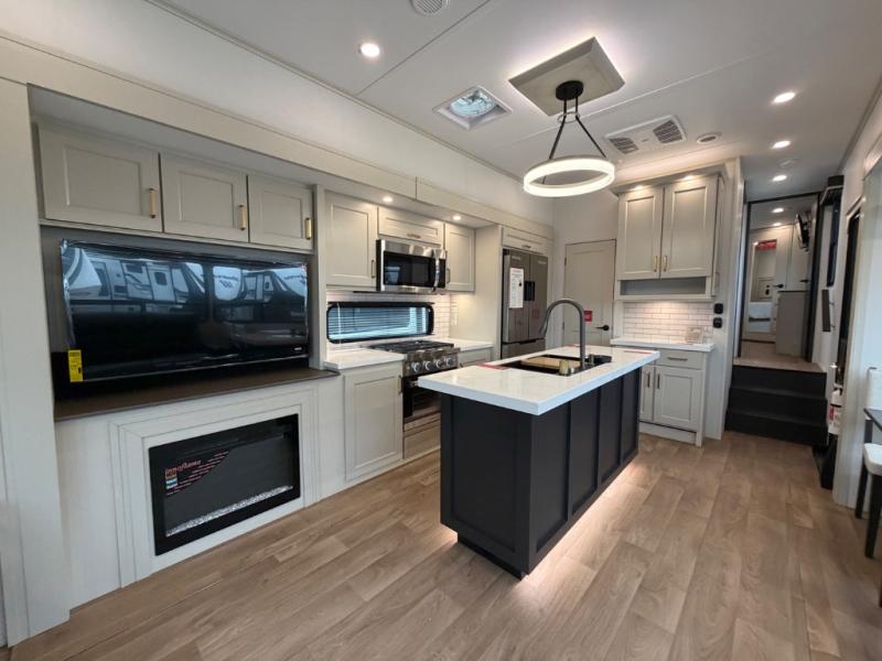 A perfect fifth wheel featuring triple slides and a tri-fold sofa for overnight guests! You will love the spacious interior thanks to the dual opposing slides in the main living and kitchen area. Here you will find a kitchen island in the center and plenty of seating with a free standing dinette, theater seating for movie night opposite the fireplace and entertainment center, as well as a tri-fold sofa. The kitchen offers all of the amenities just like home, a 16 cu. ft. 12-volt refrigerator for your perishables, and a hutch with an electronics drawer to keep your gadgets organized. There is even a pet dish under the refrigerator for your furry friends. The spacious full bath includes a 48" x 30" shower, dual linen closets, and an accessory drawer for necessities. You'll love the front bedroom with its queen bed slide out, slide top dresser, front wardrobe with washer and dryer prep, plus a pass-thru clothes hamper between the bedroom and bath; how convenient!