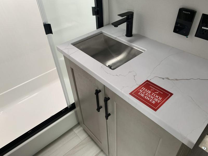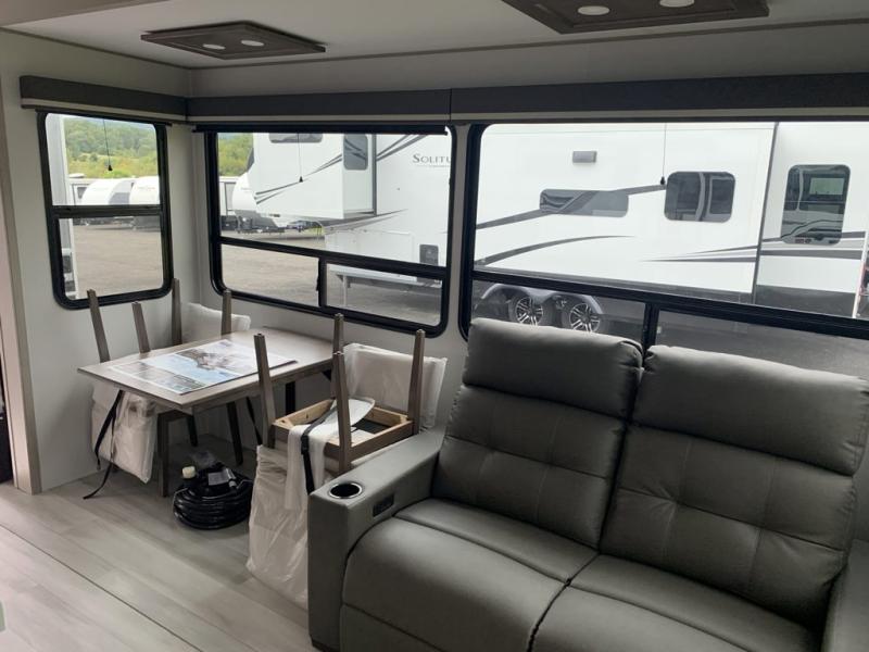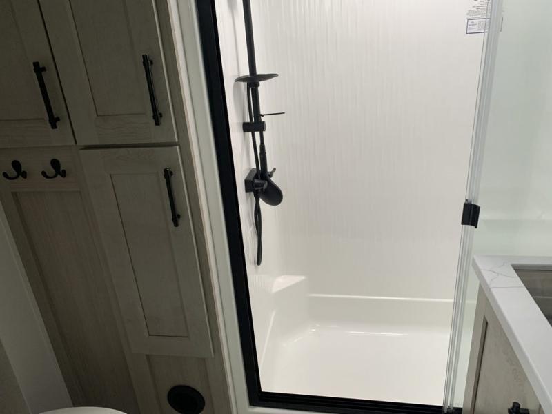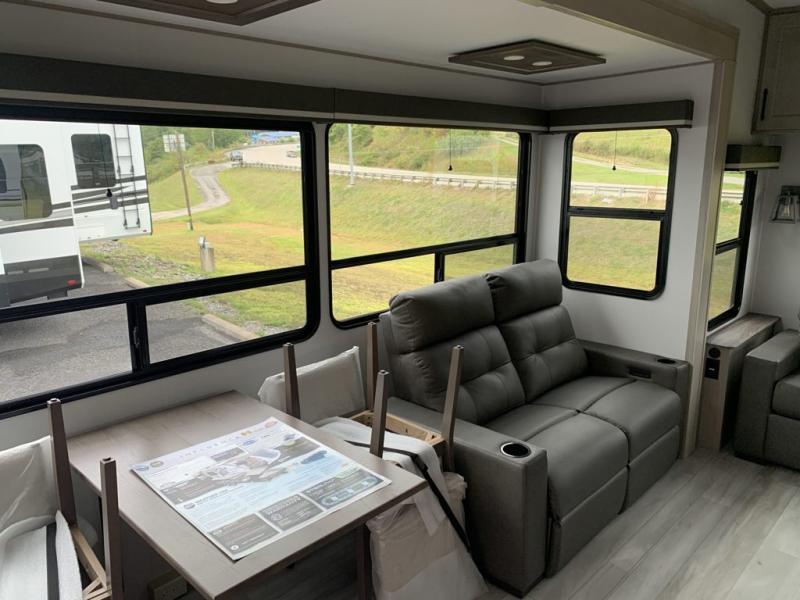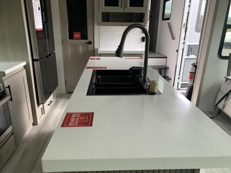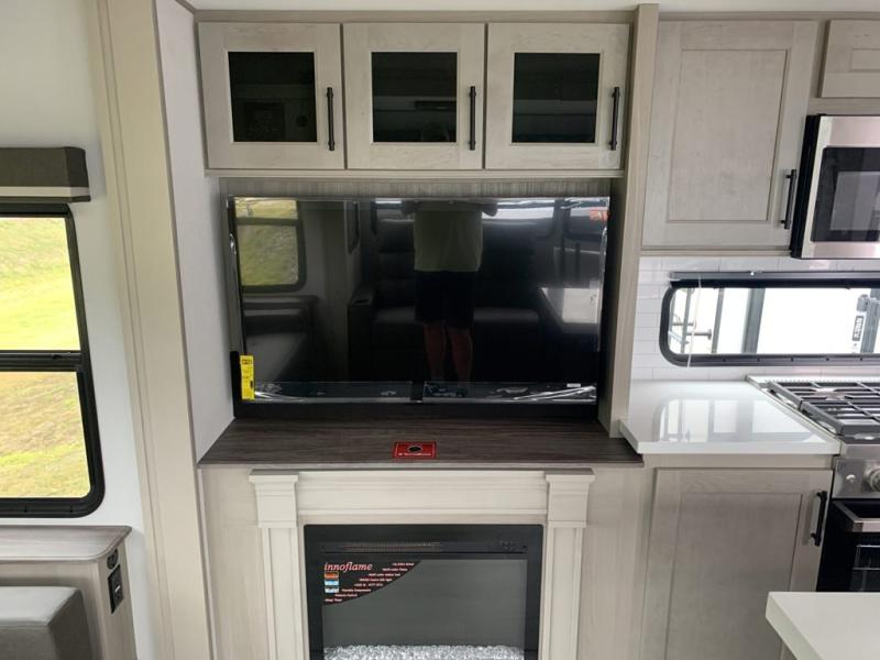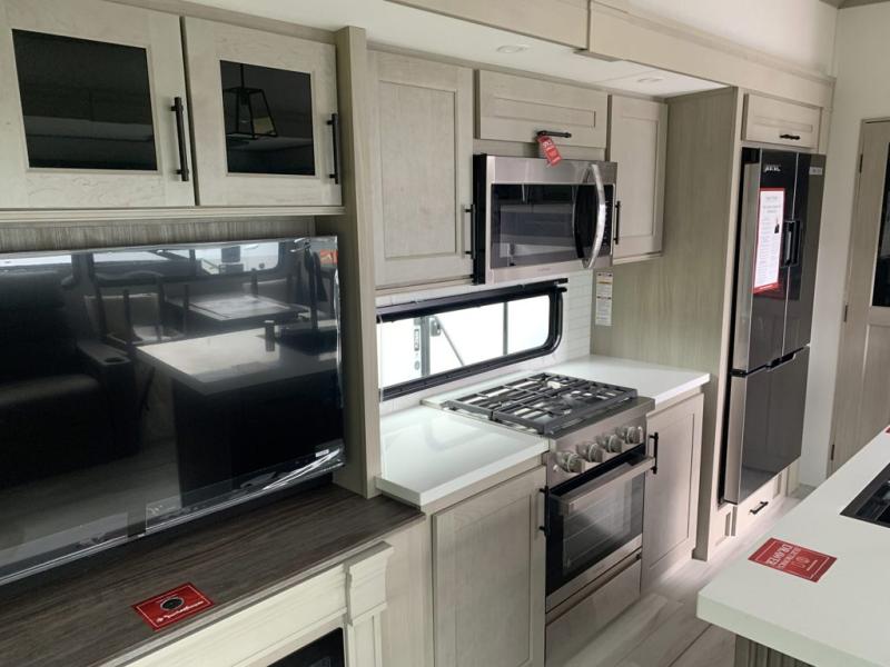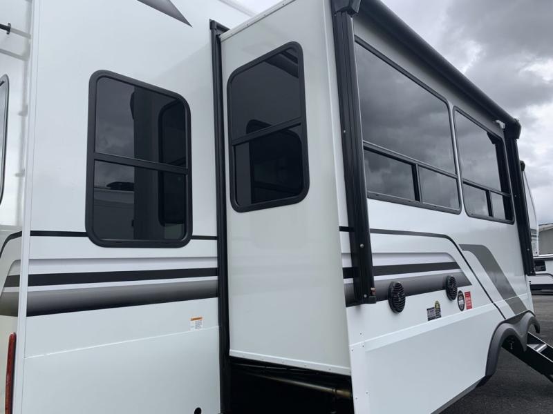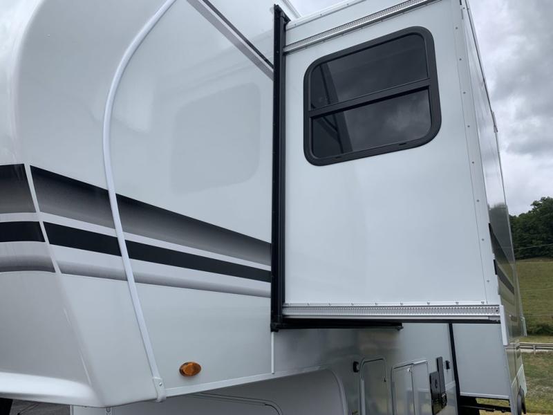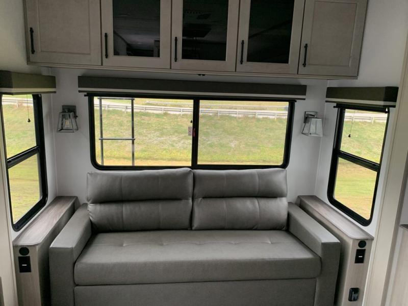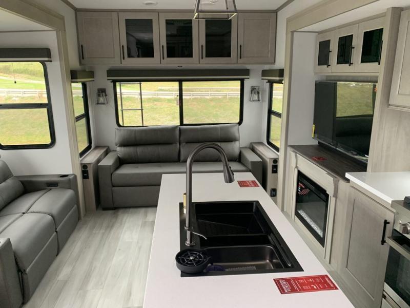 A perfect fifth wheel featuring triple slides and a tri-fold sofa for overnight guests! You will love the spacious interior thanks to the dual opposing slides in the main living and kitchen area. Here you will find a kitchen island in the center and plenty of seating with a free standing dinette, theater seating for movie night opposite the fireplace and entertainment center, as well as a tri-fold sofa. The kitchen offers all of the amenities just like home, a 16 cu. ft. 12-volt refrigerator for your perishables, and a hutch with an electronics drawer to keep your gadgets organized. There is even a pet dish under the refrigerator for your furry friends. The spacious full bath includes a 48" x 30" shower, dual linen closets, and an accessory drawer for necessities. You'll love the front bedroom with its queen bed slide out, slide top dresser, front wardrobe with washer and dryer prep, plus a pass-thru clothes hamper between the bedroom and bath; how convenient!