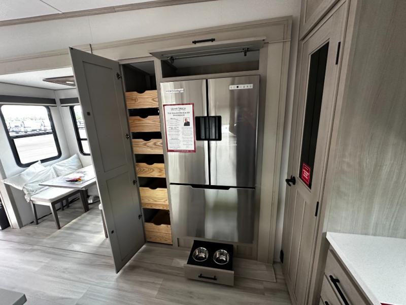 It will be so easy to enjoy camping trips in this triple slide out fifth wheel! You can wake up each morning in your own master bedroom with a queen bed slide out, a spacious closet with a clothes hamper plus washer and dryer prep, and a slide top dresser. You'll also find a private entry door into the dual entry bath and an accessory drawer to keep bath necessities organized. If you had any guests stay over, they can sleep on the L-shaped sofa with recliners. The chef of your group will love the rear kitchen with its U-shaped counterspace, ample storage, and 16 cu. ft. 12V refrigerator. There is even a convenient pull-out pet dish for your furry friends. Head outside to find two power awnings, exterior storage, and an exterior spray port to wash off hiking gear!