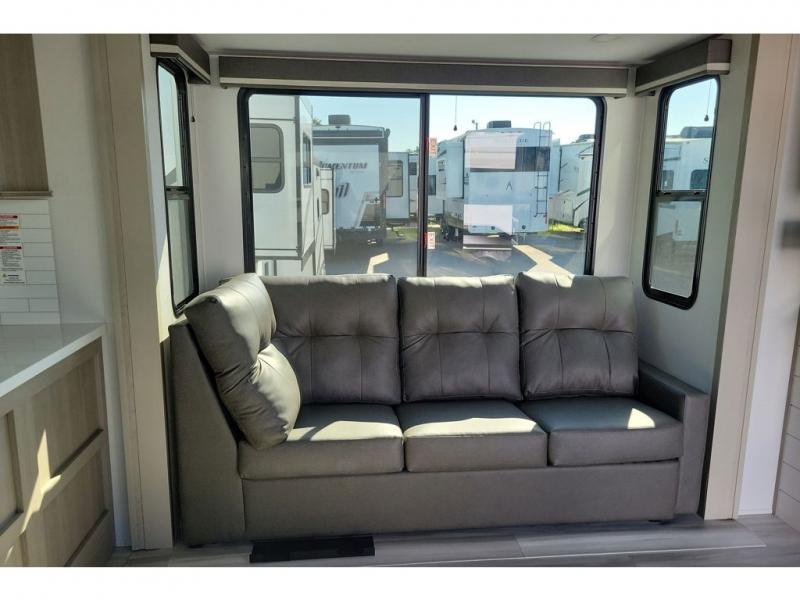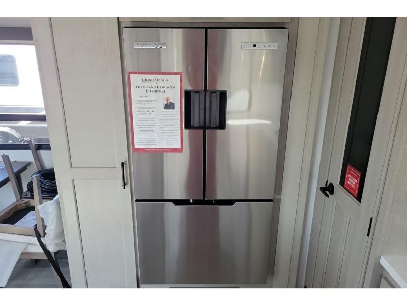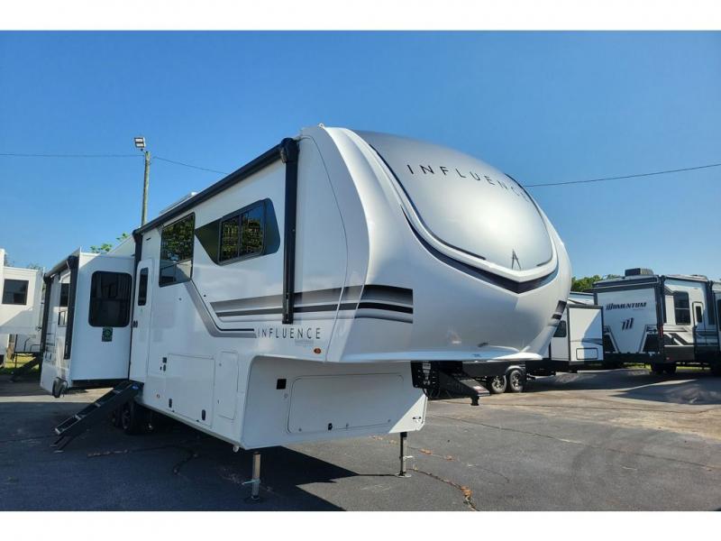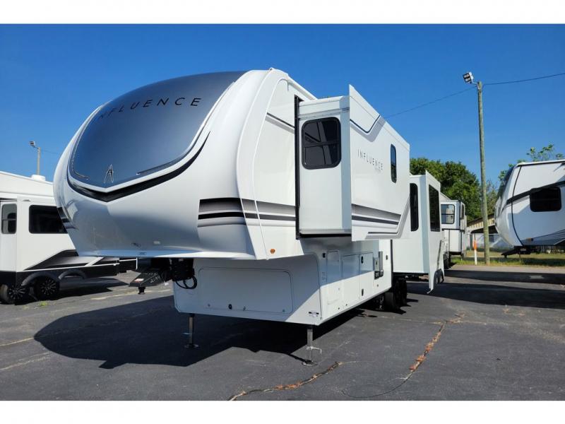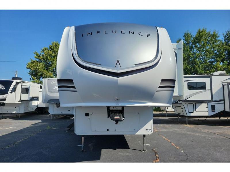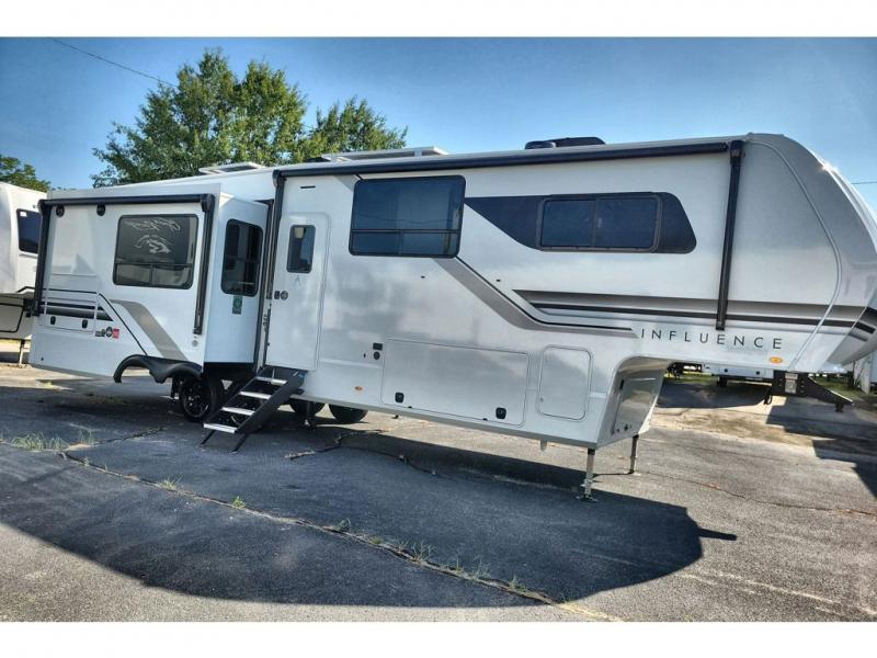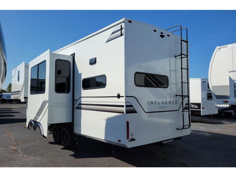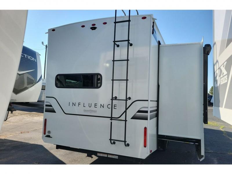 Any Grand Design Influence fifth wheel features five-sided aluminum cage construction with a walk-on roof and a fully enclosed underbelly with heated tanks and storage for all weather camping. For peace of mind, the MORryde CRE3000 Suspension system will provide safe and smooth towing, and the 101" widebody construction offers all the room you need and that is before multiple slides are fully engaged. You will appreciate the Keyed-Alike locks, slam-latch baggage doors with magnetic door catches, exterior security light, and SolidStep entry steps. On the inside, Congoleum flooring, premium roller shades for privacy, a hallway handrail for safety, and nightstands with USB ports to keep all of your electronics fully charged. You will also love the On Demand tankless water heater when showering, plus the added heat and ambiance from an electric fireplace, and so much more!