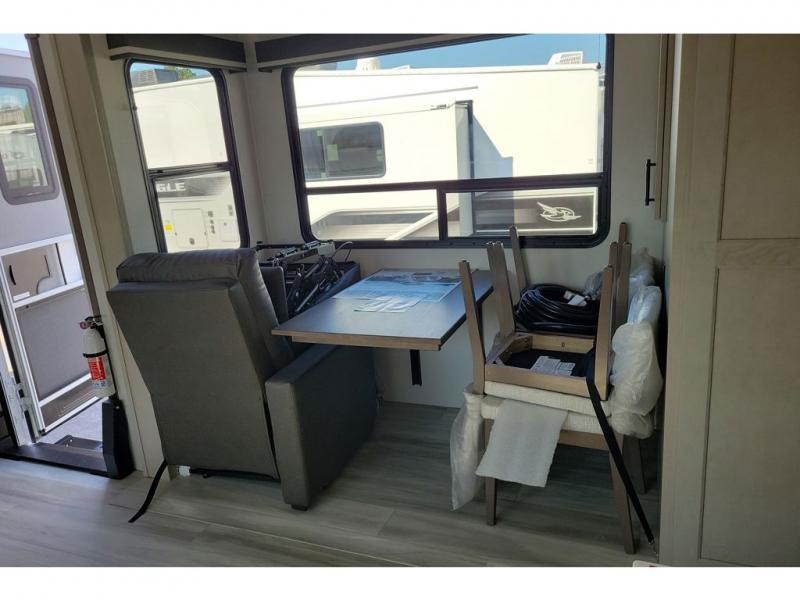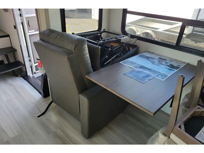 It will be so easy to enjoy camping trips in this triple slide out fifth wheel! You can wake up each morning in your own master bedroom with a queen bed slide out, a spacious closet with a clothes hamper plus washer and dryer prep, and a slide top dresser. You'll also find a private entry door into the dual entry bath and an accessory drawer to keep bath necessities organized. If you had any guests stay over, they can sleep on the L-shaped sofa with recliners. The chef of your group will love the rear kitchen with its U-shaped counterspace, ample storage, and 16 cu. ft. 12V refrigerator. There is even a convenient pull-out pet dish for your furry friends. Head outside to find two power awnings, exterior storage, and an exterior spray port to wash off hiking gear!