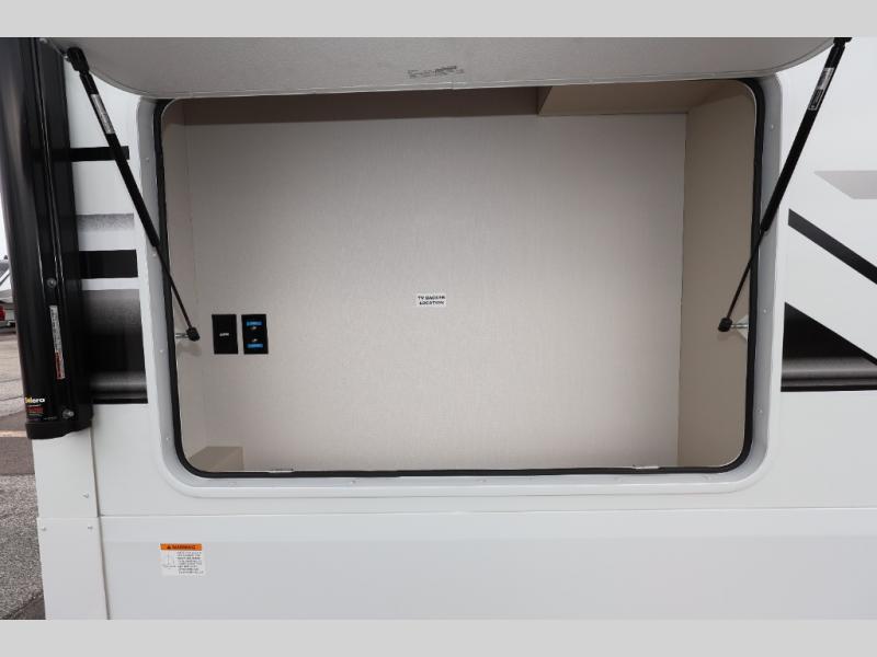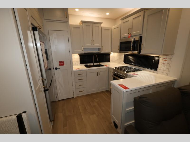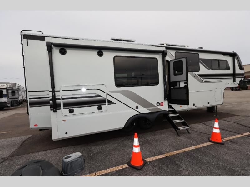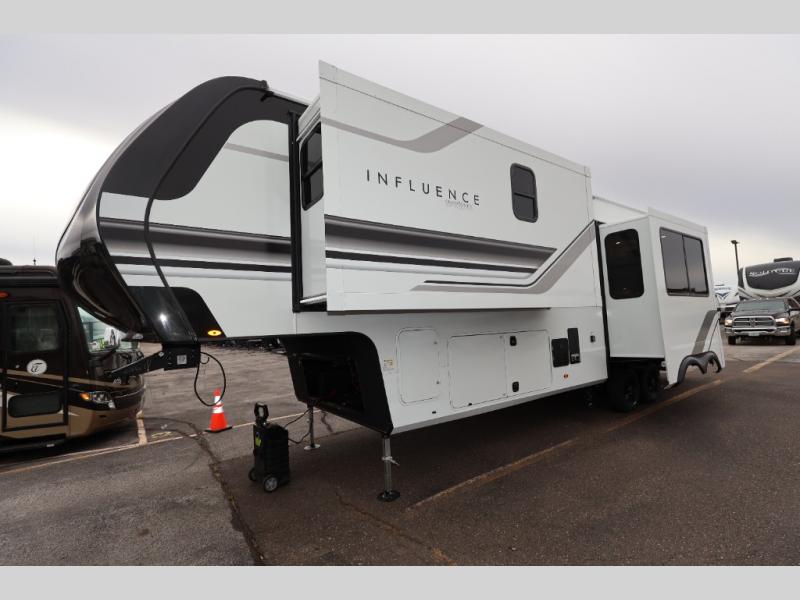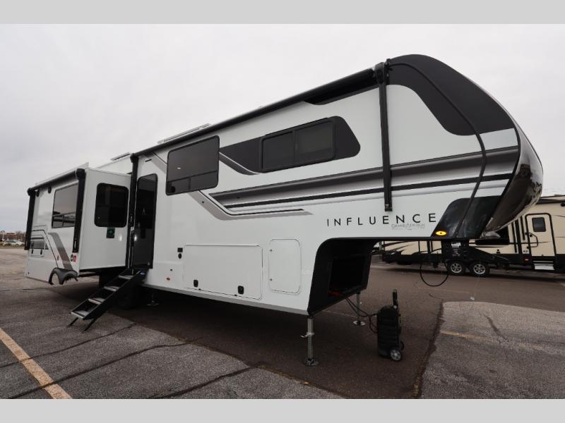 Any Grand Design Influence fifth wheel features five-sided aluminum cage construction with a walk-on roof and a fully enclosed underbelly with heated tanks and storage for all weather camping. For peace of mind, the MORryde CRE3000 Suspension system will provide safe and smooth towing, and the 101" widebody construction offers all the room you need and that is before multiple slides are fully engaged. You will appreciate the Keyed-Alike locks, slam-latch baggage doors with magnetic door catches, exterior security light, and SolidStep entry steps. On the inside, Congoleum flooring, premium roller shades for privacy, a hallway handrail for safety, and nightstands with USB ports to keep all of your electronics fully charged. You will also love the On Demand tankless water heater when showering, plus the added heat and ambiance from an electric fireplace, and so much more!