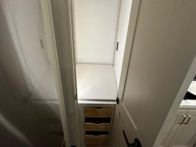 It will be so easy to enjoy camping trips in this triple slide out fifth wheel! You can wake up each morning in your own master bedroom with a queen bed slide out, a spacious closet with a clothes hamper plus washer and dryer prep, and a slide top dresser. You'll also find a private entry door into the dual entry bath and an accessory drawer to keep bath necessities organized. If you had any guests stay over, they can sleep on the L-shaped sofa with recliners. The chef of your group will love the rear kitchen with its U-shaped counterspace, ample storage, and 16 cu. ft. 12V refrigerator. There is even a convenient pull-out pet dish for your furry friends. Head outside to find two power awnings, exterior storage, and an exterior spray port to wash off hiking gear!