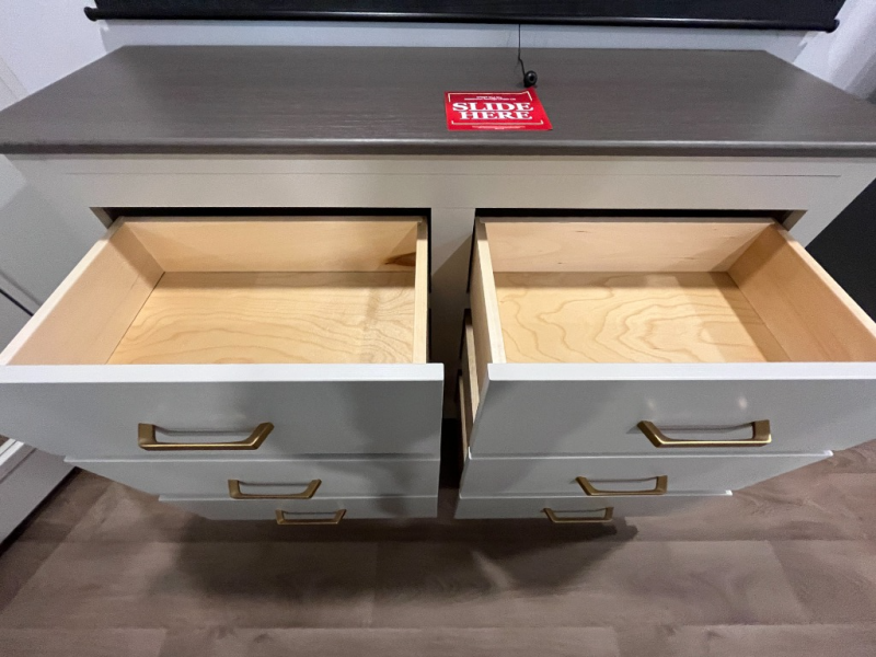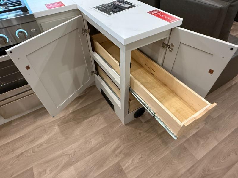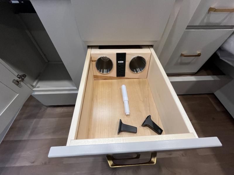 It will be so easy to enjoy camping trips in this triple slide out fifth wheel! You can wake up each morning in your own master bedroom with a queen bed slide out, a spacious closet with a clothes hamper plus washer and dryer prep, and a slide top dresser. You'll also find a private entry door into the dual entry bath and an accessory drawer to keep bath necessities organized. If you had any guests stay over, they can sleep on the L-shaped sofa with recliners. The chef of your group will love the rear kitchen with its U-shaped counterspace, ample storage, and 16 cu. ft. 12V refrigerator. There is even a convenient pull-out pet dish for your furry friends. Head outside to find two power awnings, exterior storage, and an exterior spray port to wash off hiking gear!