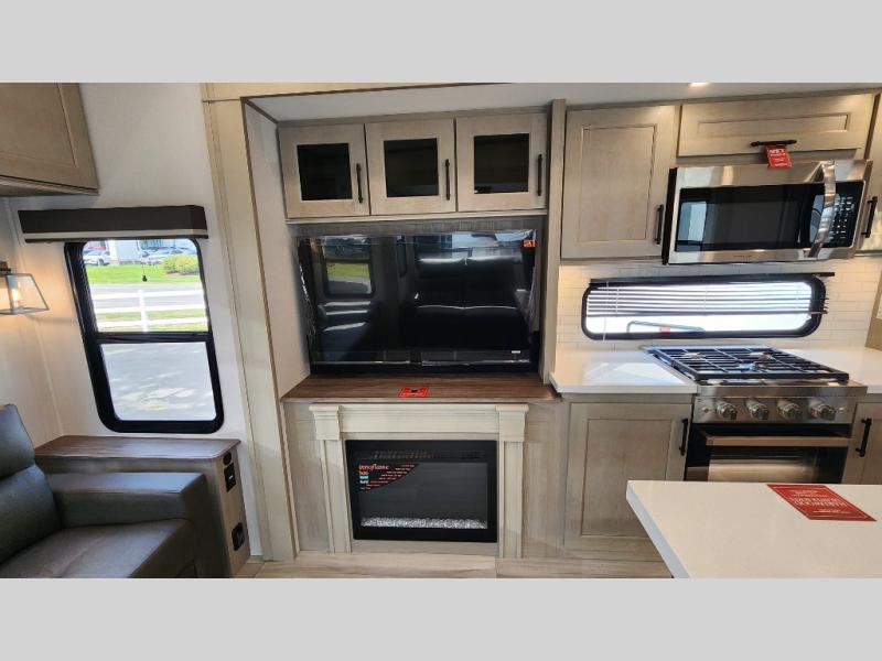 This Unit Features $26,026 in Options Featuring a Front Private Bedroom with King Bed; Fireplace; Kitchen Island; Free Standing Dinette; 2nd Patio Awning; Two 330W Solar Panels; Pass-Through Storage!