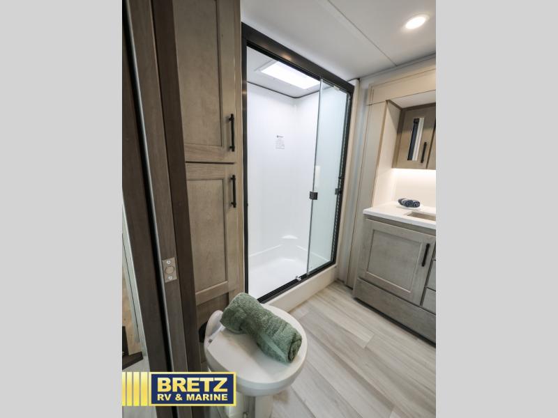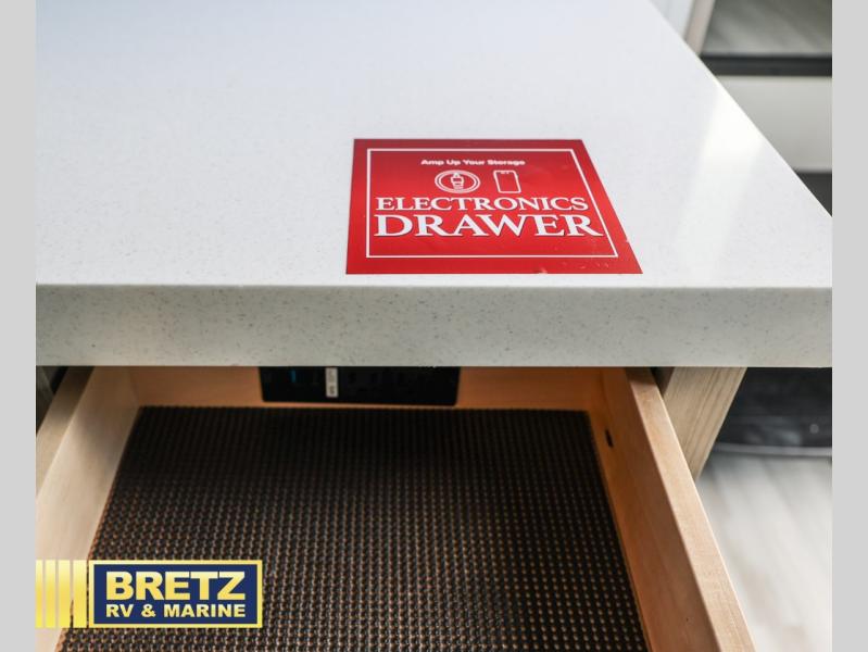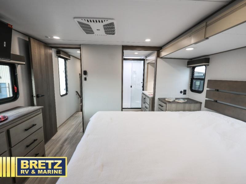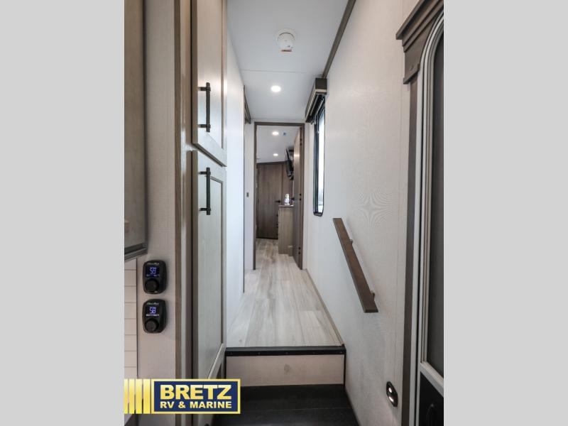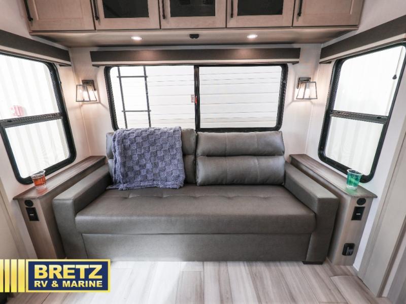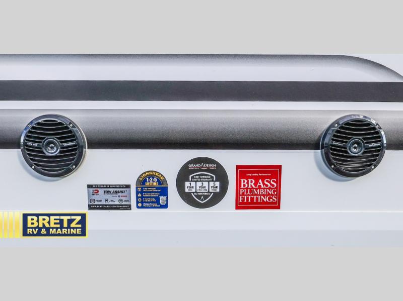 Any Grand Design Influence fifth wheel features five-sided aluminum cage construction with a walk-on roof and a fully enclosed underbelly with heated tanks and storage for all weather camping. For peace of mind, the MORryde CRE3000 Suspension system will provide safe and smooth towing, and the 101" widebody construction offers all the room you need and that is before multiple slides are fully engaged. You will appreciate the Keyed-Alike locks, slam-latch baggage doors with magnetic door catches, exterior security light, and SolidStep entry steps. On the inside, Congoleum flooring, premium roller shades for privacy, a hallway handrail for safety, and nightstands with USB ports to keep all of your electronics fully charged. You will also love the On Demand tankless water heater when showering, plus the added heat and ambiance from an electric fireplace, and so much more!
