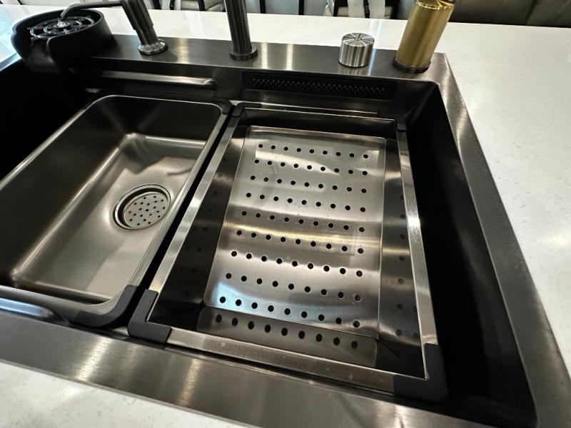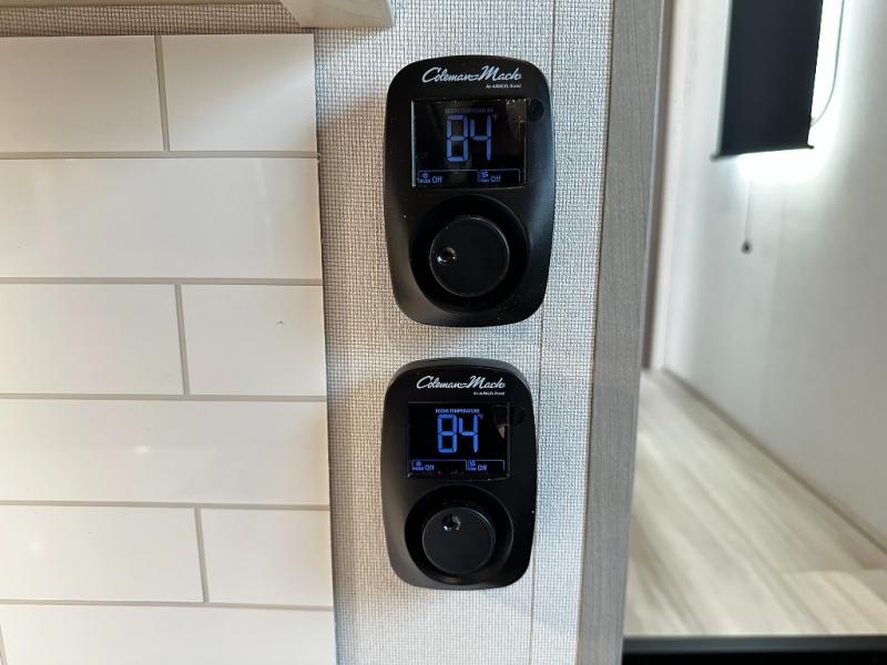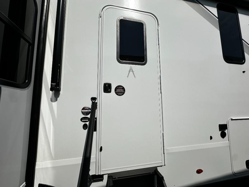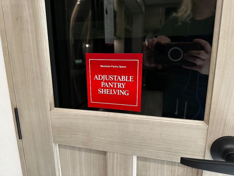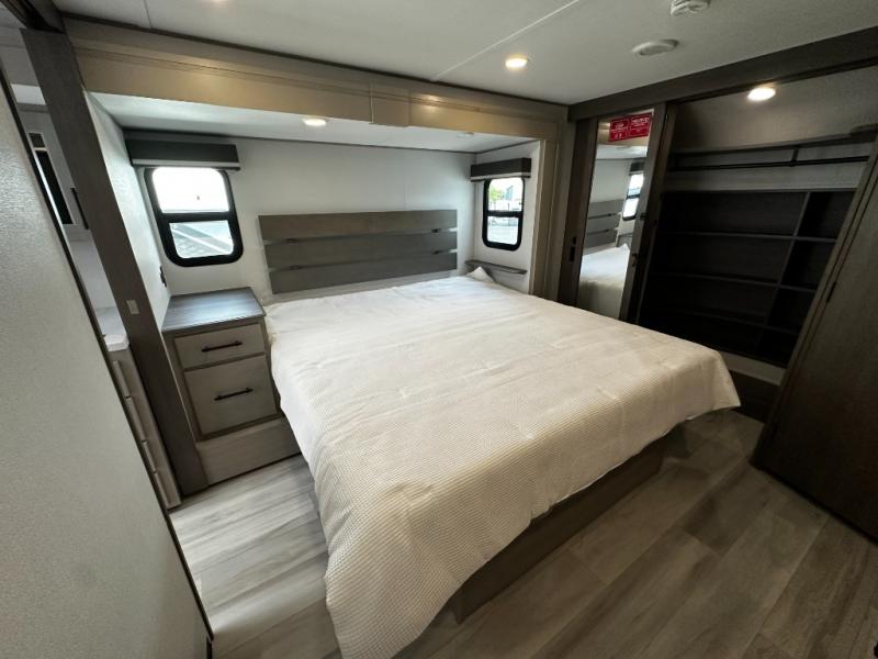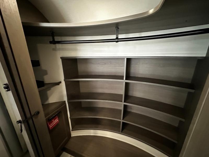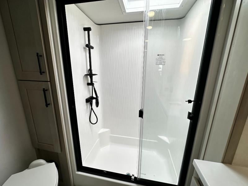 The front master suite is designed for ultimate comfort, offering a walk-around king bed, dual wardrobes, overhead storage, and privacy doors. The full bathroom includes a large shower, vanity with ample storage, and thoughtful design details, ensuring that you have a residential feel even while on the road.