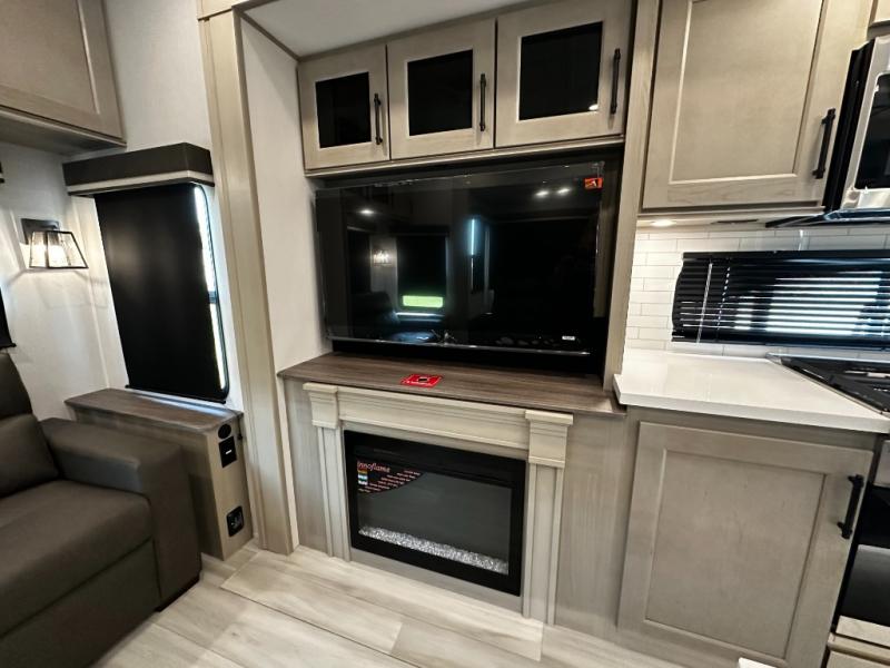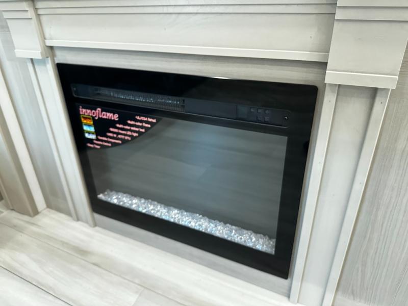 The rear-living layout provides a bright, open environment ideal for relaxing, entertaining, and enjoying every moment on the road. Theater seating, a plush sofa, and a centrally located entertainment center with a large TV and optional fireplace offer comfort and convenience, while panoramic windows fill the space with natural light and bring the outdoors in.