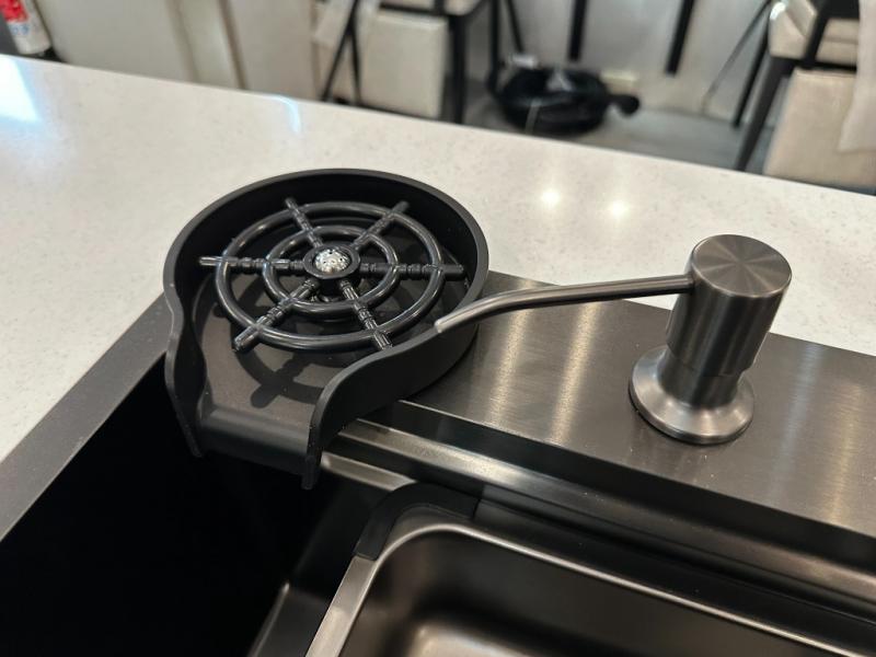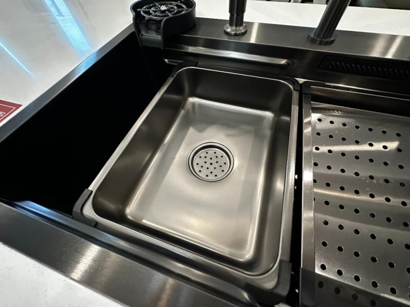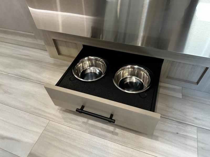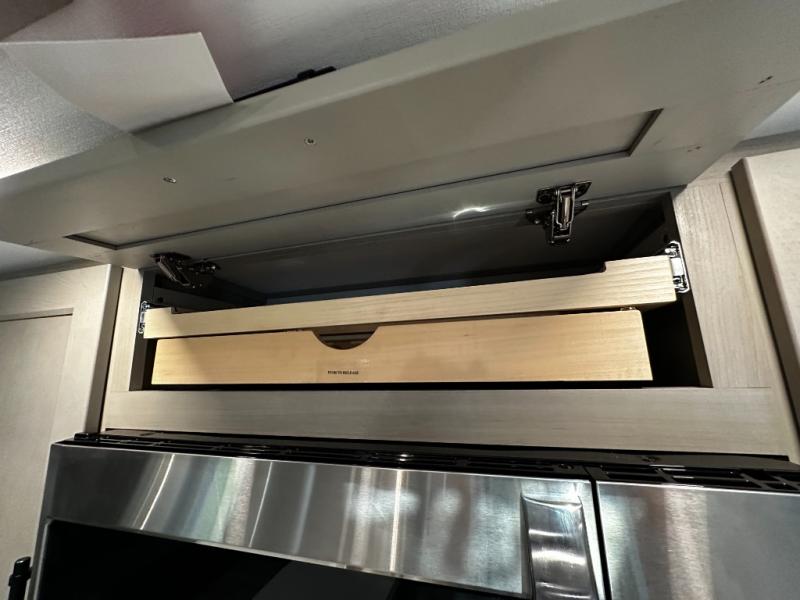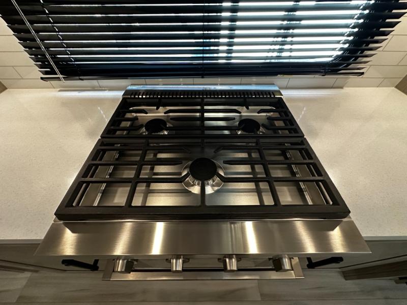 The chef-inspired kitchen features solid-surface countertops, a three-burner cooktop, residential-style refrigerator, microwave, and abundant cabinet space, allowing you to prepare meals with ease no matter where your journey takes you. A dinette provides a versatile space for dining, games, or work, making the motorhome equally functional for everyday living and travel adventures.