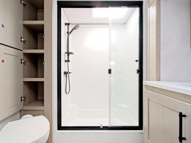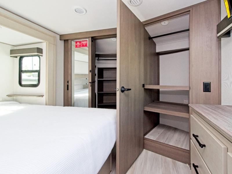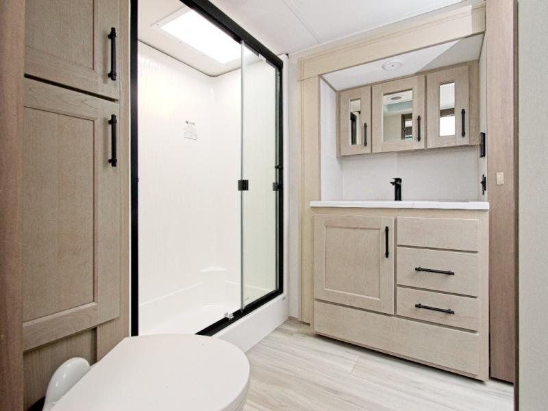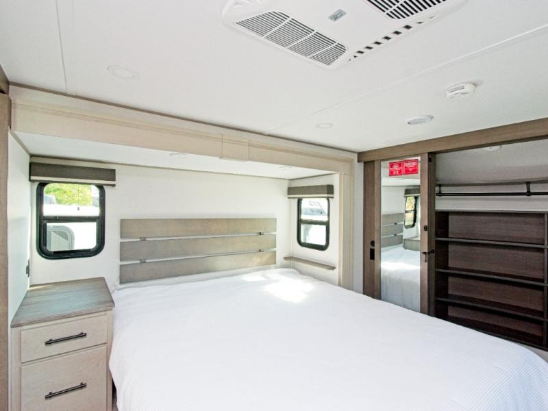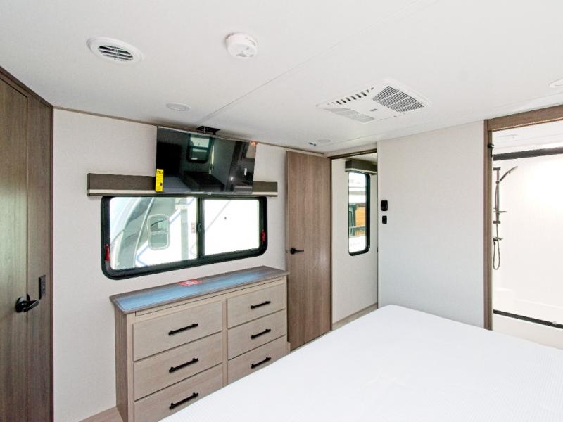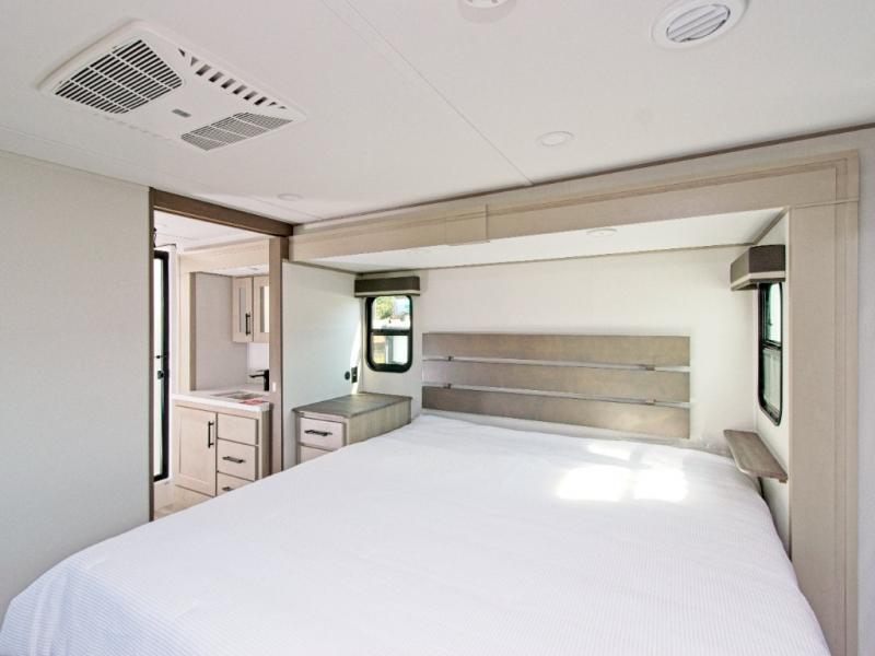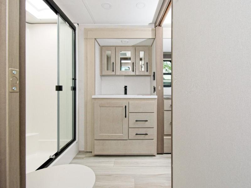 Step up into your private front bedroom, featuring a queen bed slide, nightstands with USB ports, and washer/dryer prep for added convenience. The dual-entry bathroom ensures easy access from both the bedroom and hallway, complete with premium fixtures and a spacious shower.