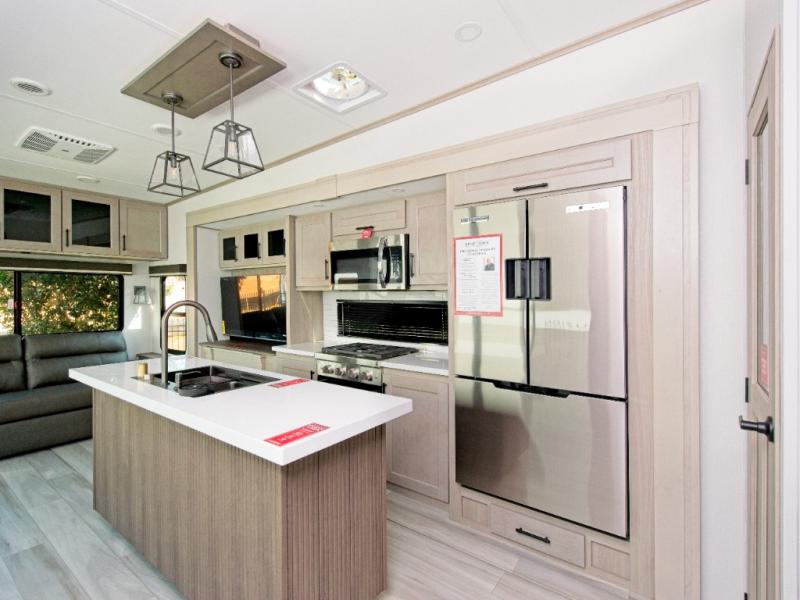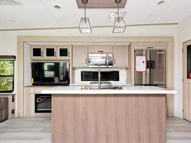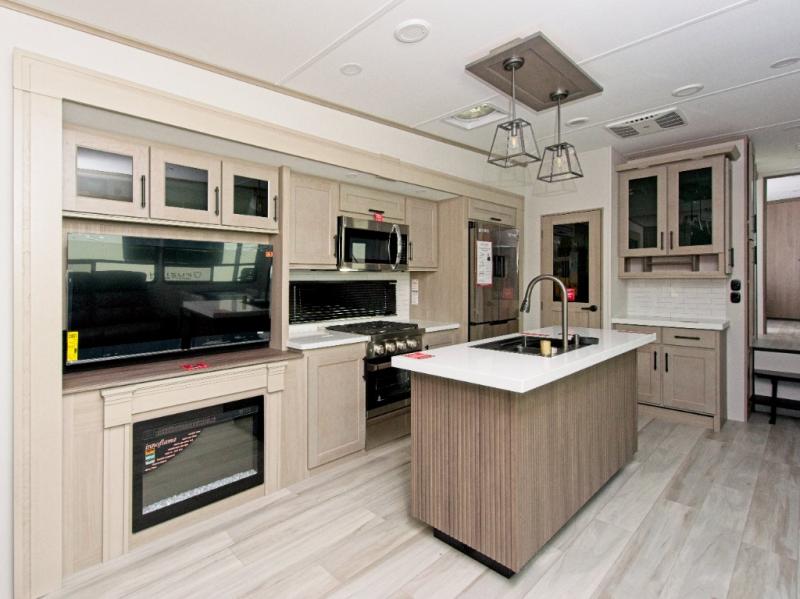 The Grand Design Influence 3503GK delivers residential luxury on the road with a spacious kitchen island and a cozy electric fireplace—perfect for couples who love to travel in comfort.