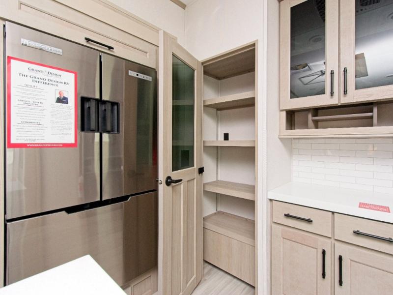 Enjoy movie nights in plush theater seating across from the fireplace and entertainment center, or savor meals at the elegant free-standing dinette. The center kitchen island adds extra prep space and includes a deep sink, making cooking and cleanup a breeze. You'll find a 16 cu. ft. 12V refrigerator, pantry, and hutch for all your food and kitchen essentials—plus a built-in pet dish for your furry companion.