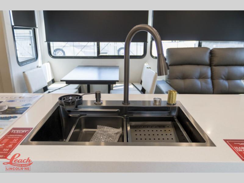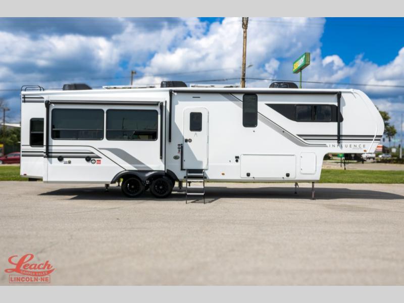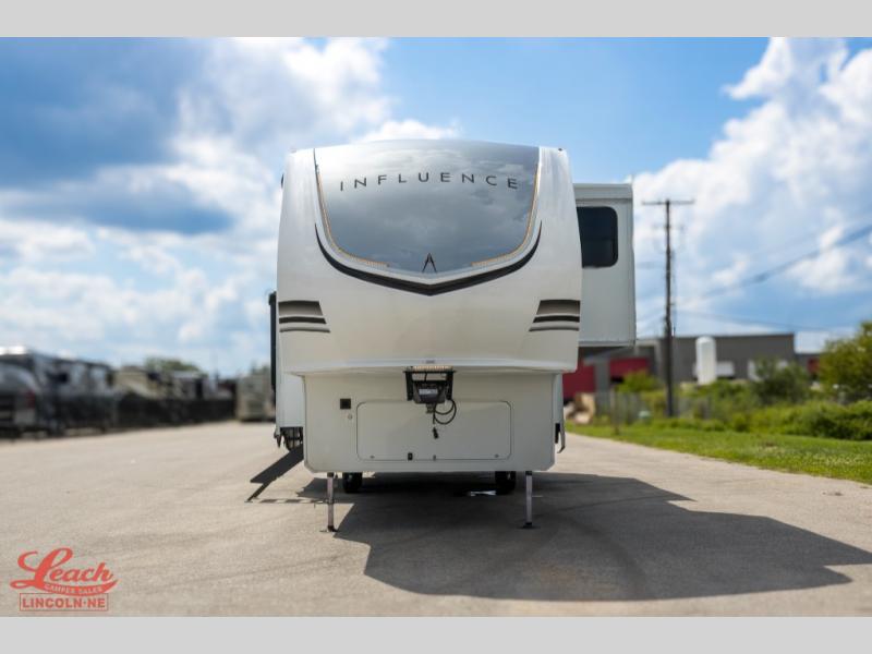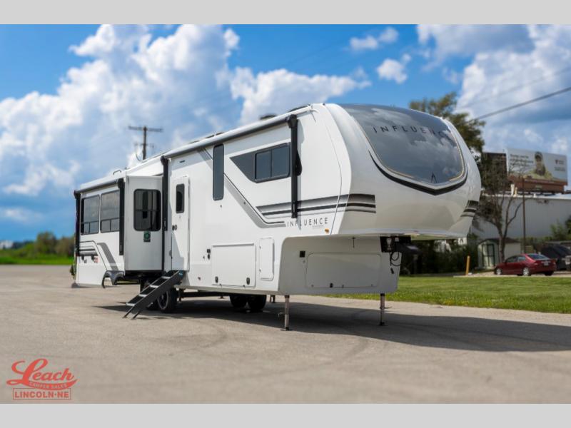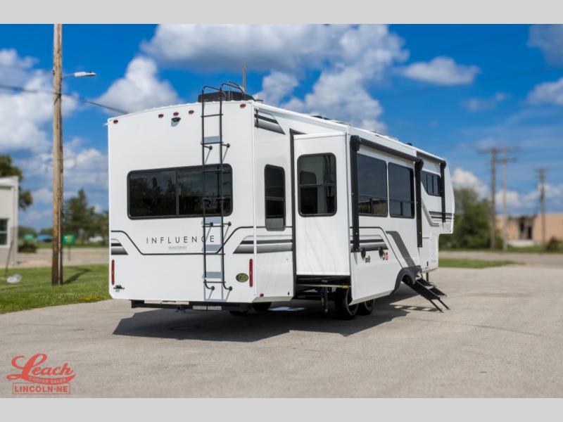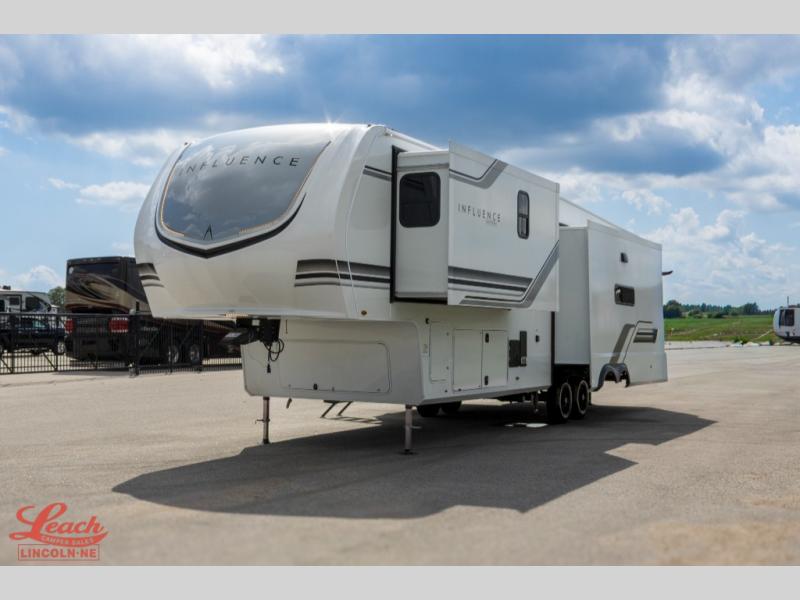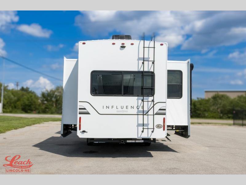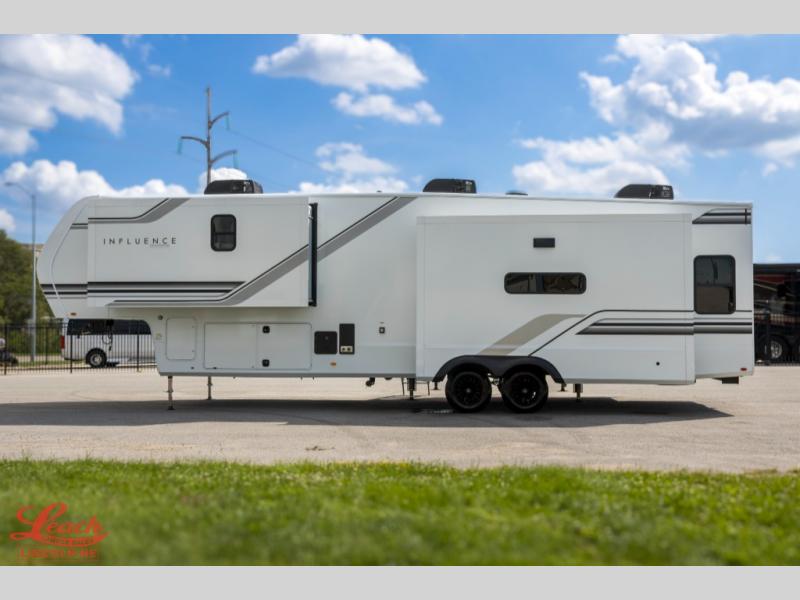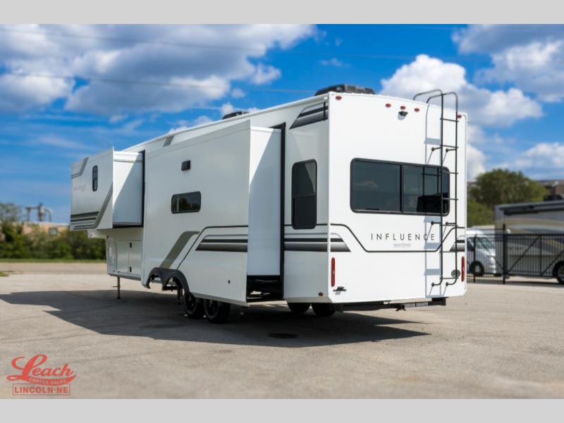 Any Grand Design Influence fifth wheel features five-sided aluminum cage construction with a walk-on roof and a fully enclosed underbelly with heated tanks and storage for all weather camping. For peace of mind, the MORryde CRE3000 Suspension system will provide safe and smooth towing, and the 101" widebody construction offers all the room you need and that is before multiple slides are fully engaged. You will appreciate the Keyed-Alike locks, slam-latch baggage doors with magnetic door catches, exterior security light, and SolidStep entry steps. On the inside, Congoleum flooring, premium roller shades for privacy, a hallway handrail for safety, and nightstands with USB ports to keep all of your electronics fully charged. You will also love the On Demand tankless water heater when showering, plus the added heat and ambiance from an electric fireplace, and so much more!