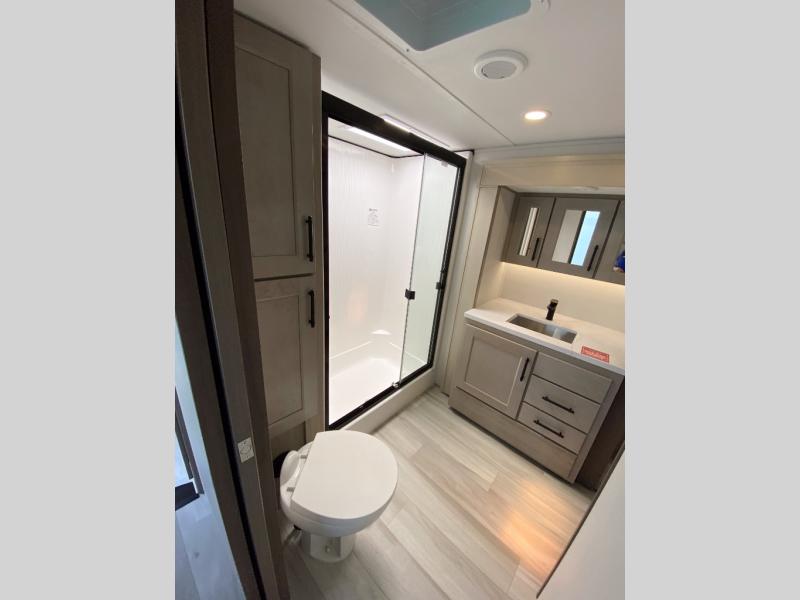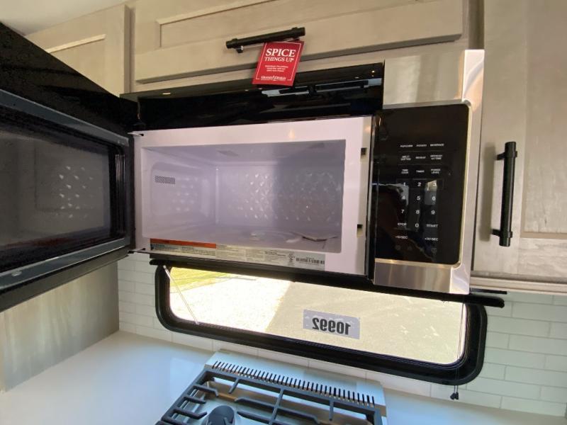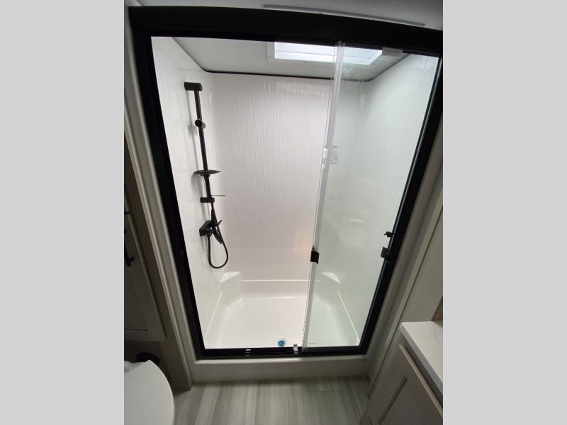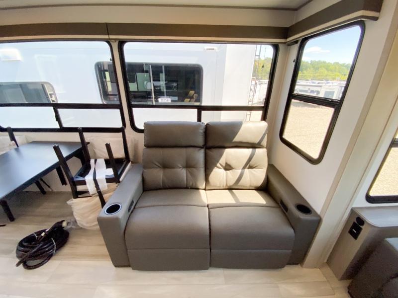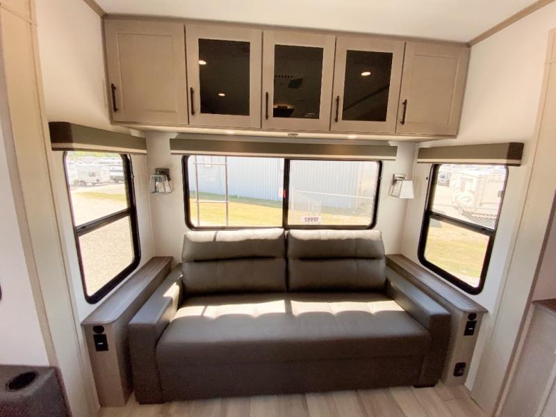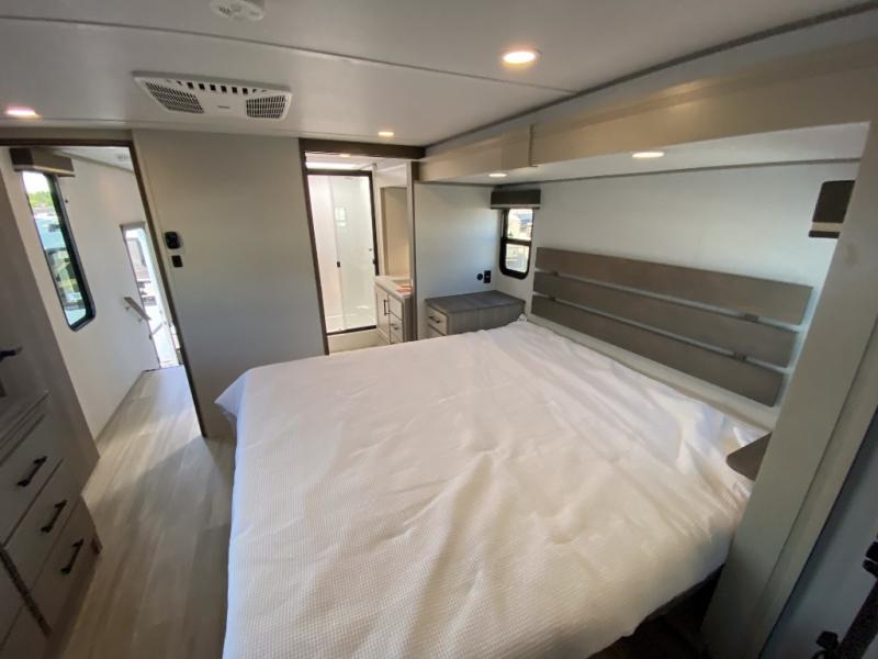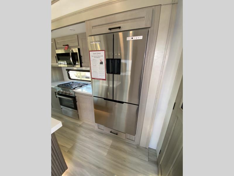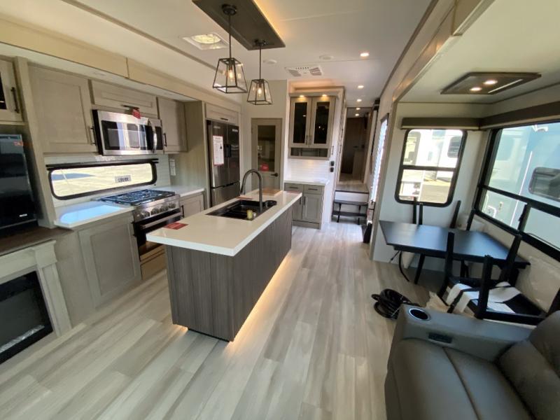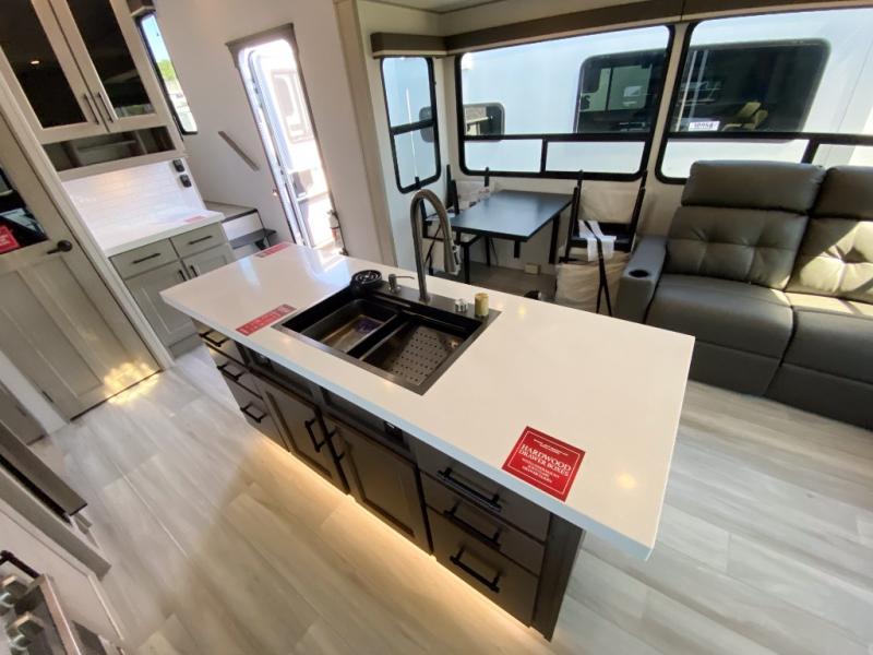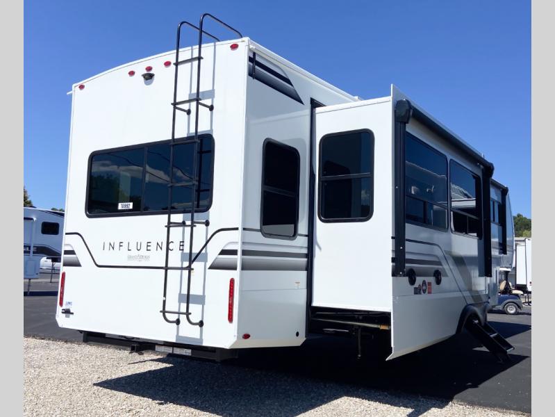 Any Grand Design Influence fifth wheel features five-sided aluminum cage construction with a walk-on roof and a fully enclosed underbelly with heated tanks and storage for all weather camping. For peace of mind, the MORryde CRE3000 Suspension system will provide safe and smooth towing, and the 101" widebody construction offers all the room you need and that is before multiple slides are fully engaged. You will appreciate the Keyed-Alike locks, slam-latch baggage doors with magnetic door catches, exterior security light, and SolidStep entry steps. On the inside, Congoleum flooring, premium roller shades for privacy, a hallway handrail for safety, and nightstands with USB ports to keep all of your electronics fully charged. You will also love the On Demand tankless water heater when showering, plus the added heat and ambiance from an electric fireplace, and so much more!